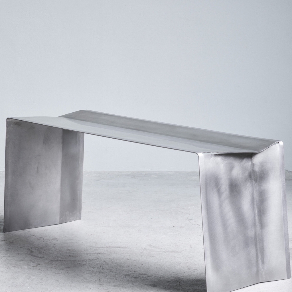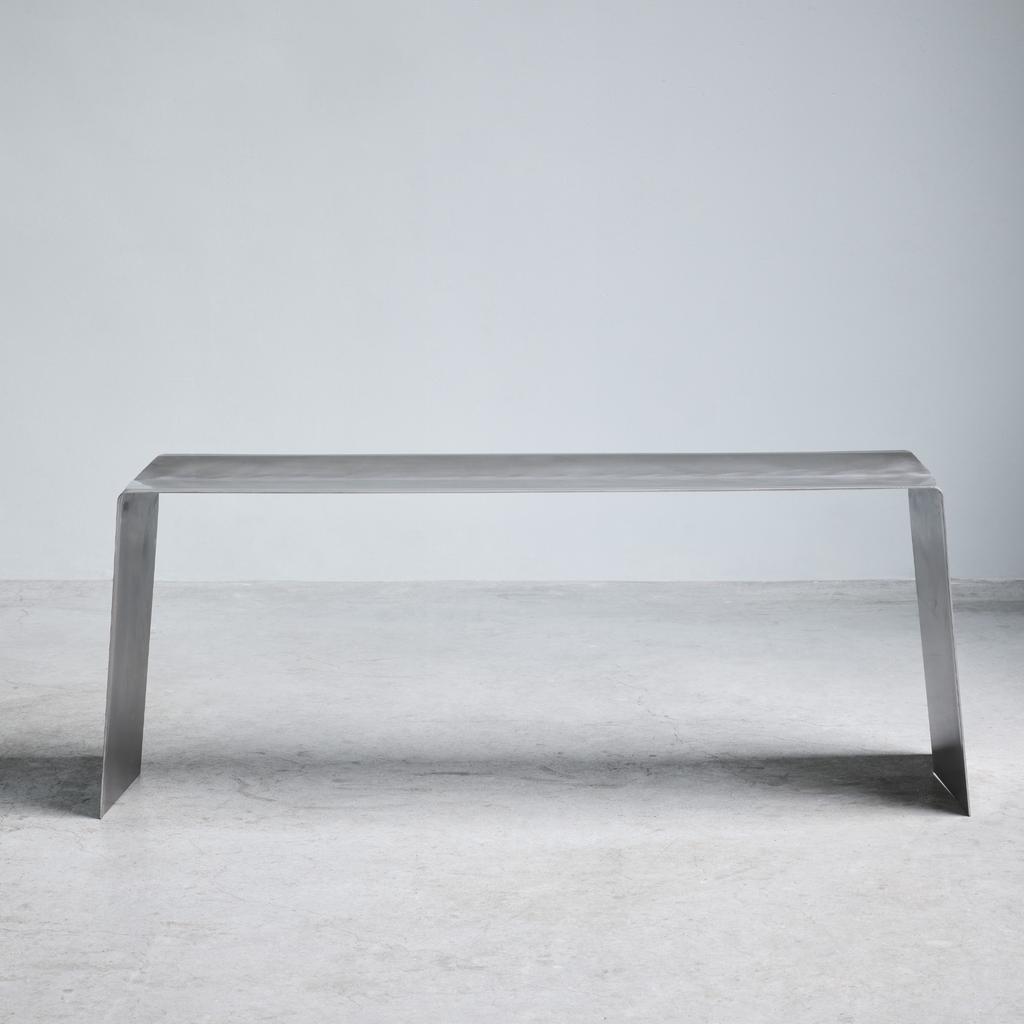 Camber Bench by Paul Coenen. The Camber bench originated from the idea of manufacturing a piece of furniture from a single piece of sheet metal. The inclining angle of the seat formed the basis for the rest of the design, with each cut and fold having the same 5 degree angle. Starting with a flat rectangle, two angular cuts are made. The first three folds are then made lengthwise by machine, after which the legs are finally bent into the right angle by hand.