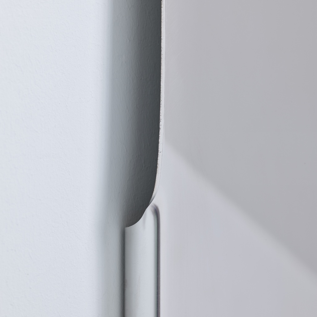 The Camber stool originated from the idea of manufacturing a piece of furniture from a single piece of sheet metal. The inclining angle of the seat formed the basis for the rest of the design, with each cut and fold having the same 5 degree angle. Starting with a flat rectangle, two angular cuts are made. The first three folds are then made lengthwise by machine, after which the legs are finally bent into the right angle by hand.