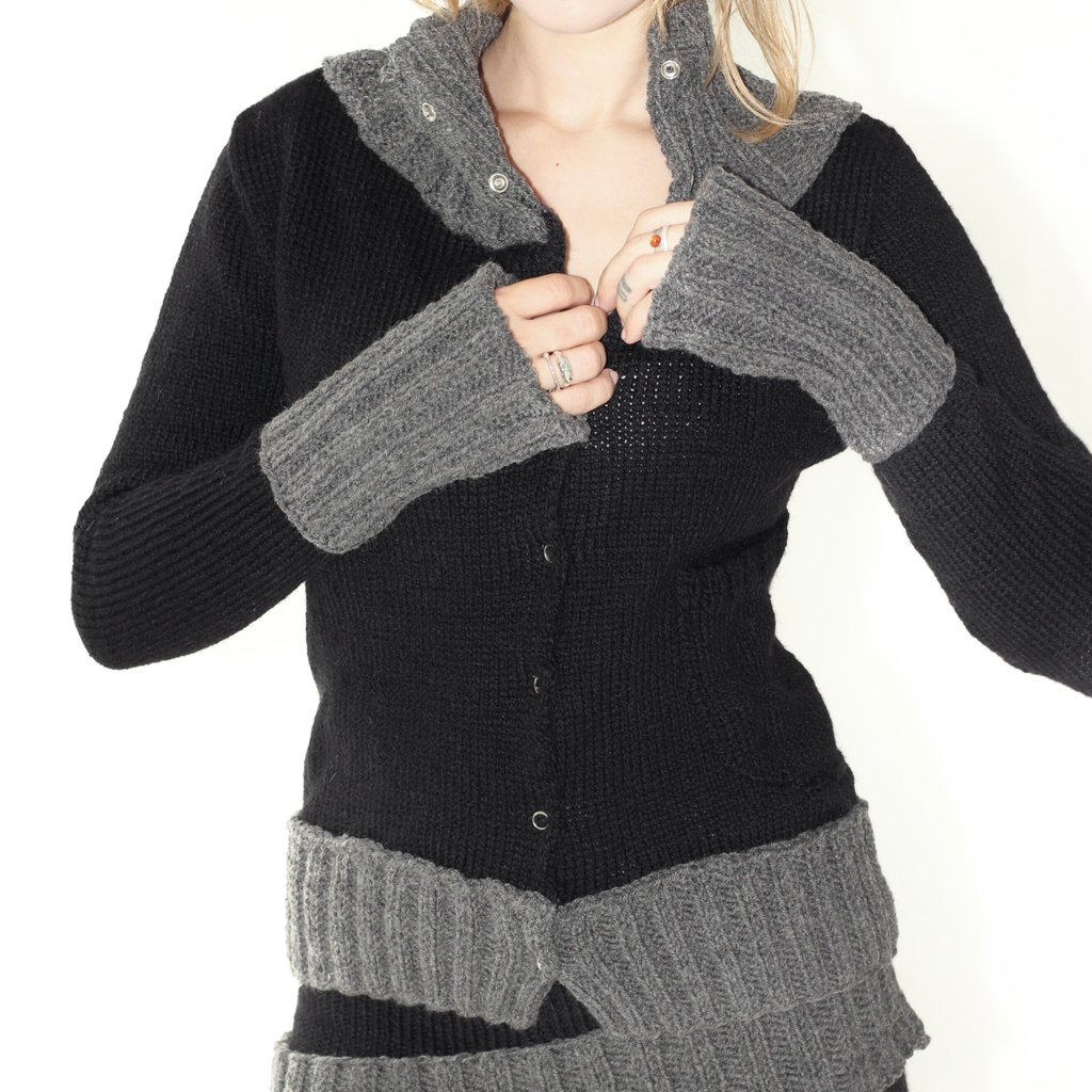 a semi-fitted silhouette, asymmetrical shape,extended sleeve and front snap closures, this cardigan blends vintage charm with a modern grunge edge. Some elements are hand-knitted, complete with intentionally exposed seams that reflect the brand's signature aesthetic. A convenient pocket adds function to form.