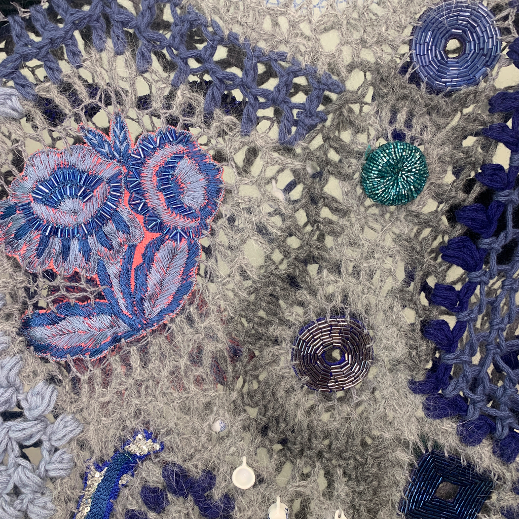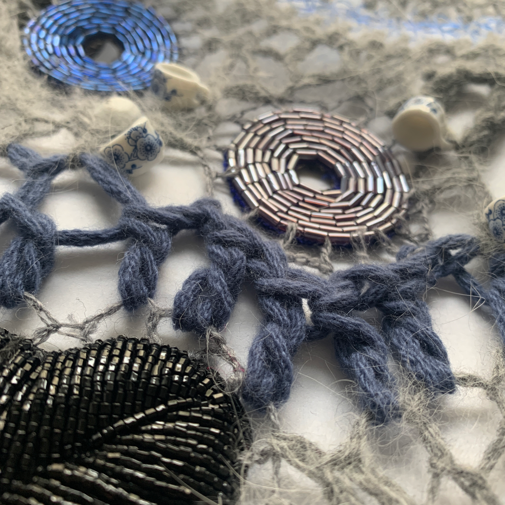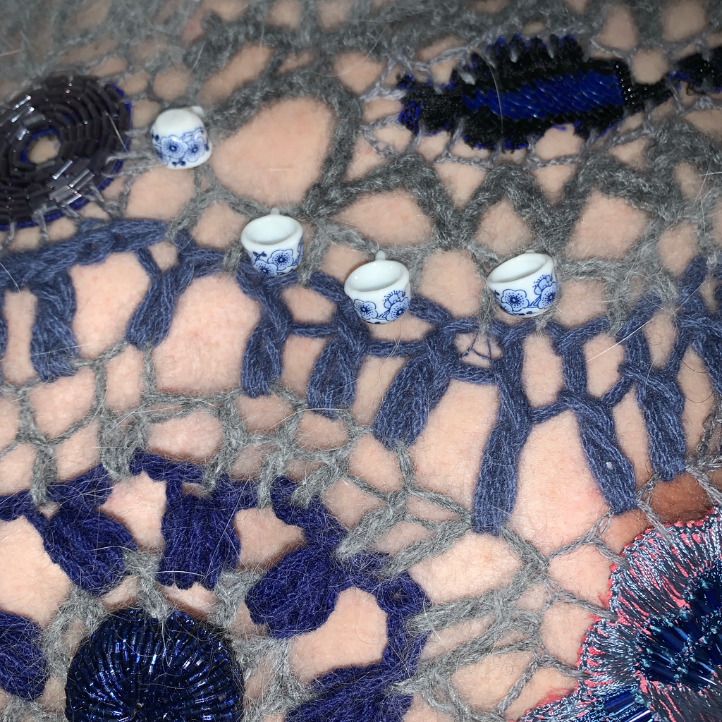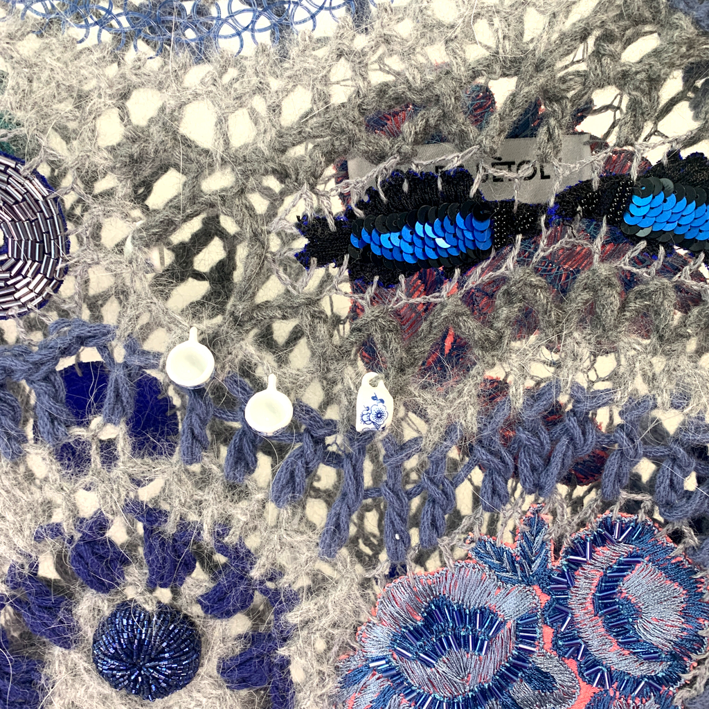 Hand embroidered with glass beads, sequins, and porcelain beadsFully hand made