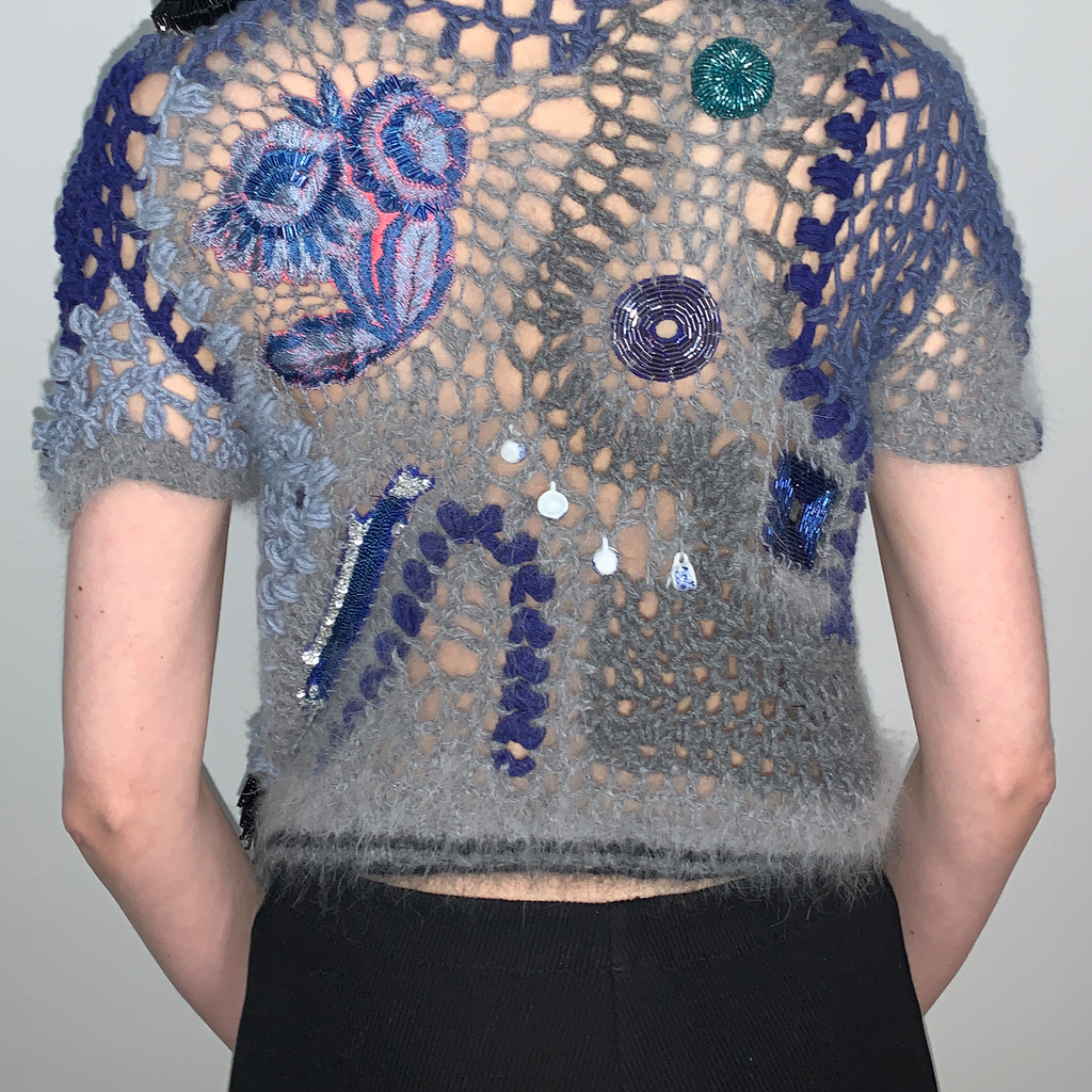 Cropped knitted , embroidered and crocheted top