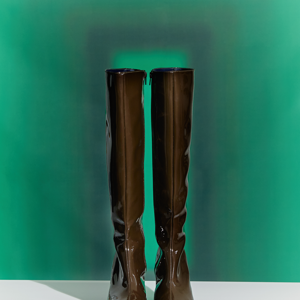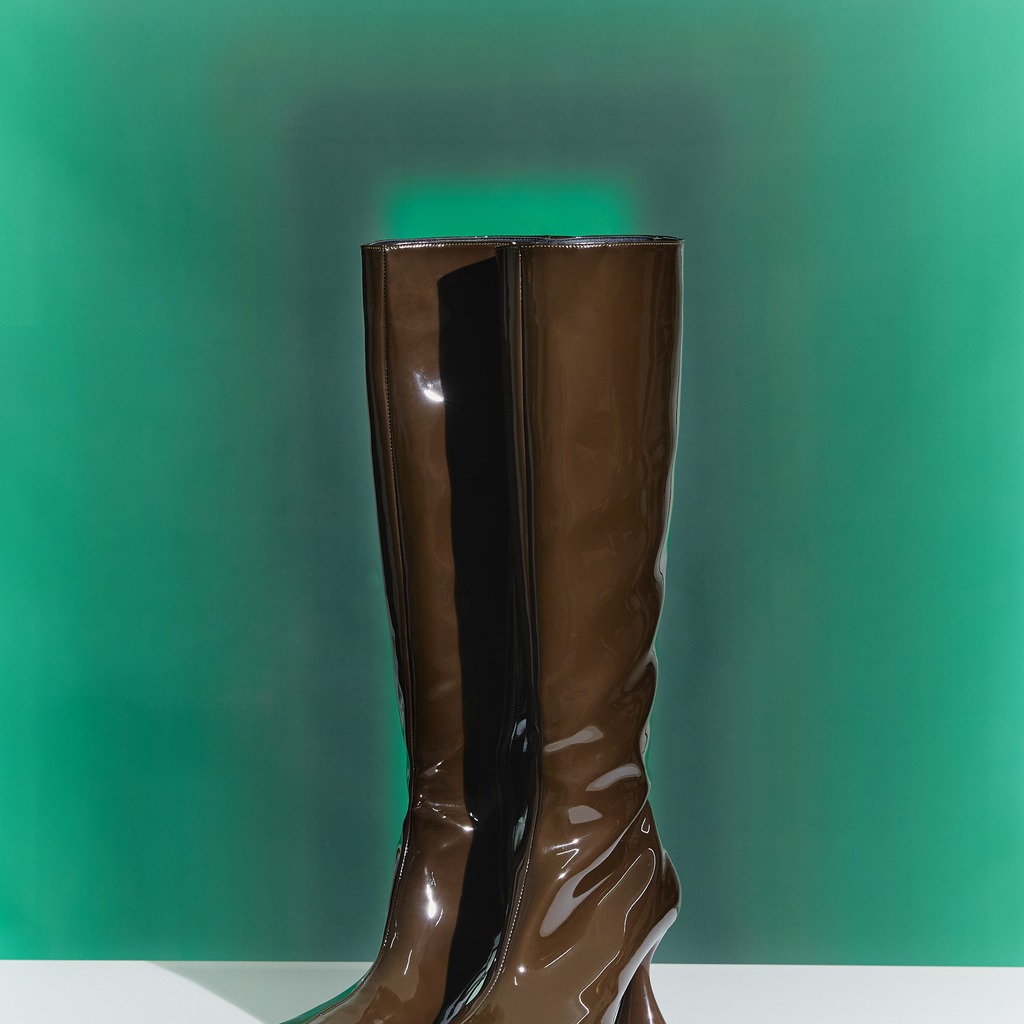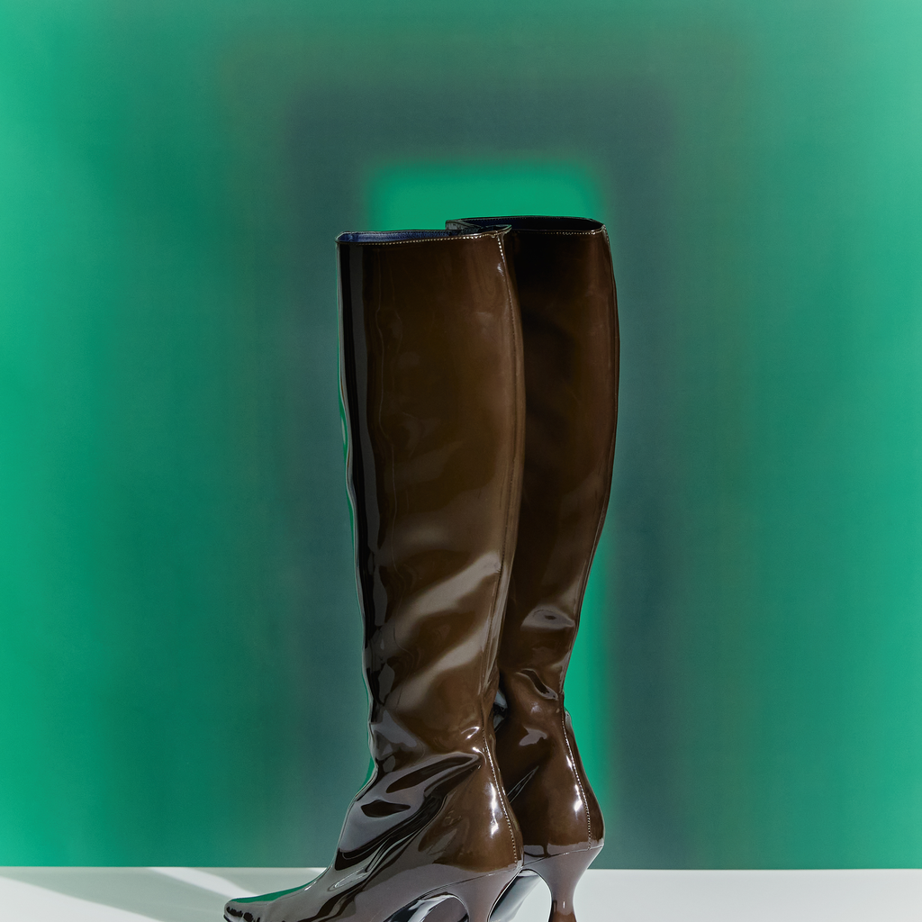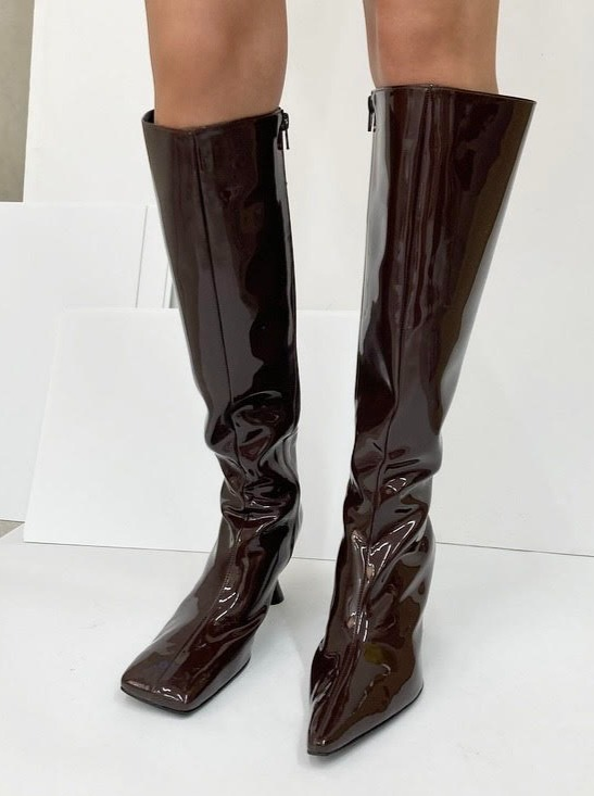 Tri-quare boots, introduced as an extension of the 2021 In between collection. Knee-high TRI-QUARE boots in cedar brown. Square toe on the right foot and pointed toe on the left foot. Zip closure at inner side with YKK hardware. Leather lining. Logo-embossed rubber sole