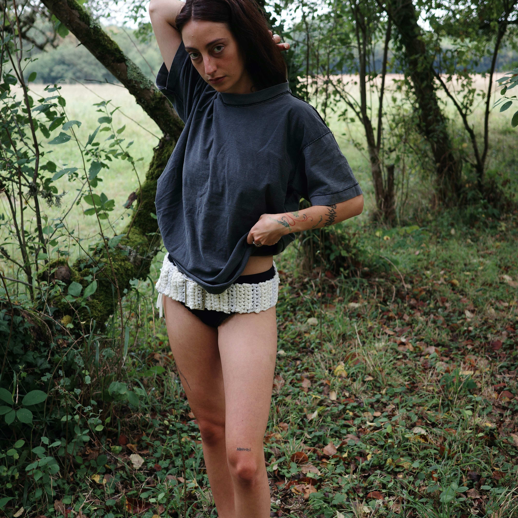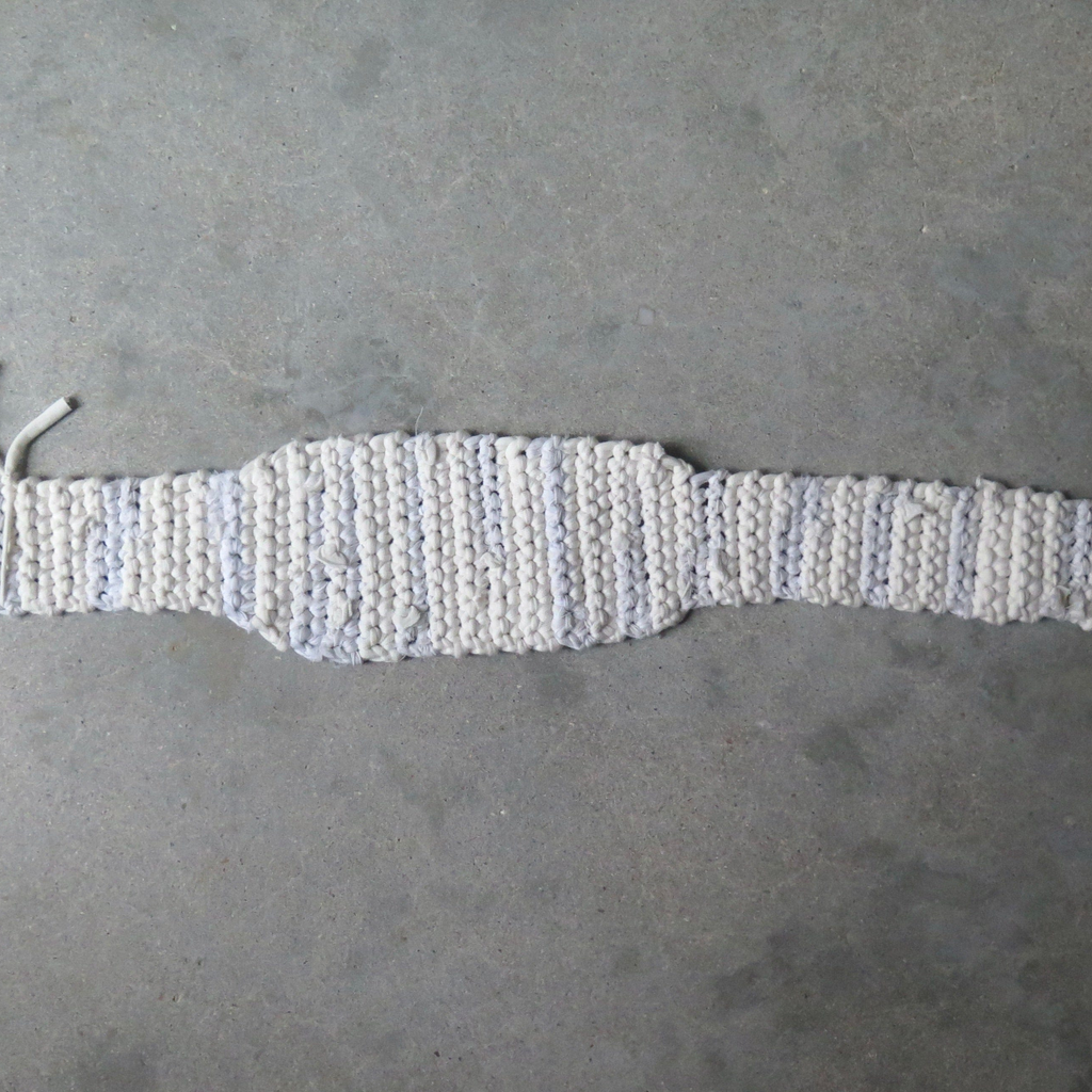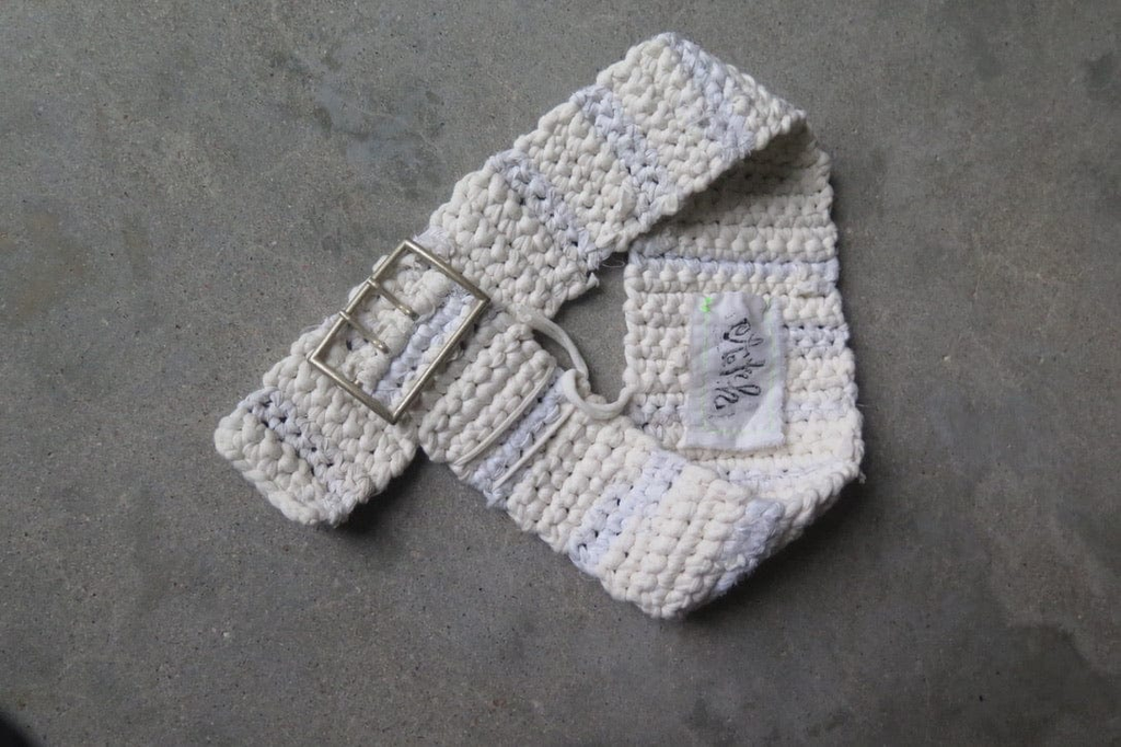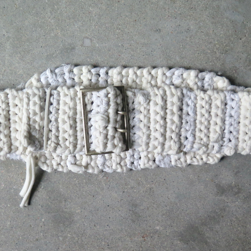 Handmade crochet belt made from two different fabric scraps. Due to the crochet and the mixed material, the belt is very flexible and elastic.