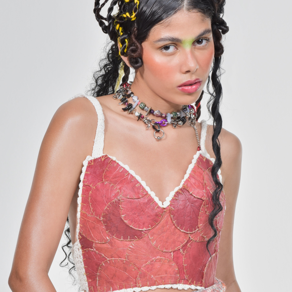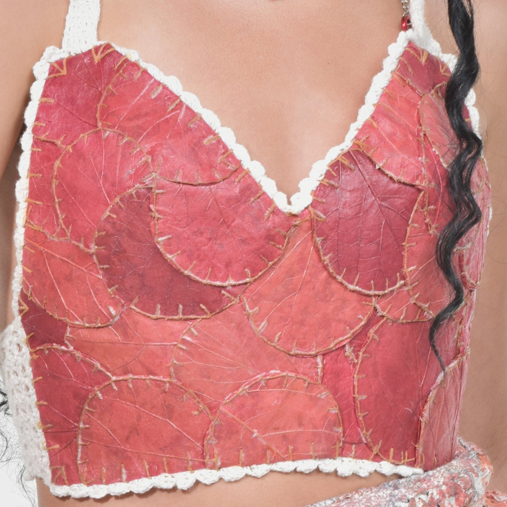 Handmade crochet skirt with natural Cerrado leaves and organic cotton. Garment has adjustable side tie closure.