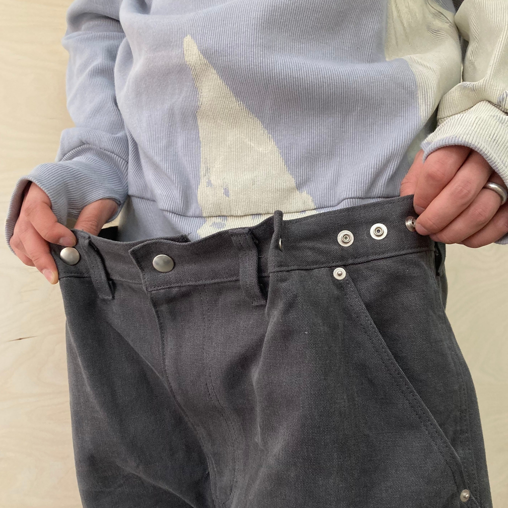 Pants with adjustable waist size, adjustable hem size & YKK Snap Buttons.