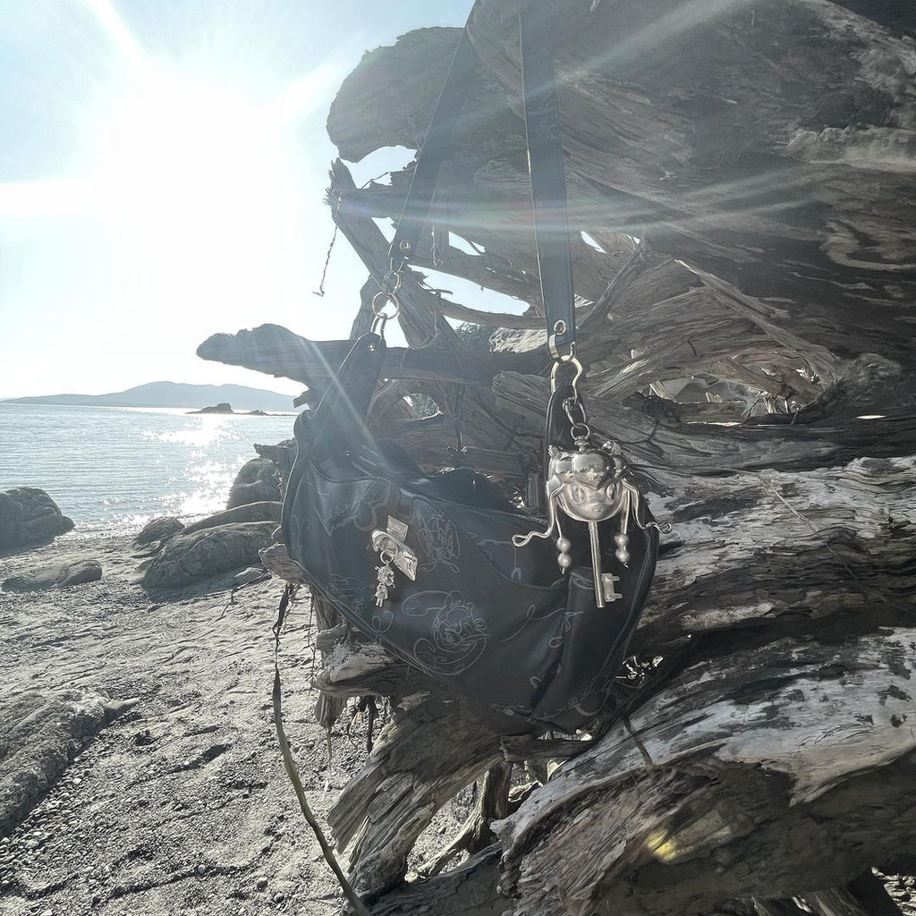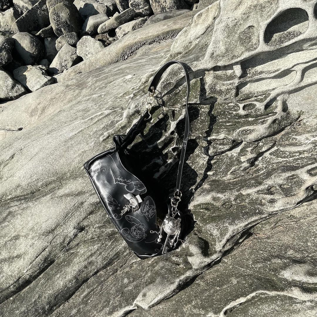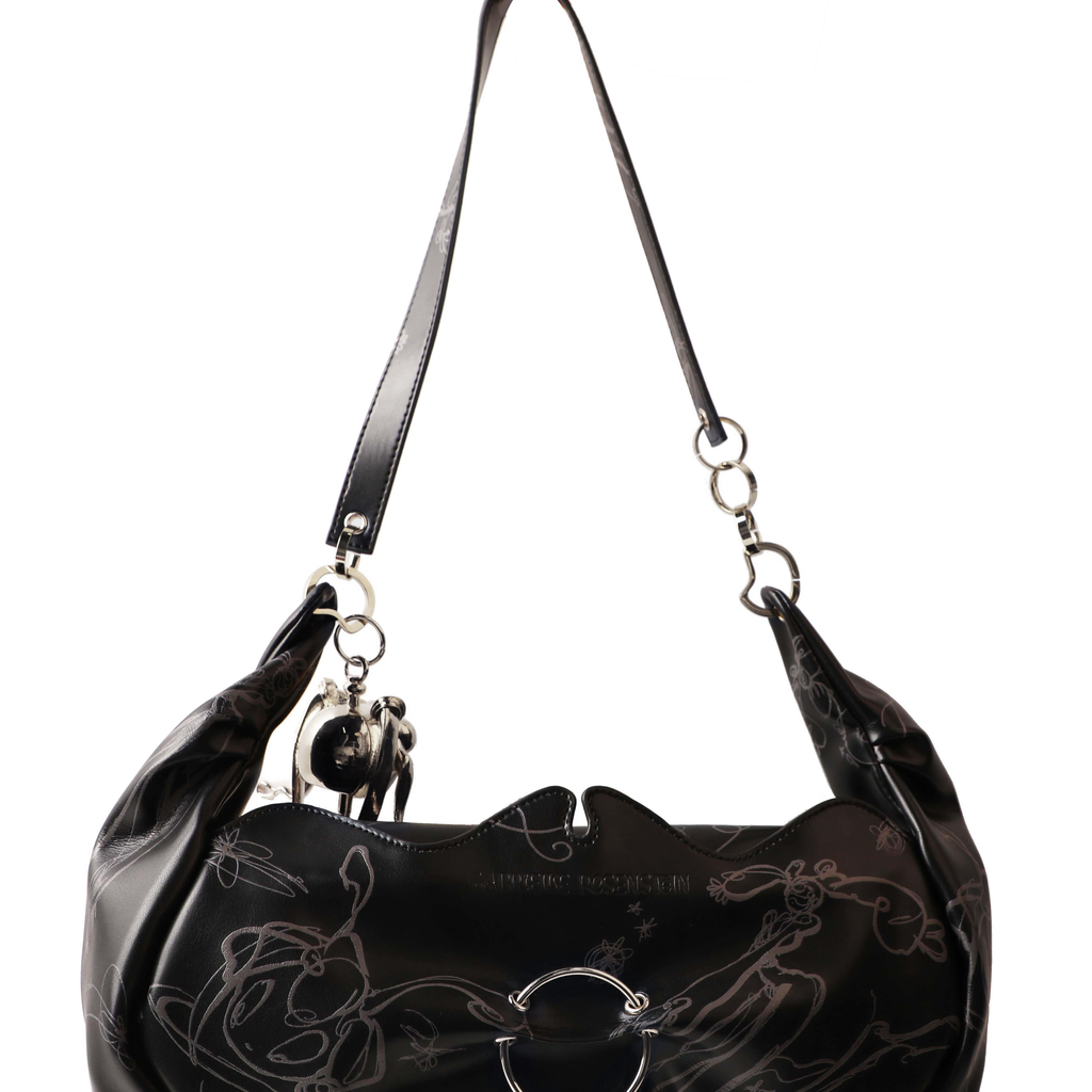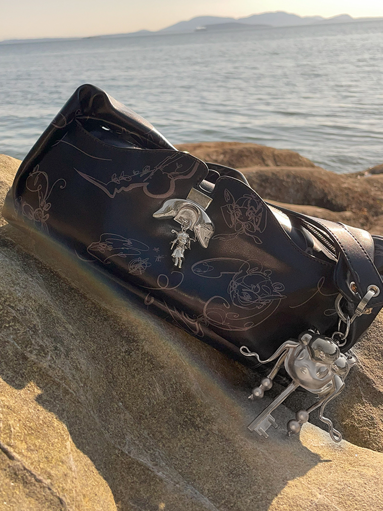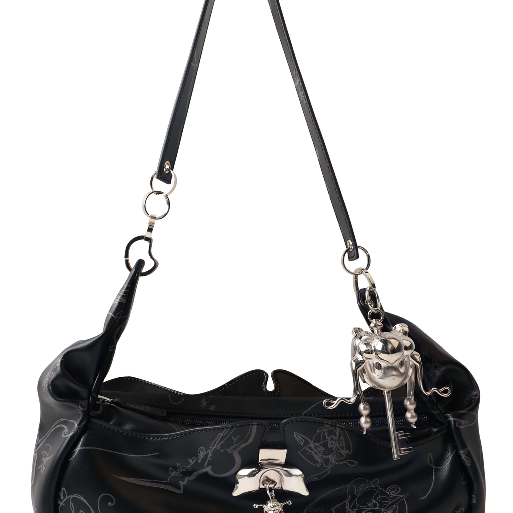 Fixed asymmetrical shoulder strapSilver-tone hardware: Key & Lil charm characters, abstract accent on front, large ring piercing on back, accent ''heel'' hardware on sides