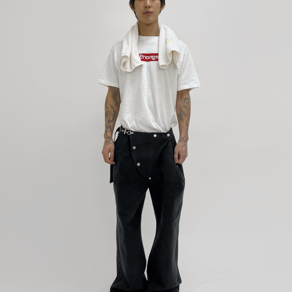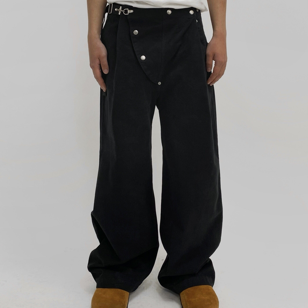 Pants with hidden pocket details, front zipper pockets, cigarette pockets & knee pockets.