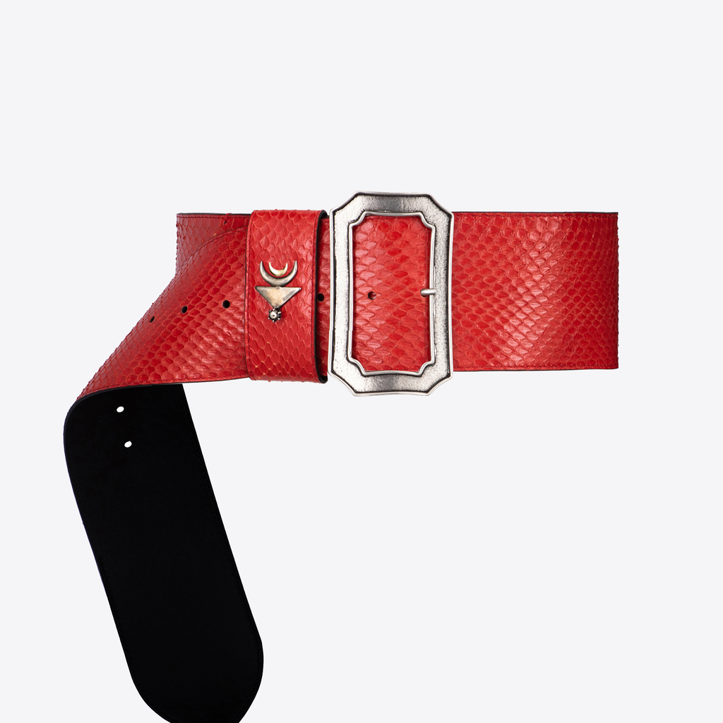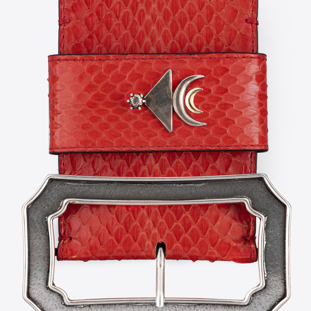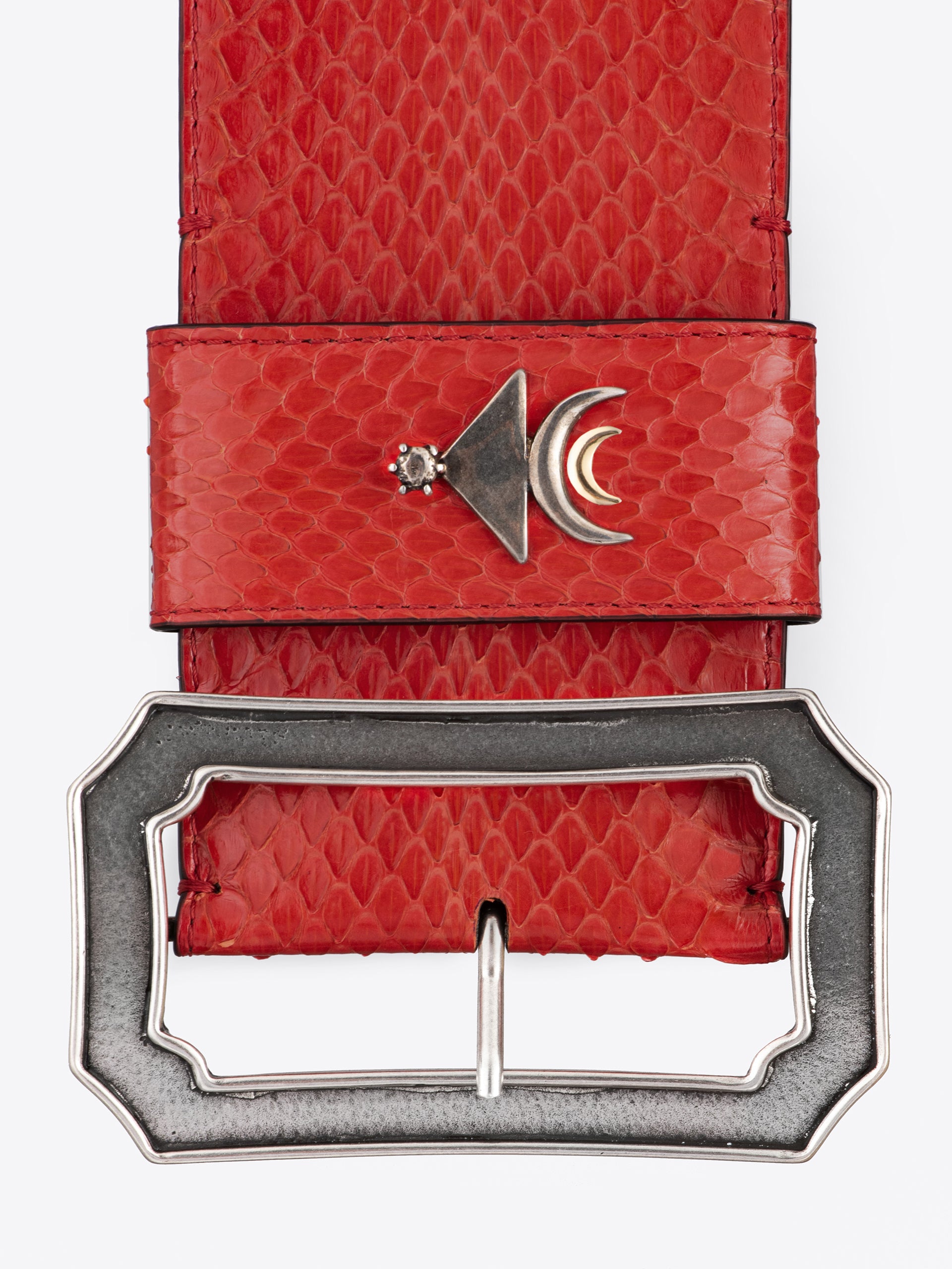 EXTRA LONG RED SNAKESKIN BELT WITH OVERSIZE PIRATE BUCKLE AND DOUBLE MOON SIGNATURE LOGO. ADJUSTABLE FIT.