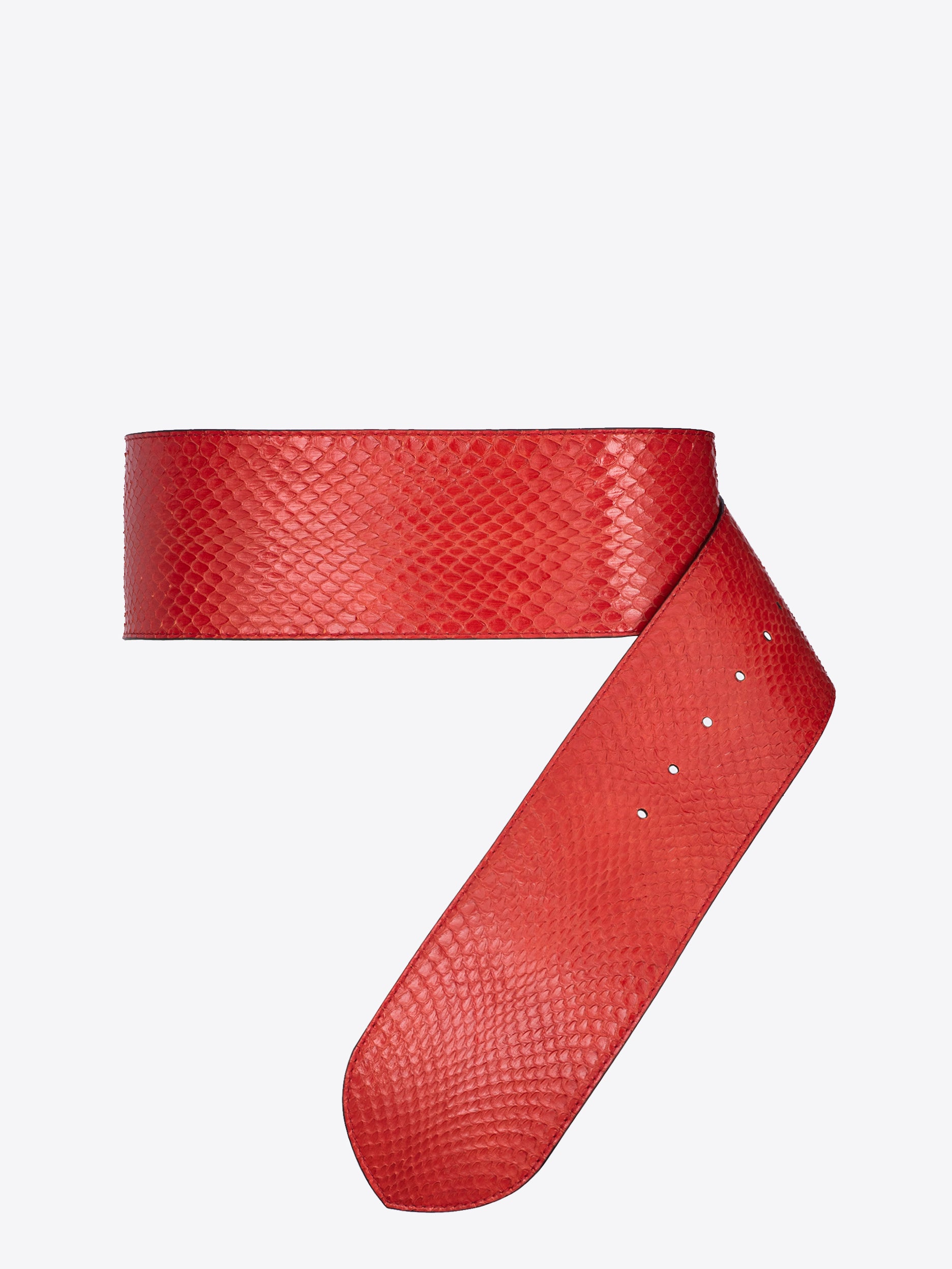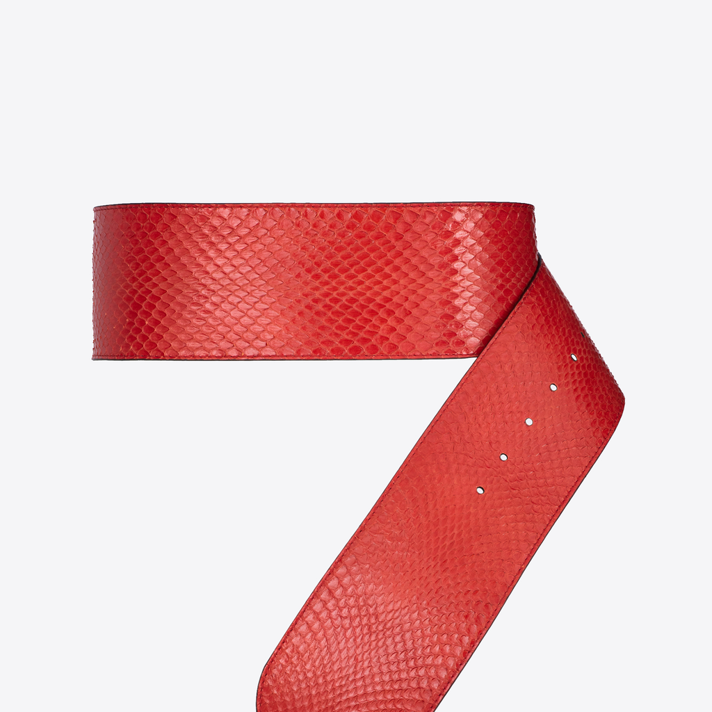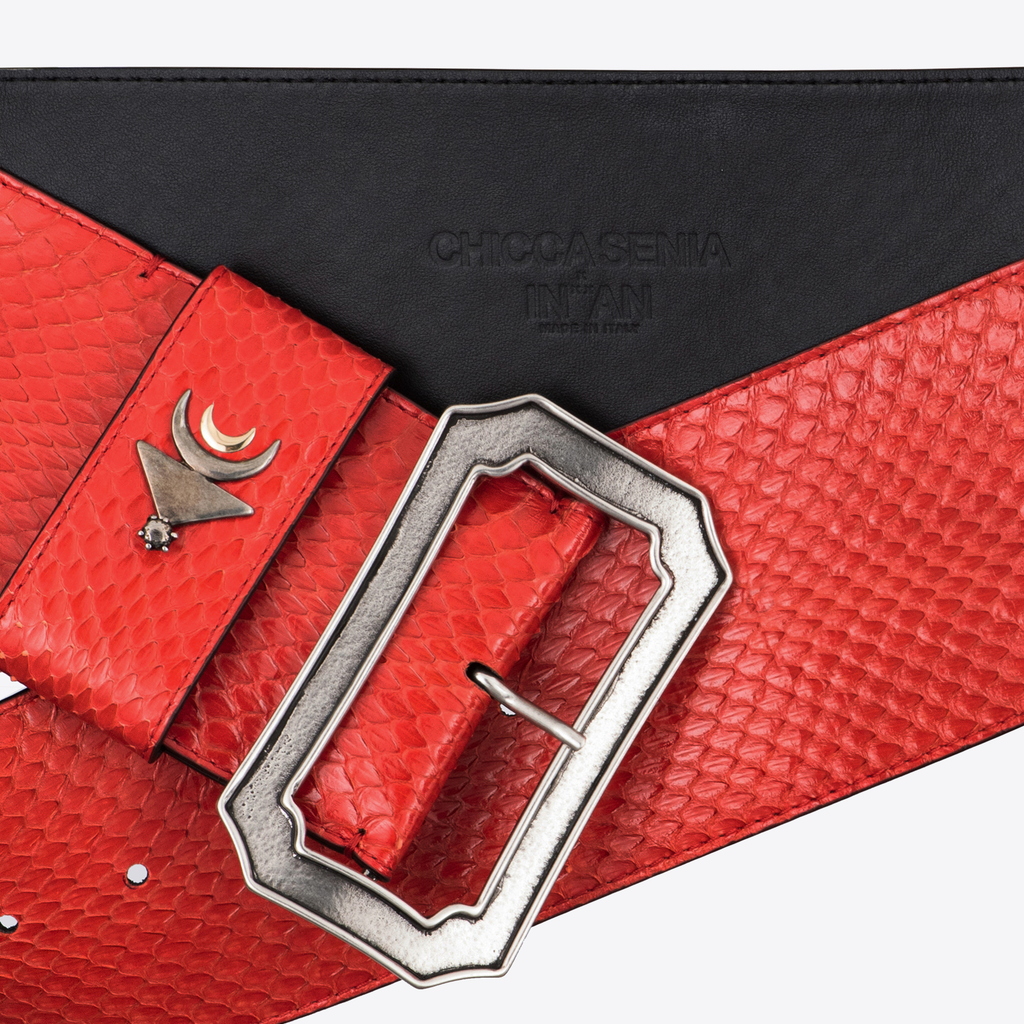 EXTRA LONG RED SNAKESKIN BELT WITH OVERSIZE PIRATE BUCKLE AND DOUBLE MOON SIGNATURE LOGO. ADJUSTABLE FIT.