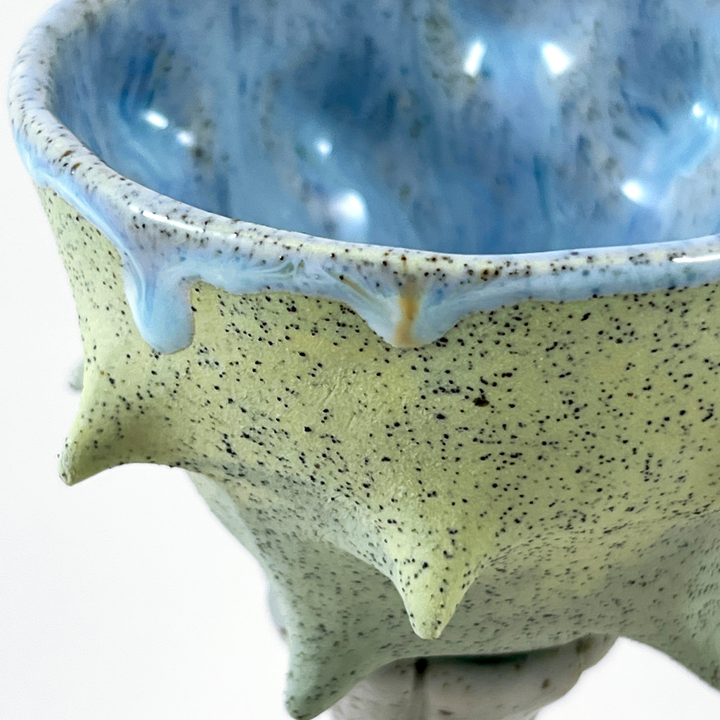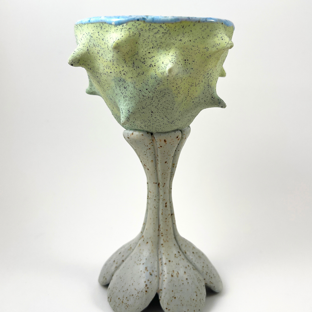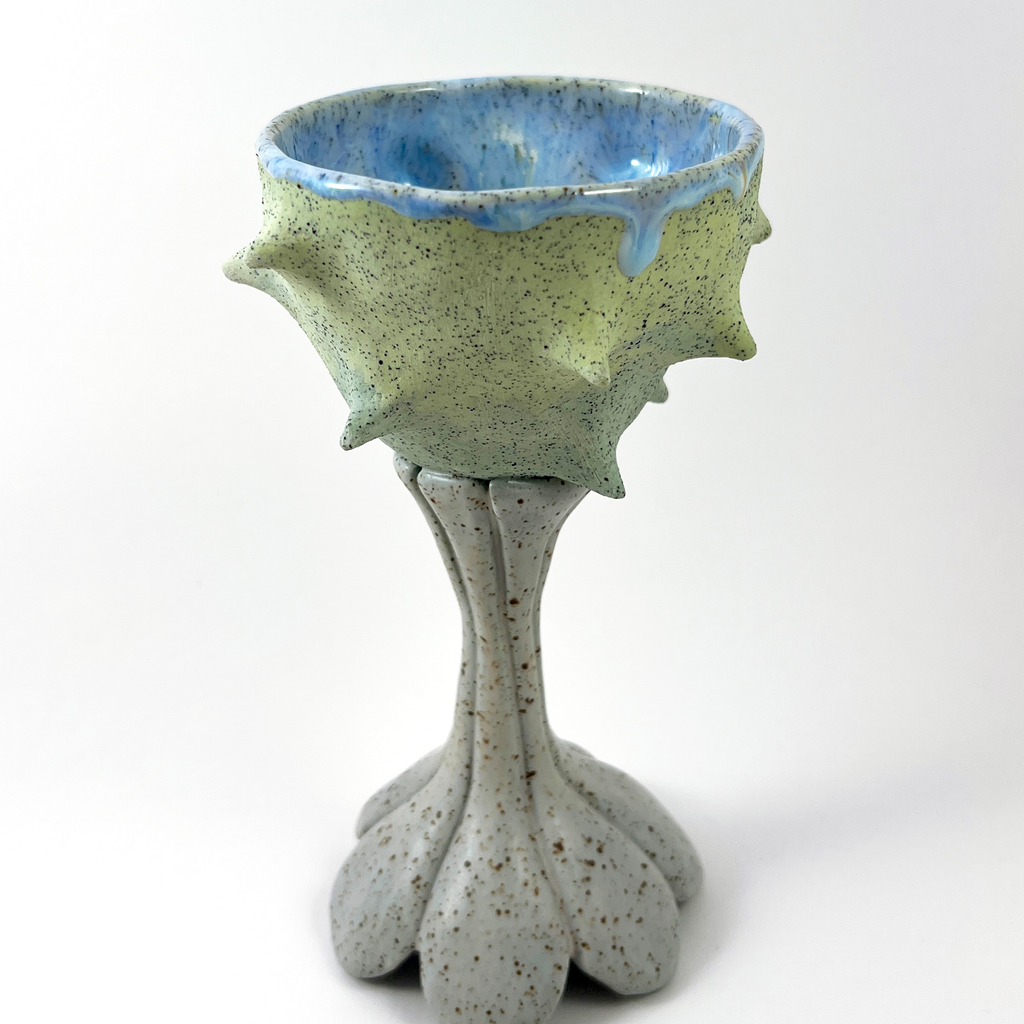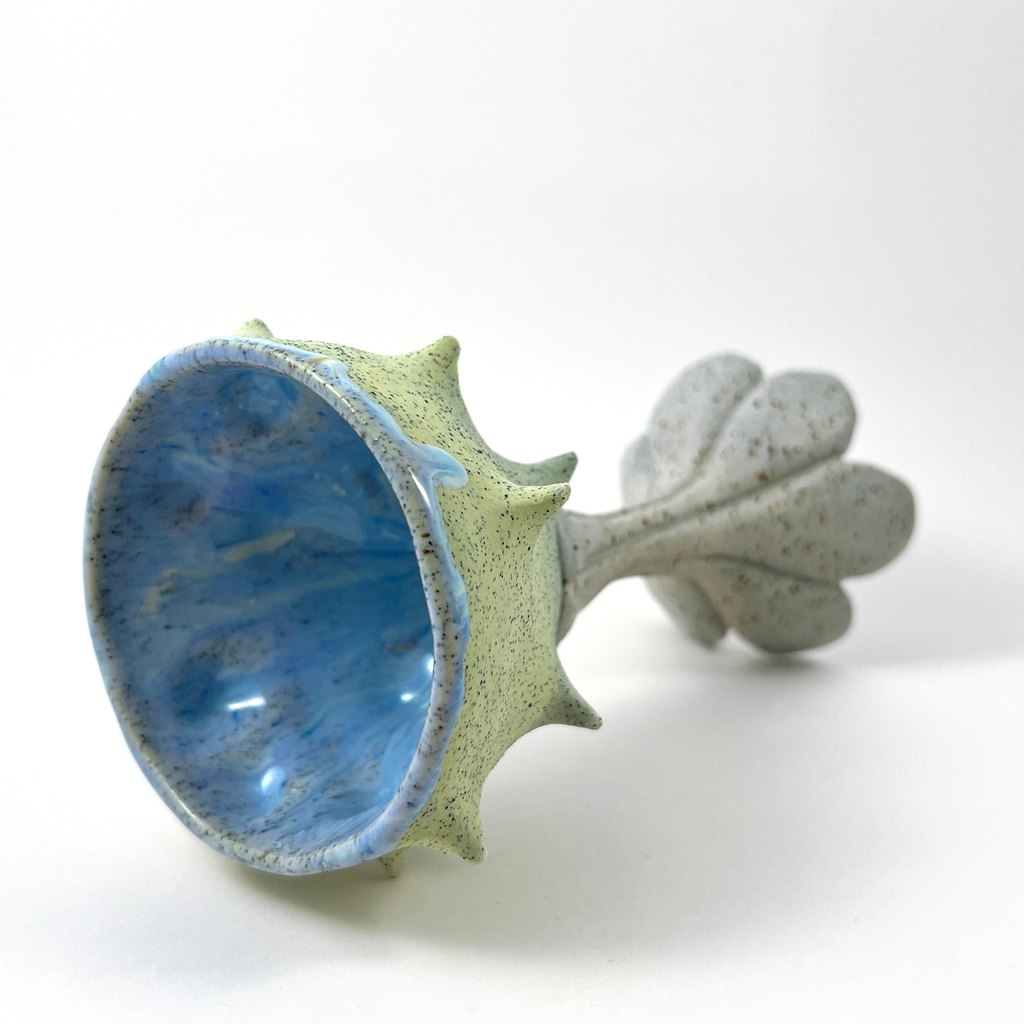 Speckled spike goblet with carved flower base. Holds 3.5 oz. Food safe, hand wash only.