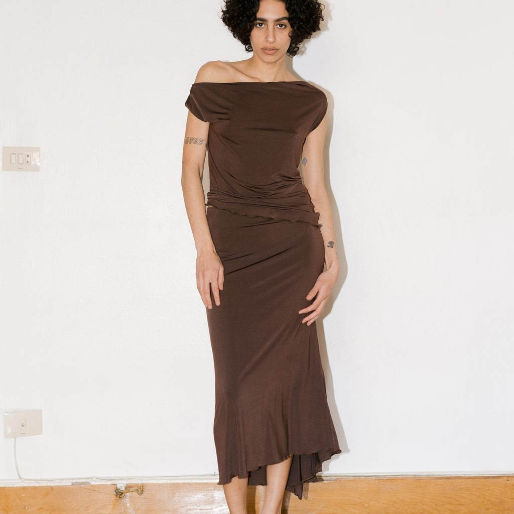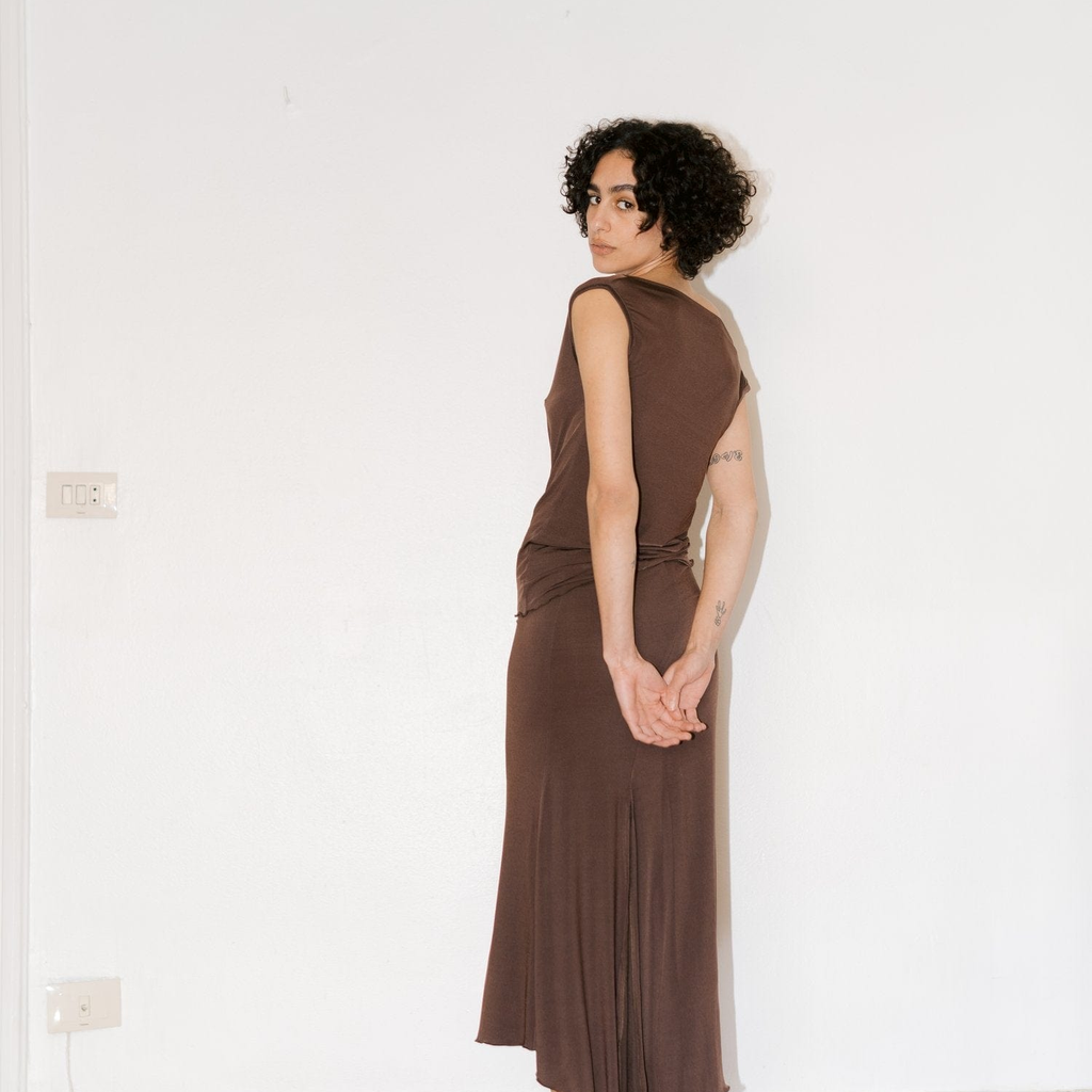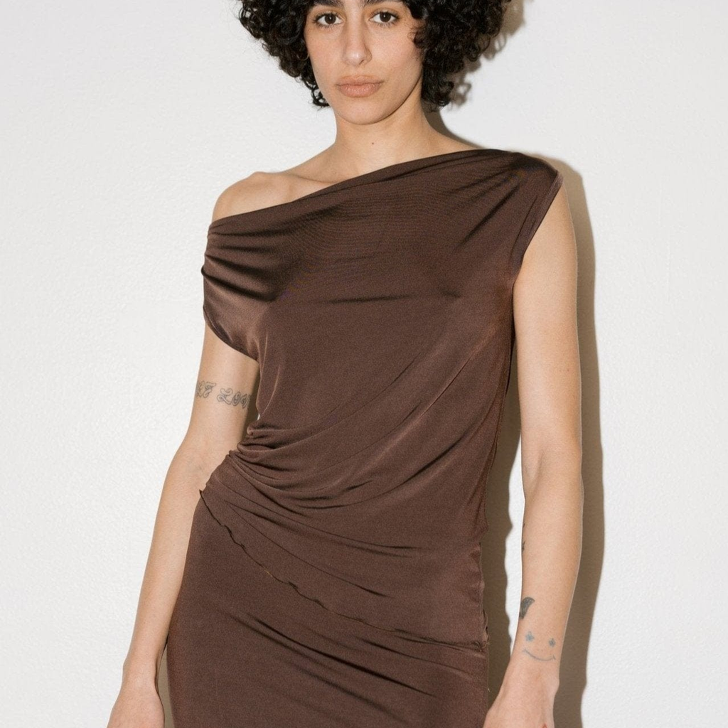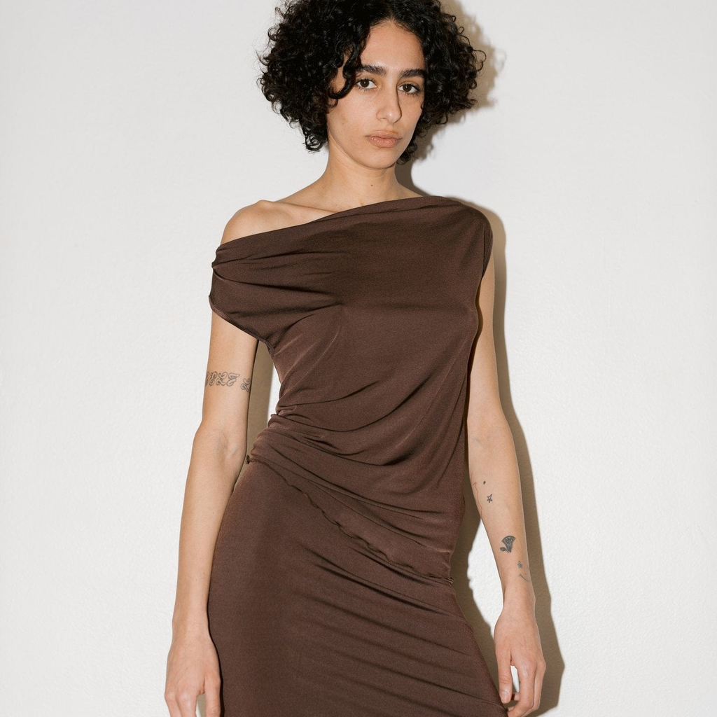 This top sits off the shoulders giving a very timeless look, hugging the body in all the most flattering ways. The back is closed with a diagonal seam leading to a slit at the hem to finish the dress with a really sexy look.