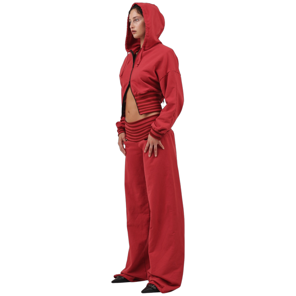 Cotton Pant, custom dyed, custom screen print on ribbing. Two front slits. Waistband can be folded down for low rise. Raw hem. Wide leg.