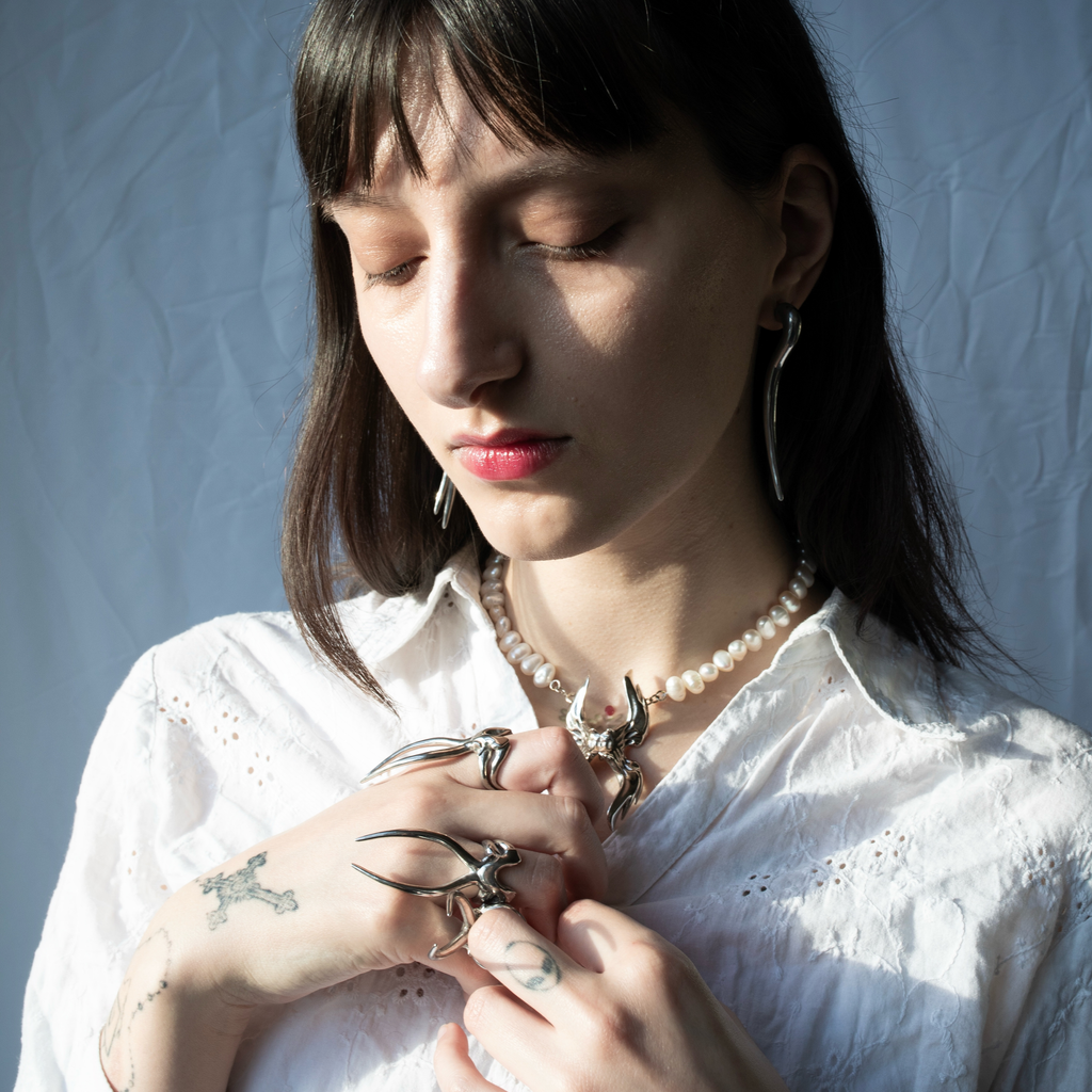AGOSTON BALAZS is a Budapest-based multidisciplinary artist and jeweller, who works in the intersection of art and technology. Realising his sculptures into jewellery and unique objects, he works primarily with rhodium-plated brass, 3D printed resin, PLA, aluminium and unique alloys. Each piece is crafted, 3d printed and assembled by hand in his studio.