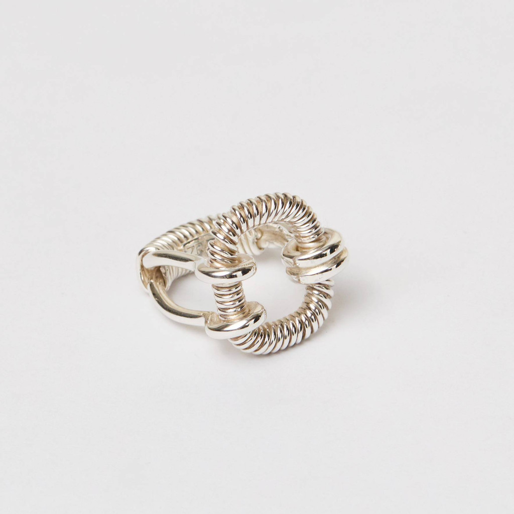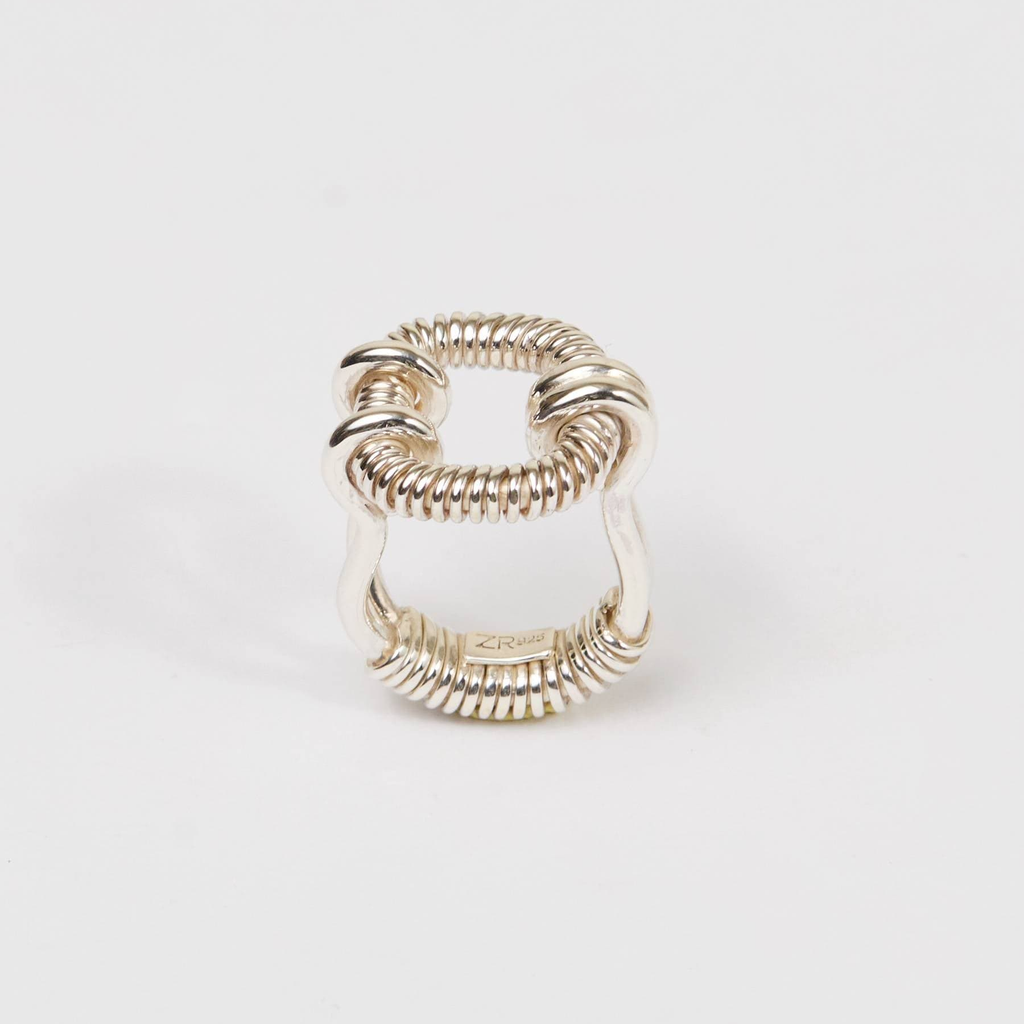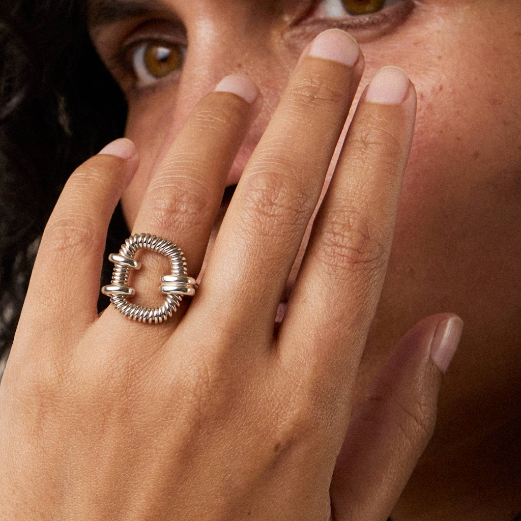 The Coil Hatch Ring is a reimagining of our classic Hatch Ring, featuring the signature split band that wraps around and secures the face of the ring. The oblong front is hand-wrapped with coiled sterling silver wire, creating a rich texture that enhances its sculptural form. Handmade in-house at our studio, this piece plays with movement and dimension, offering a tactile design that feels both organic and architectural.