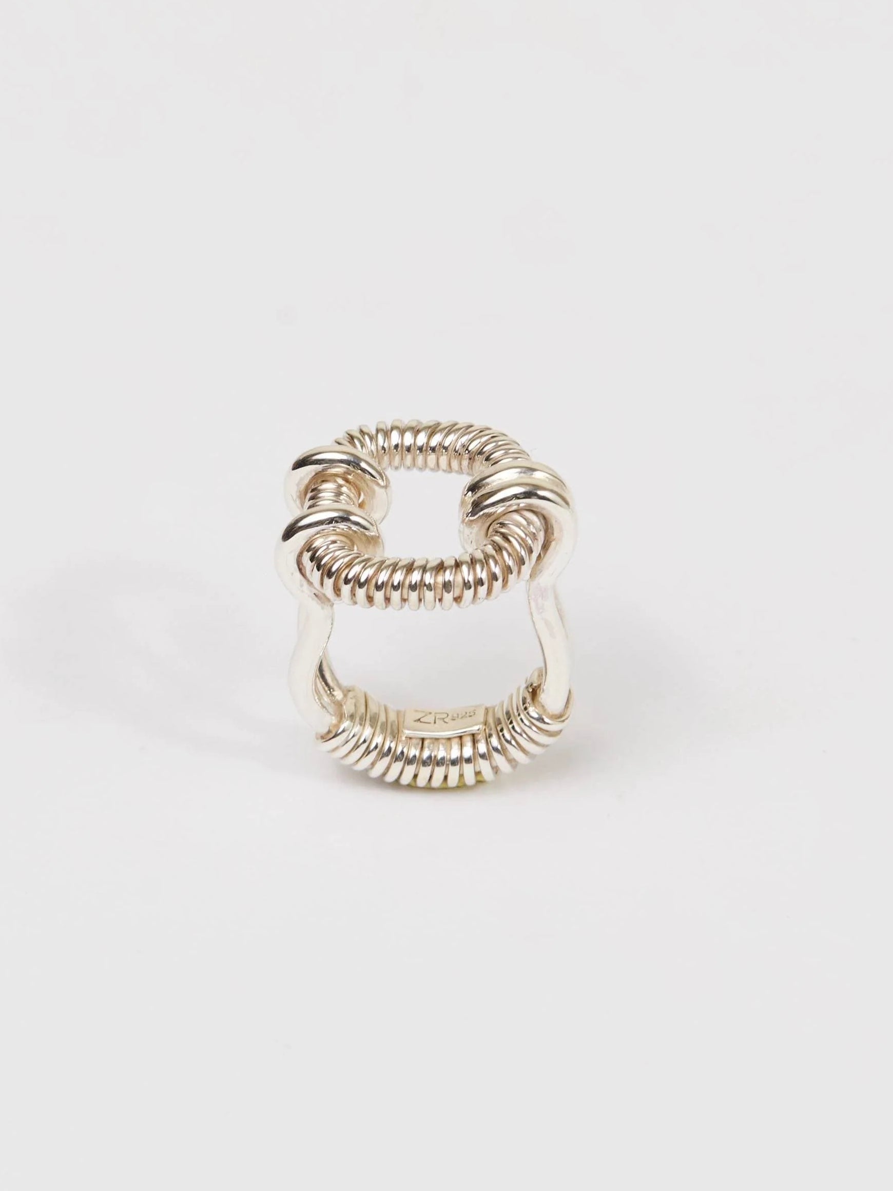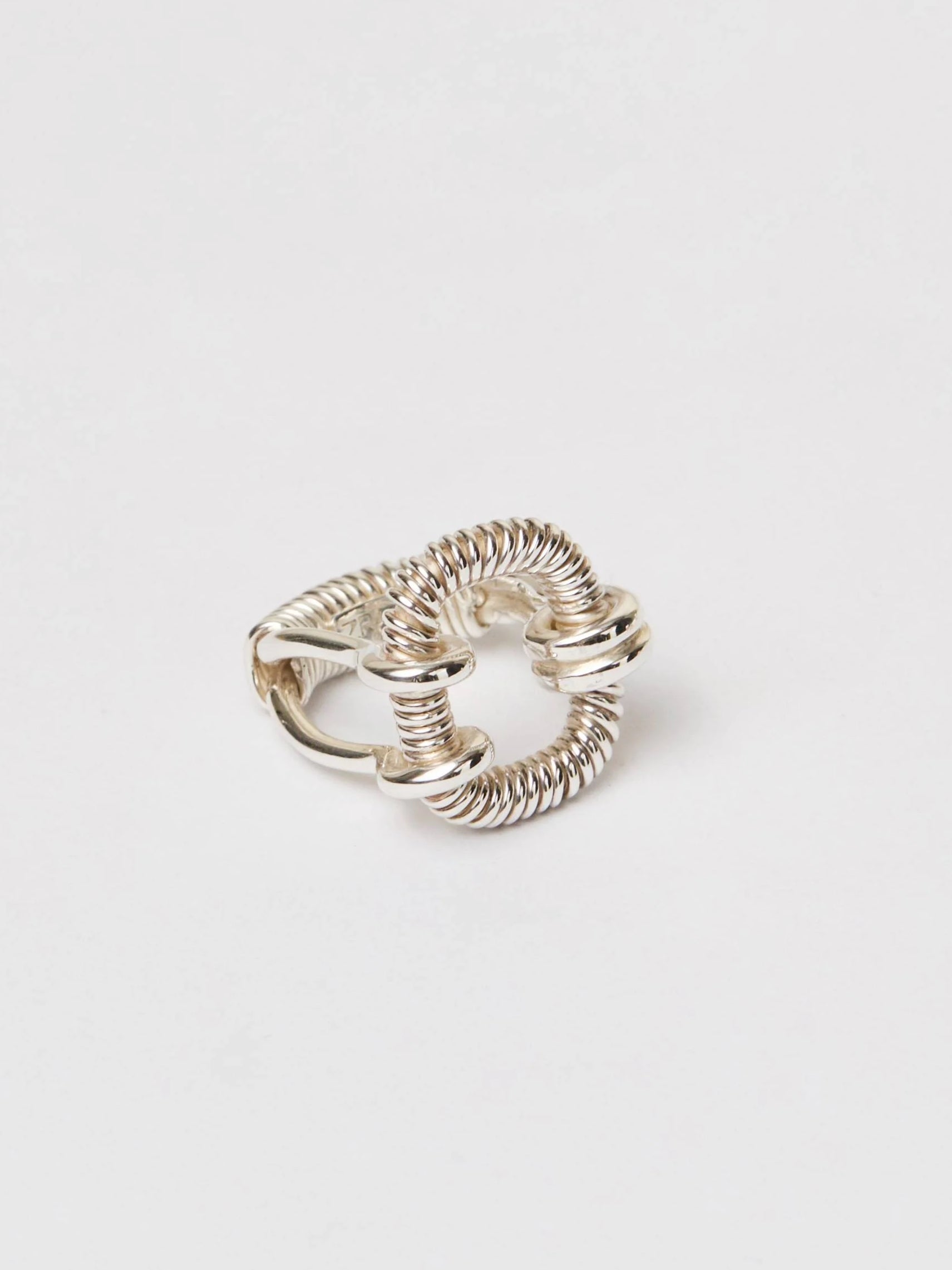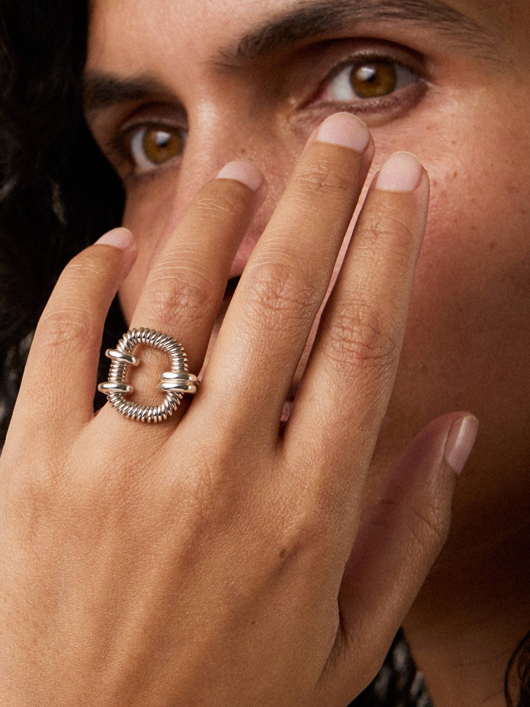 The coil hatch ring is a reimagining of our classic hatch ring, featuring the signature split band that wraps around and secures the face of the ring. The oblong front is hand-wrapped with coiled sterling silver wire, creating a rich texture that enhances its sculptural form. Handmade in-house at our studio, this piece plays with movement and dimension, offering a tactile design that feels both organic and architectural. Its bold composition and detailed craftsmanship make it a distinctive addition to any collection, effortlessly blending structure with fluidity.