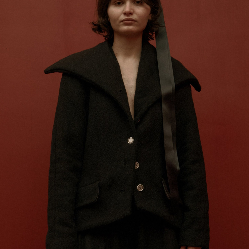 Black jacket made of vintage wool, supplemented with antique buttons.