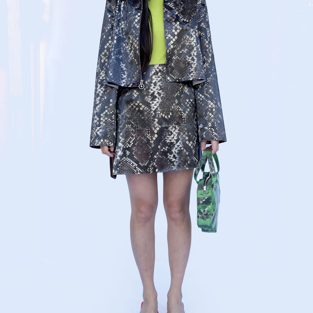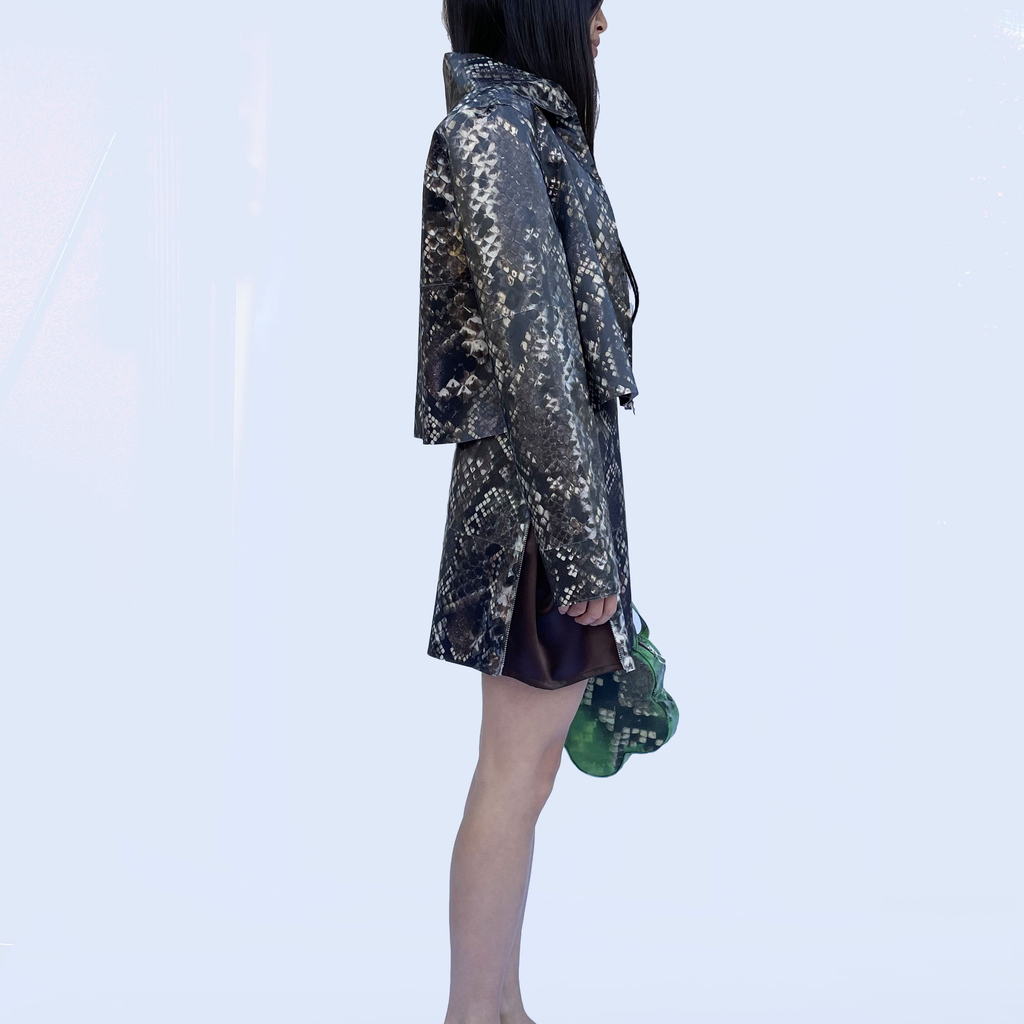 Made from a waterproof rubber, deadstock silk lining and Riri zip. Lightweight but sturdy.