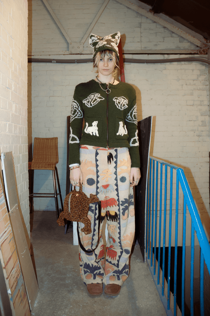 Rosie Evans is the eponymous ‘High Fantasy’ luxury fashion label creating one-off and small runs of anachronistic historically-inspired fashion, following the ethical practice of upcycling old textiles and materials. Rosie works solely using ‘Fabrics with a past’. 1950s hand-embroidered tablecloths, old silk curtains and patchwork scrap fabric make up the bulk of her collections. As well as working to save fabric waste, Rosie also collects plastic fruit packaging tape from the Cardiff food market to use as boning for her corsets and dresses.