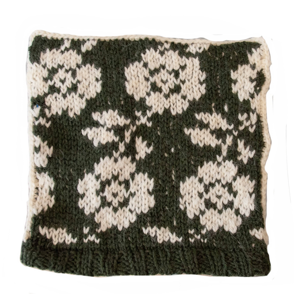 Made from 100% British super wash wool, the Constance hat is a floral-patterned hand-knit hat in the classic Rosie Evans floppy square style. The hat has an an inverted colourway on the reverse side. Finished with a crochet edge and hand-knit rib.