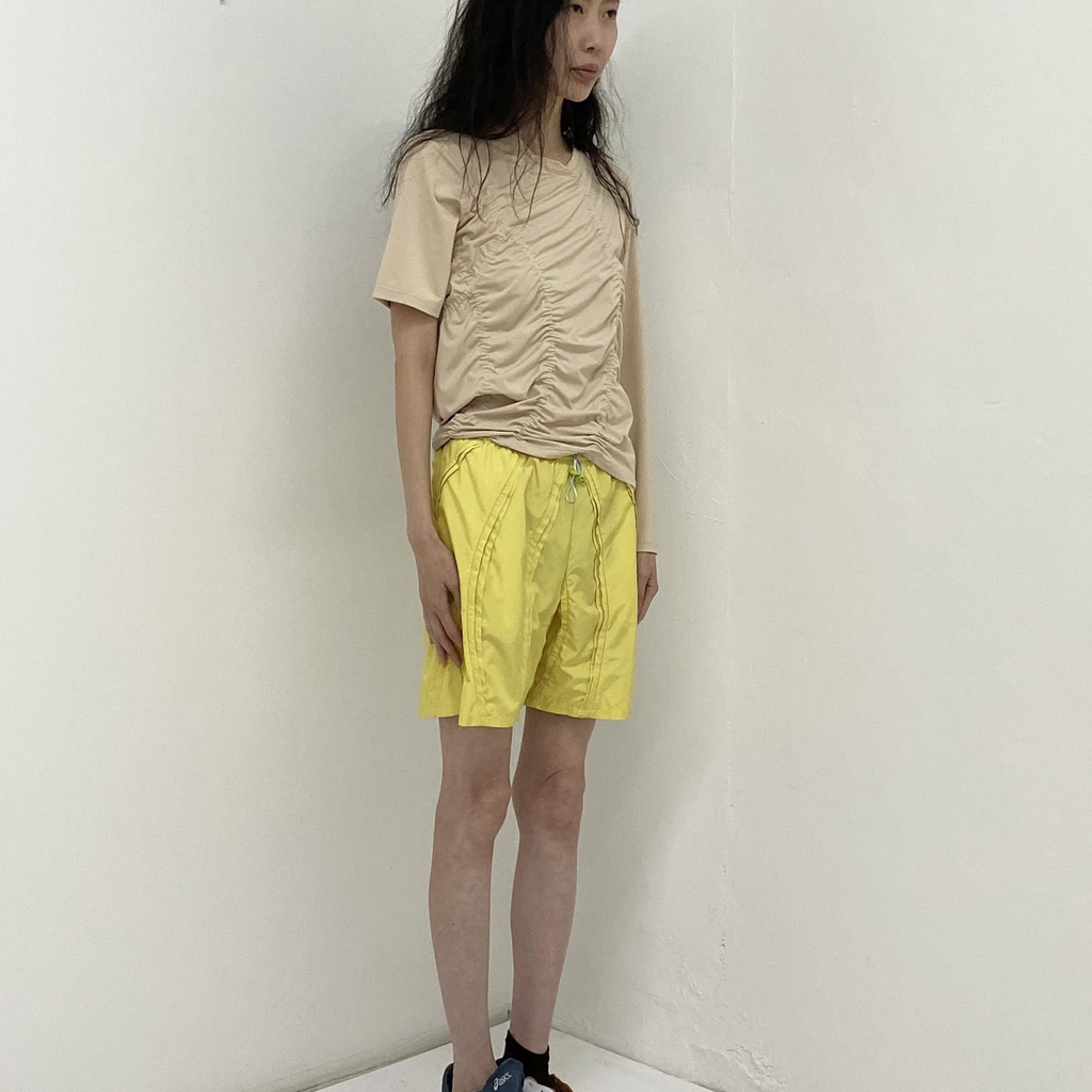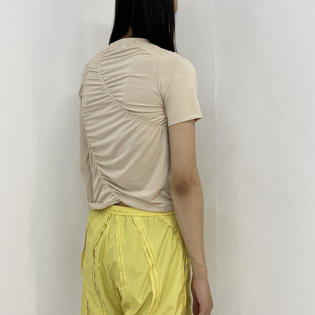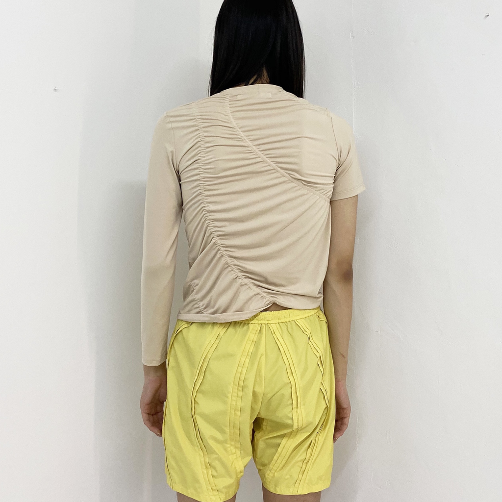 Broken Chamwoe T-Shirt in almond brown by SUNG JU. Made from recycled polyester. Inspired by silhouette of Korean melon. Shirring detail at front and back. Made in South Korea.