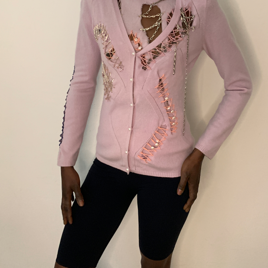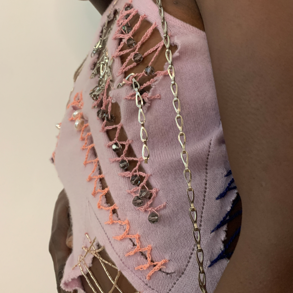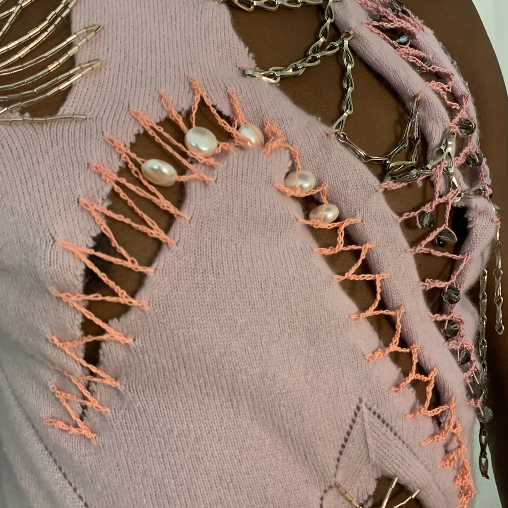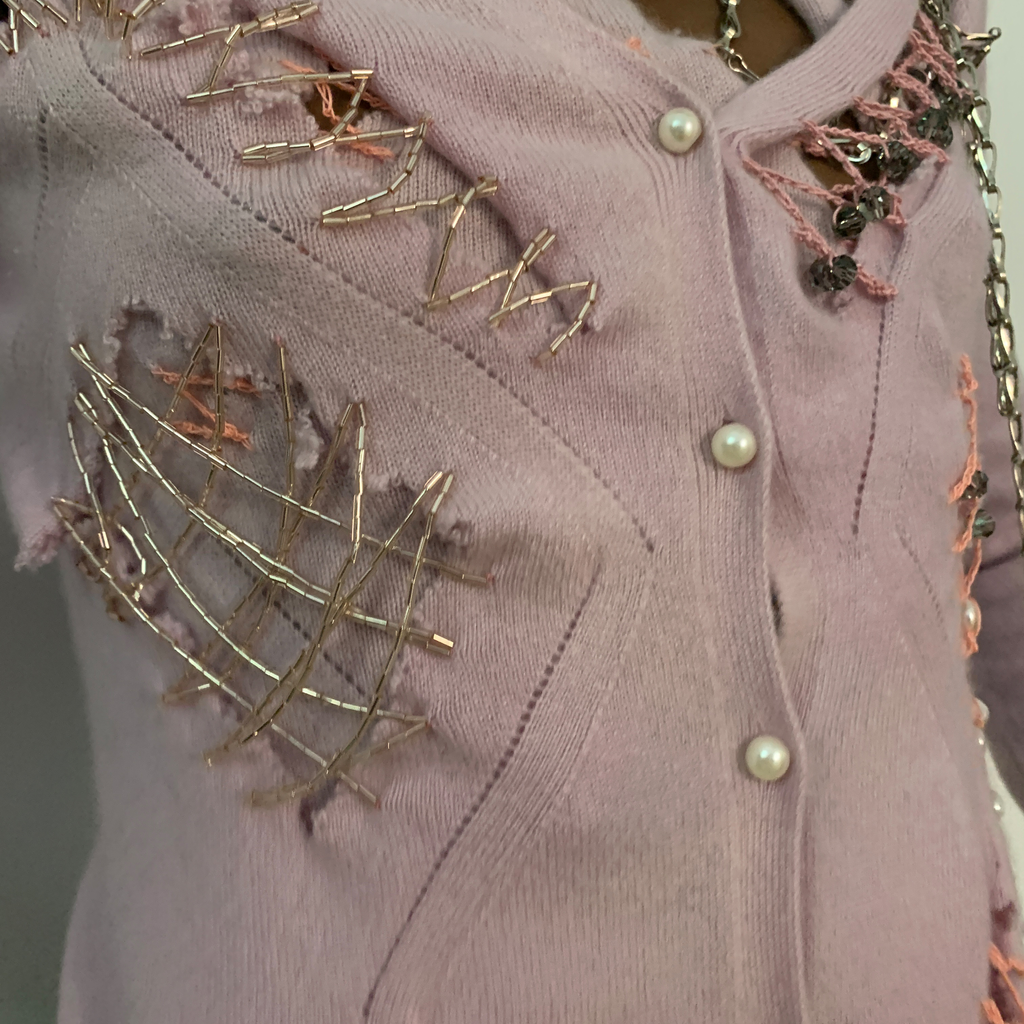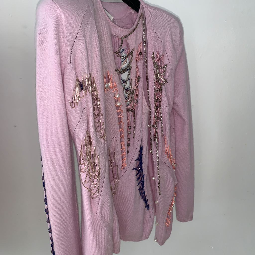 Shoulder padded cardigan featuring pearl buttons, ragged cut outs with chains, glass bead embroideries and crocheted crystal beads. With matching asymmetrical top, featuring ragged cut outs, chains, glass bead embroideries, crocheted crystal beads