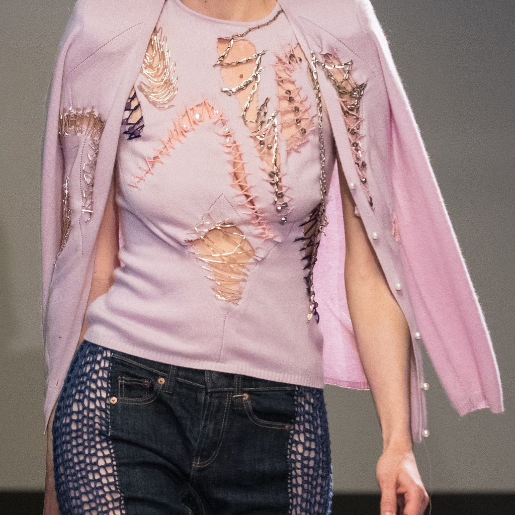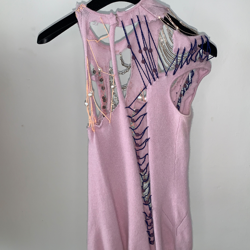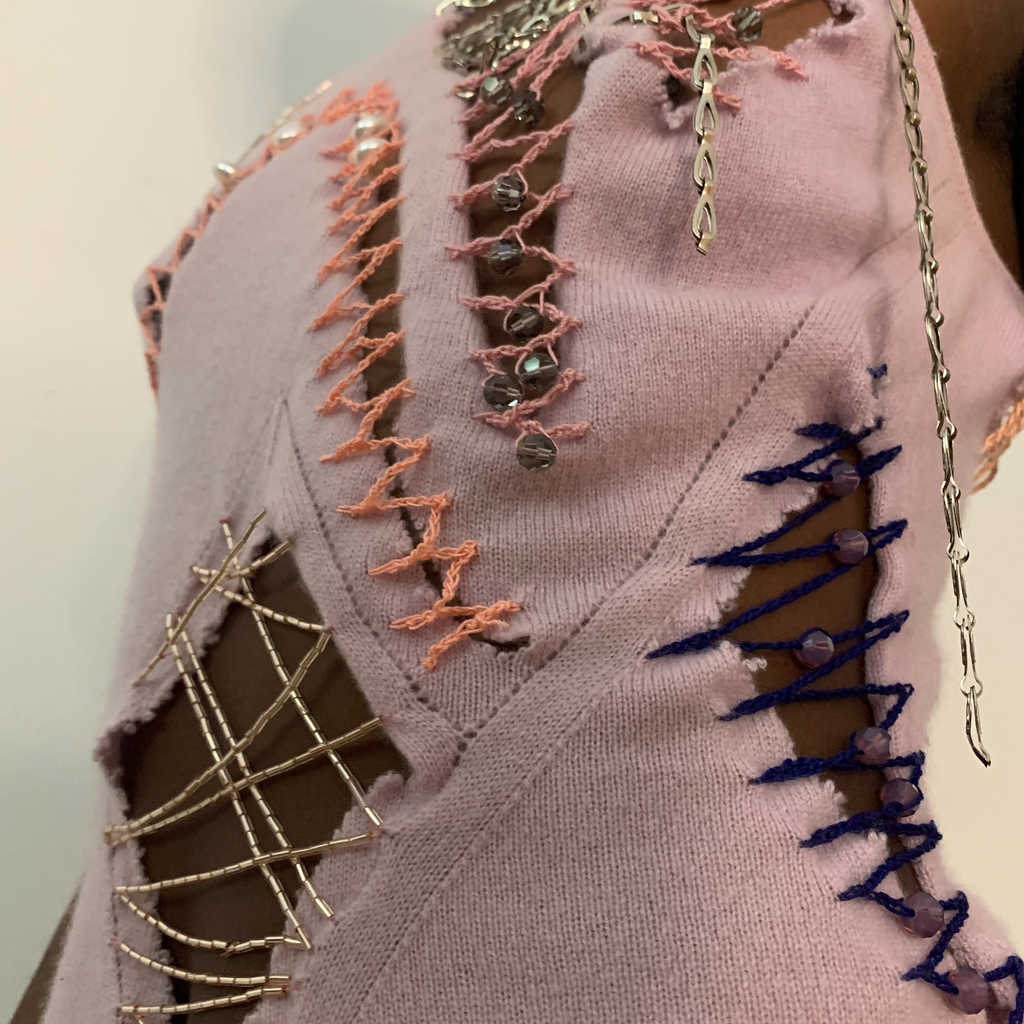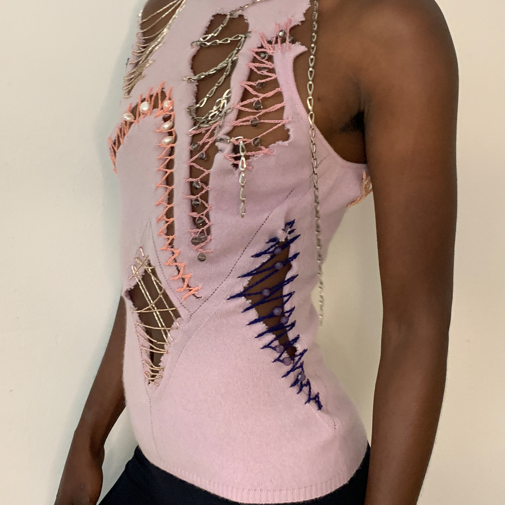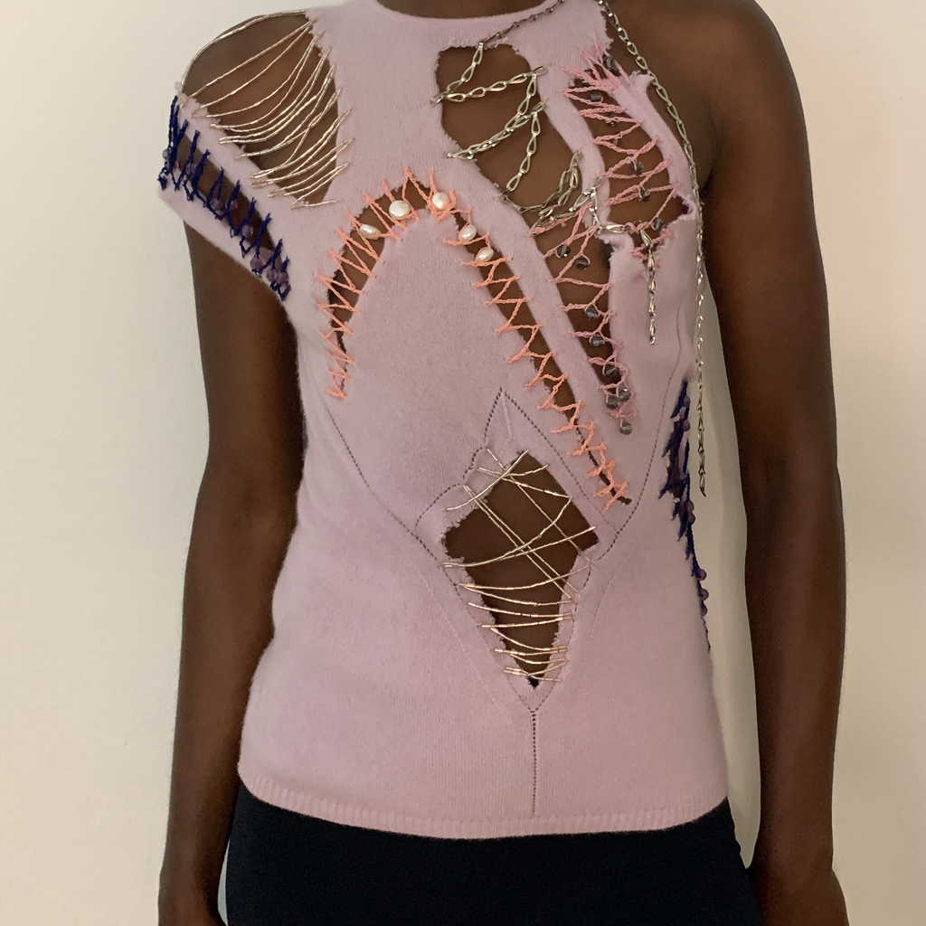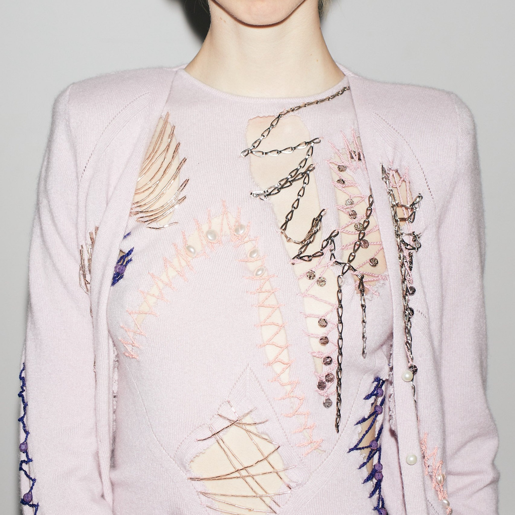 Shoulder padded cardigan featuring pearl buttons, ragged cut outs with chains, glass bead embroideries and crocheted crystal beads. With matching asymmetrical top, featuring ragged cut outs, chains, glass bead embroideries, crocheted crystal beads