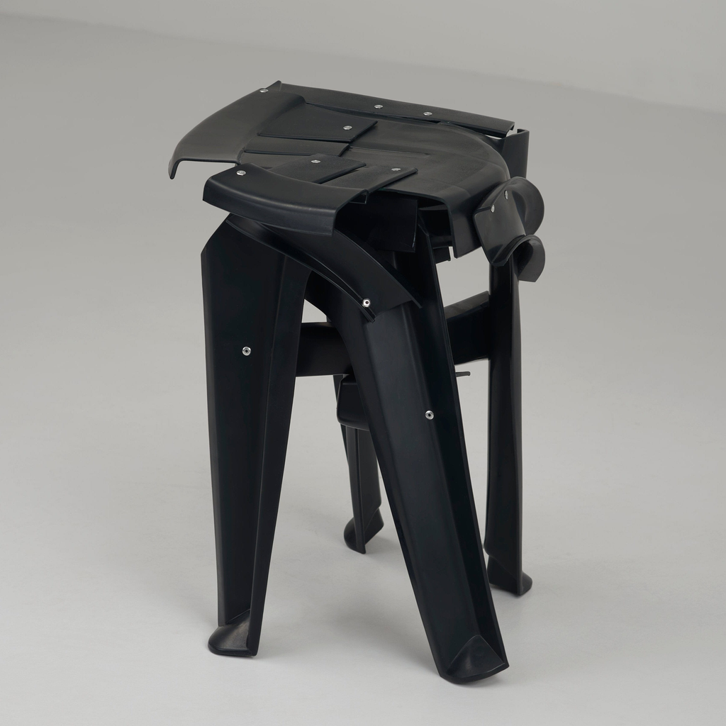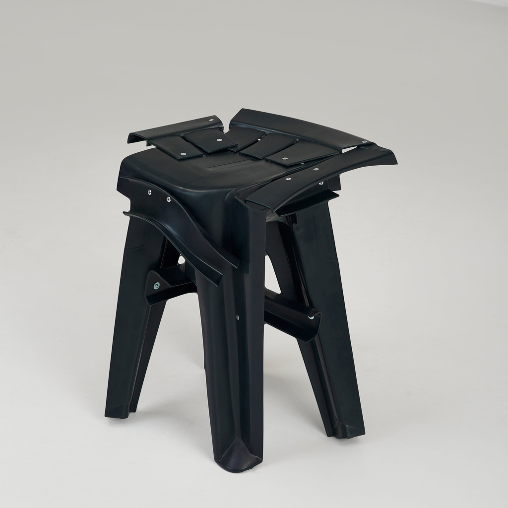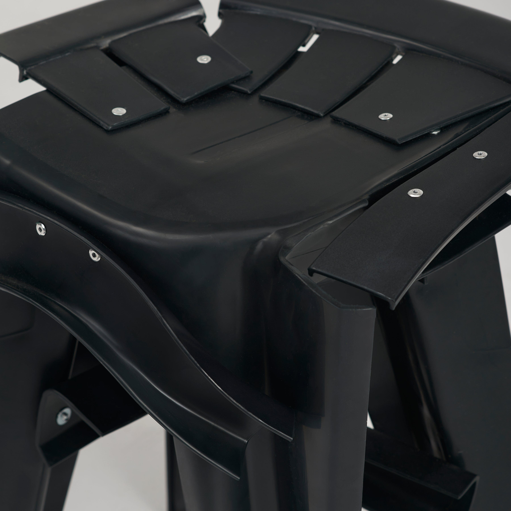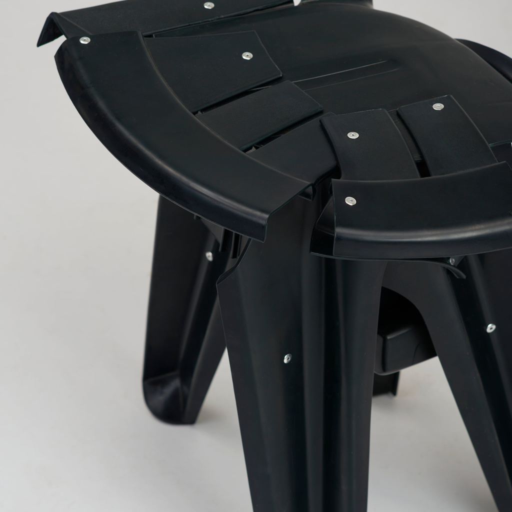Each piece is a 1 of 1 and comes from precisely cut sections of discarded chairs or their off-cuts to create a variety of shapes and sculptural assemblages. They are then sanded, cleaned, fire-polished and finally bound together with aluminium rivets.