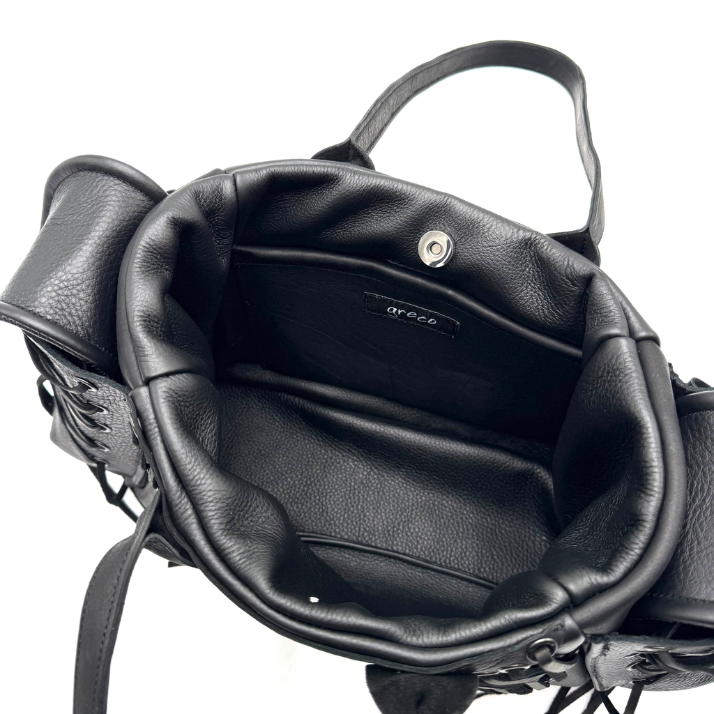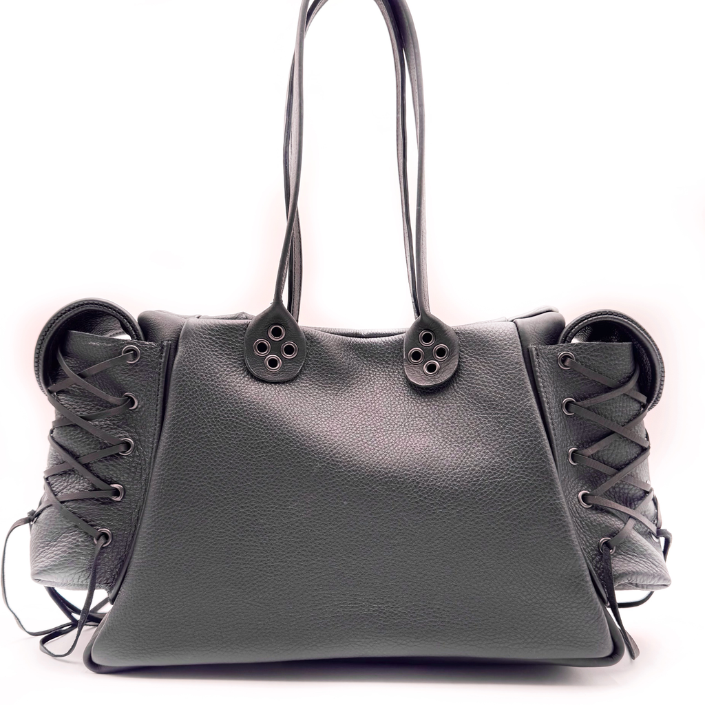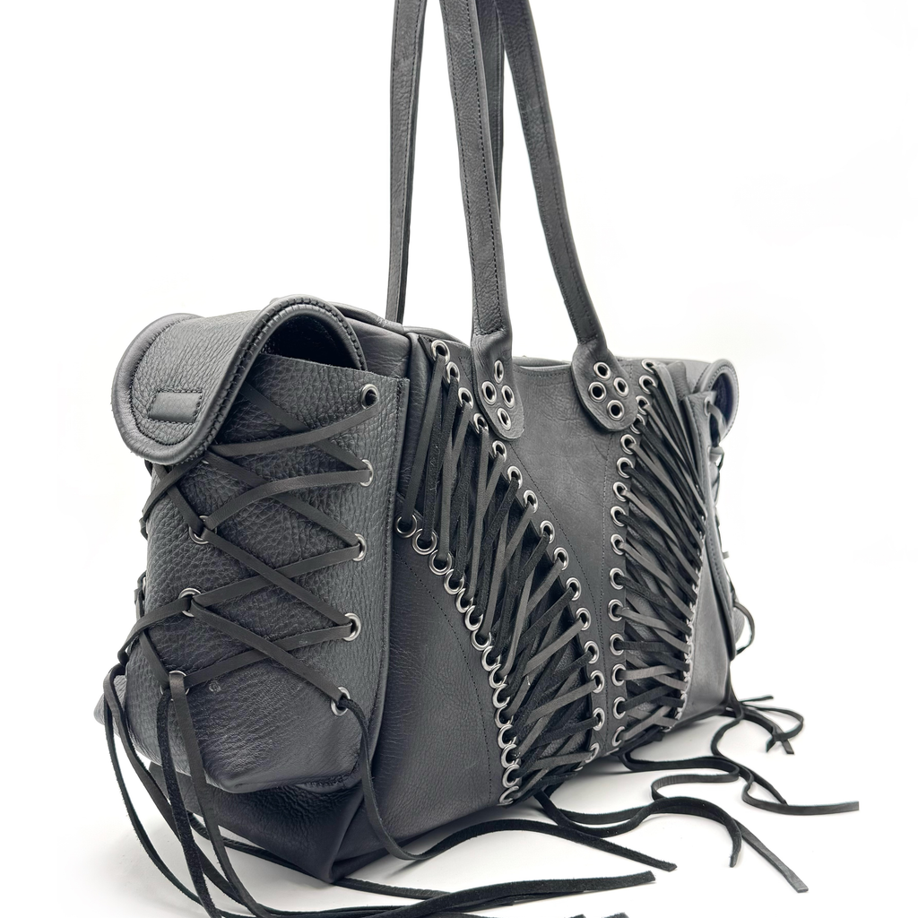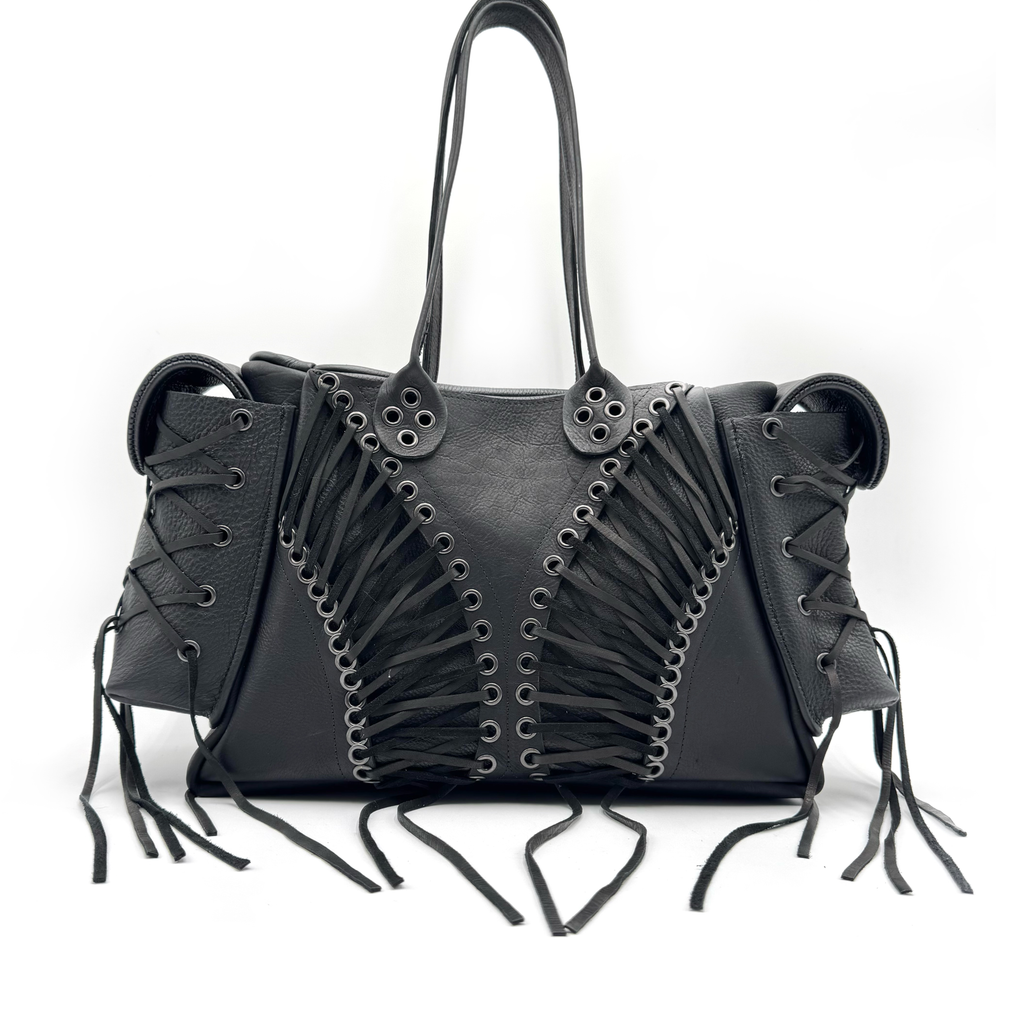 Corset Bag by GRECO constructed of deerskin lace. Dual magnetic cargo pockets. Interior magnetic pocket. Paneled cowhide. Gunmetal eyelets hammered by hand. Spoon handles.