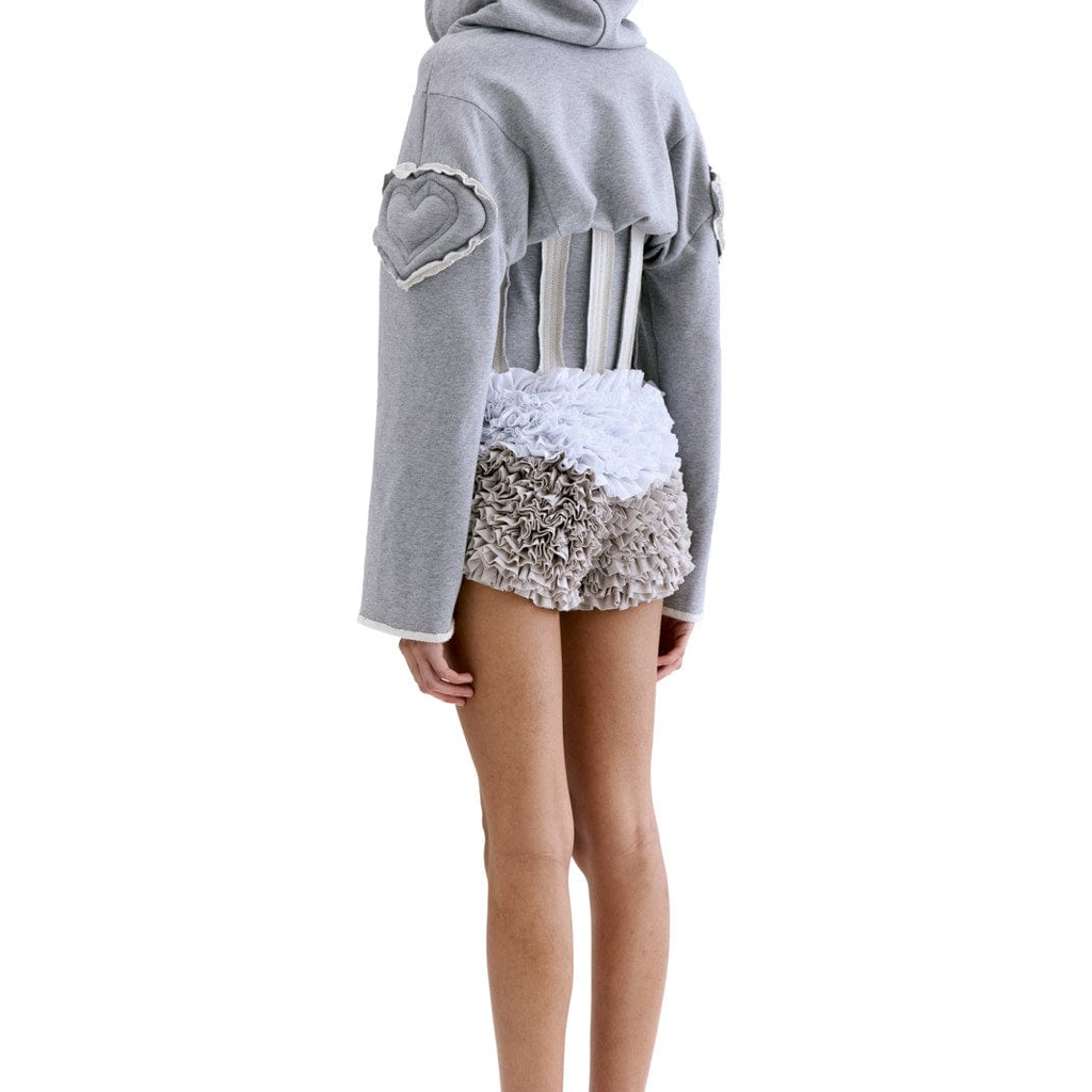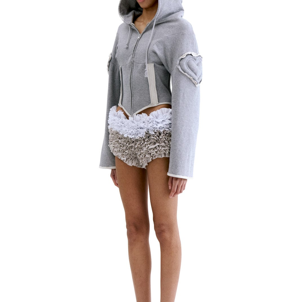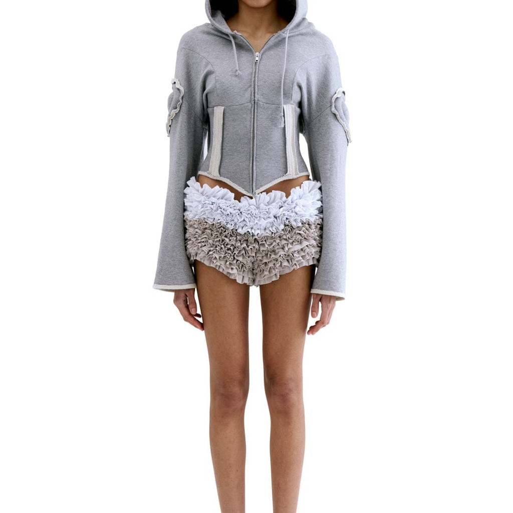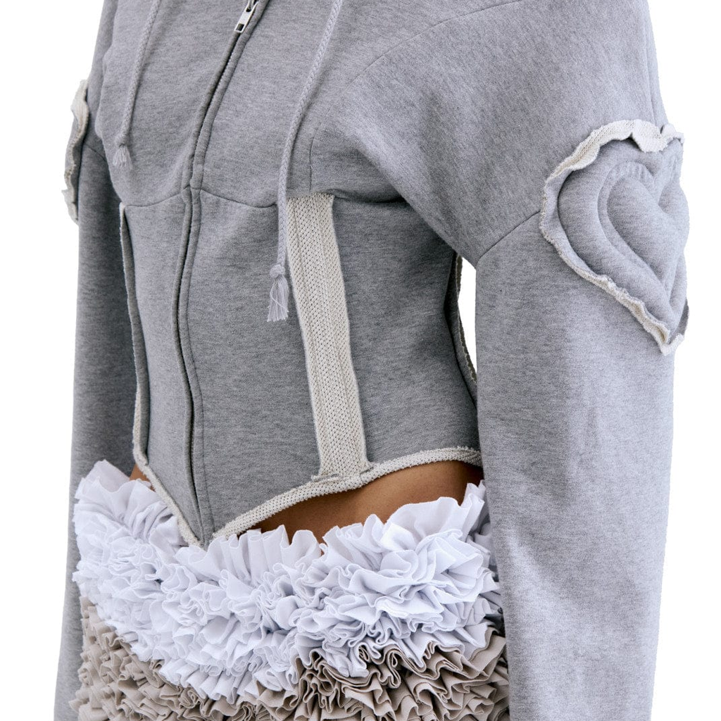 Hoodie with boning, exposed seams, front zipper closure and heart-shaped shoulder pads.