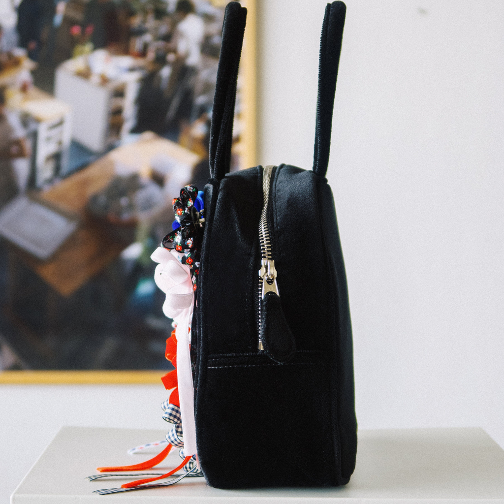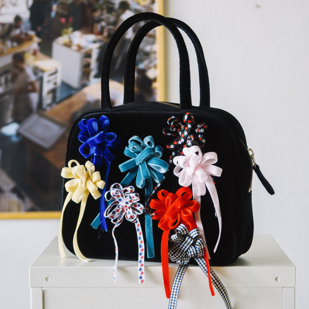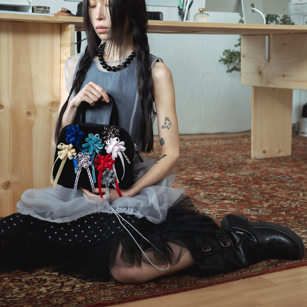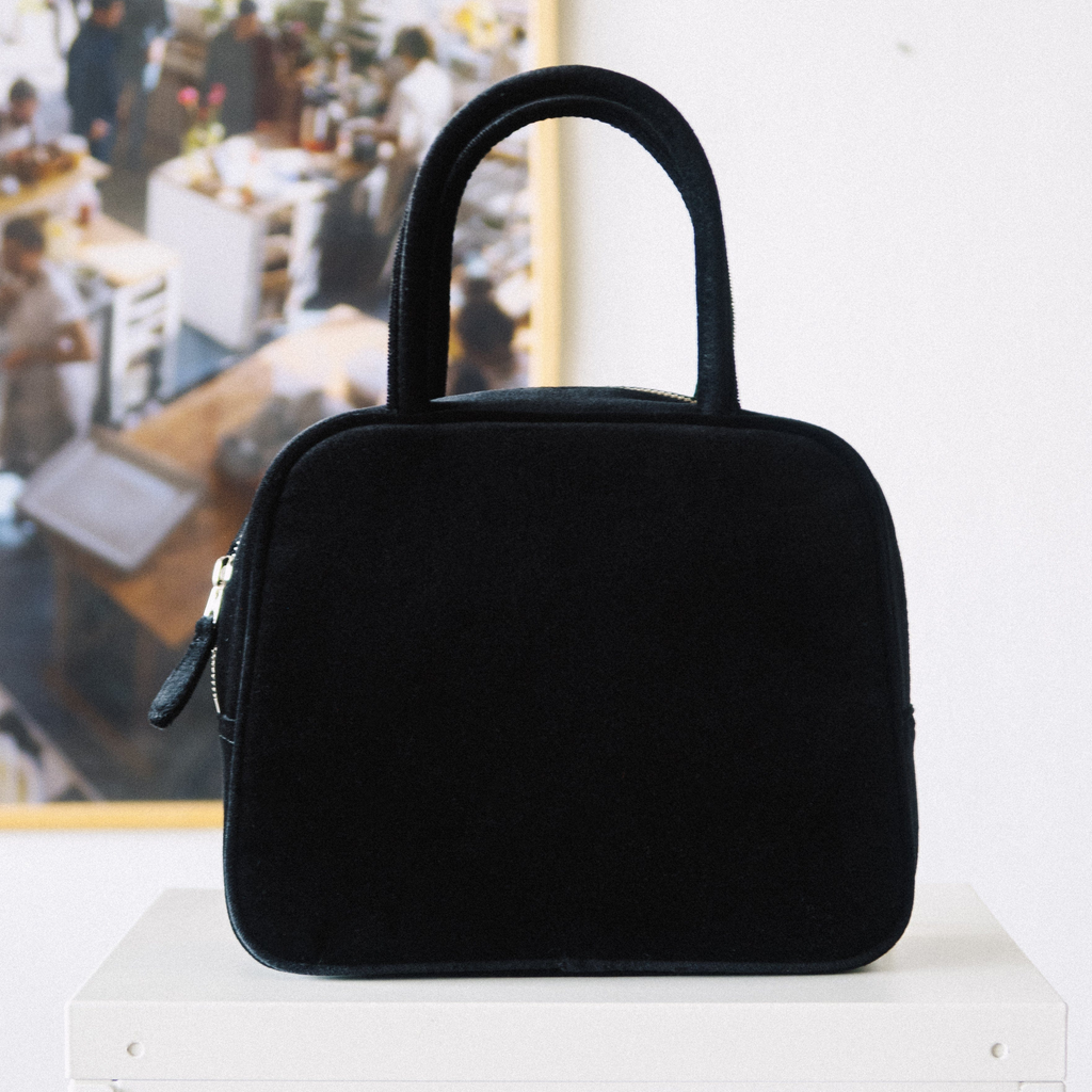 Crafted from soft cotton velvet, this handbag features a subtle sheen and plush texture that elevate its understated silhouette. A detachable brooch, thoughtfully placed on the front, adds a poetic and personal touch—each one uniquely handmade using layered materials.