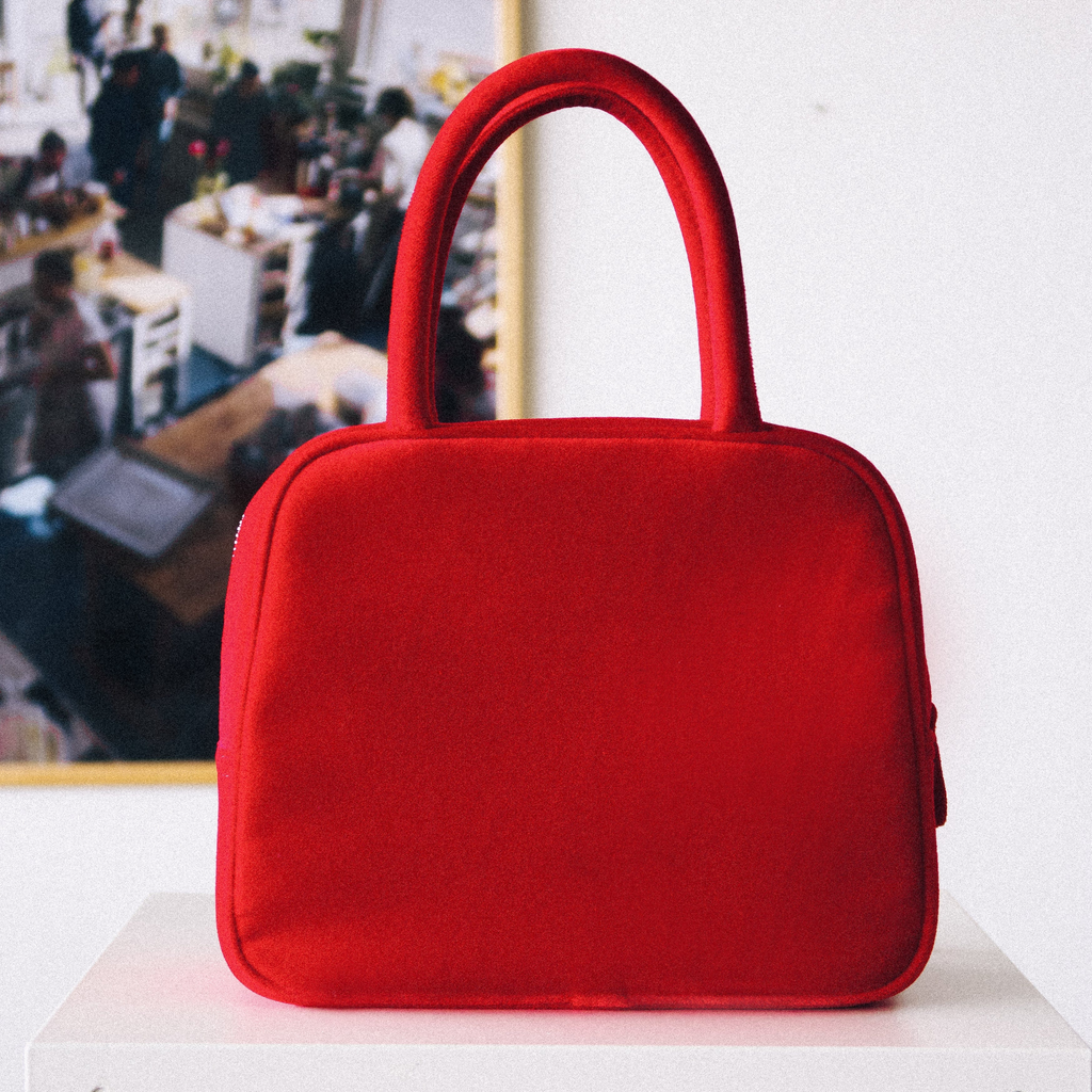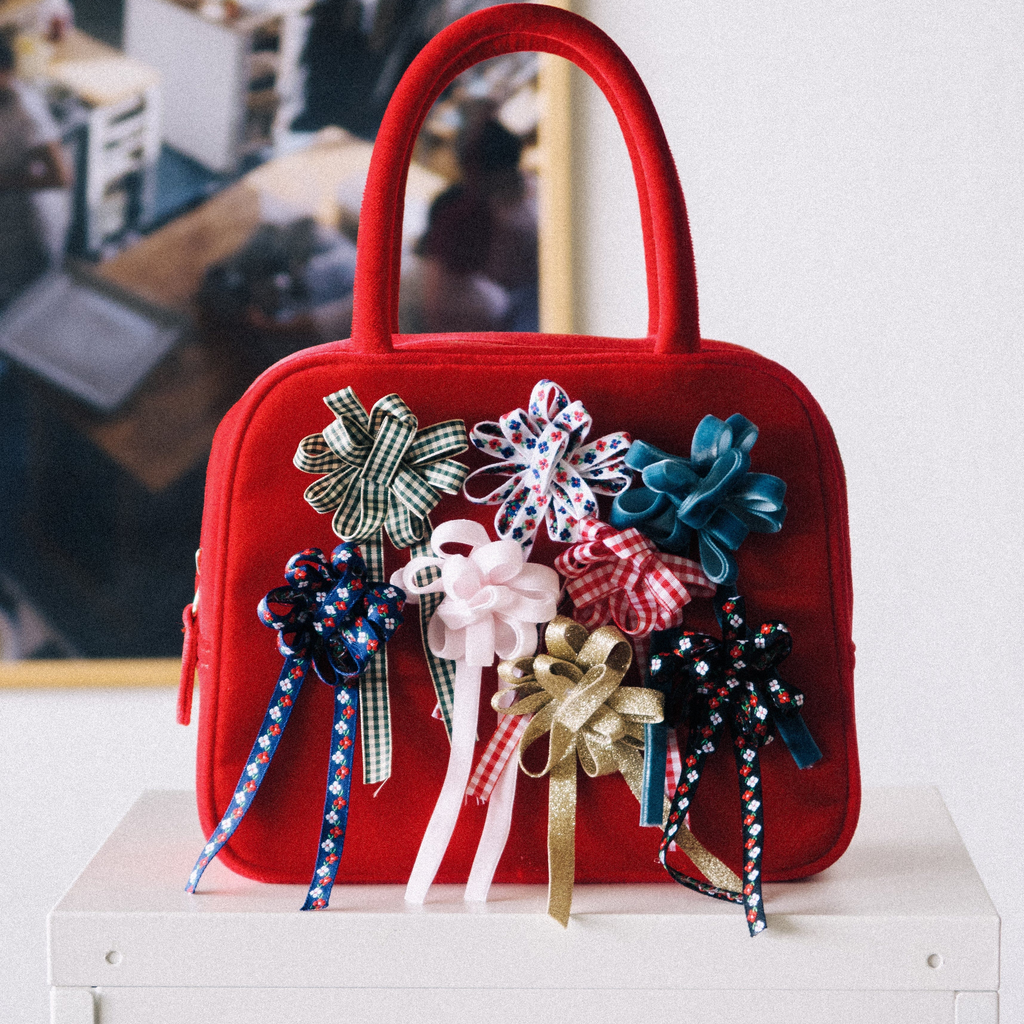 Crafted from soft cotton velvet, this handbag features a subtle sheen and plush texture that elevate its understated silhouette. A detachable brooch, thoughtfully placed on the front, adds a poetic and personal touch—each one uniquely handmade using layered materials.