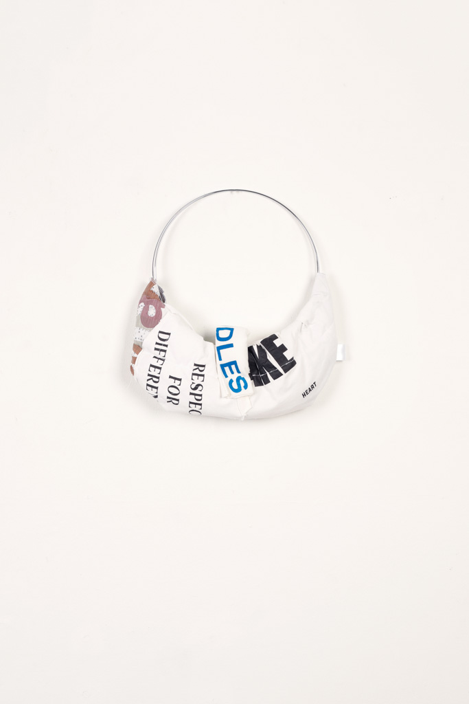Cotton waste puffer loop bag with metal handles and magnetic front closing.