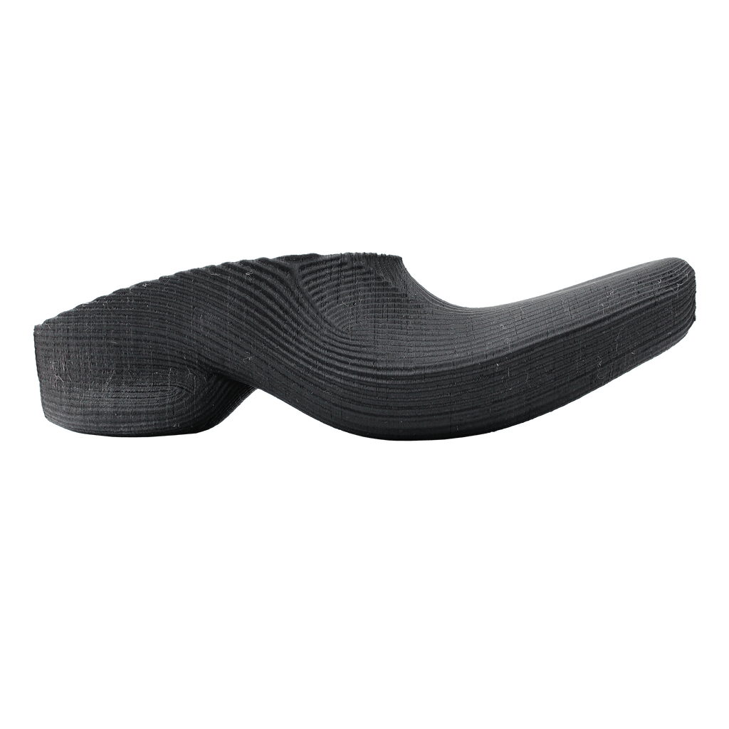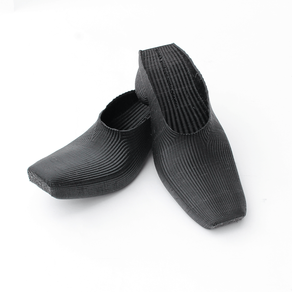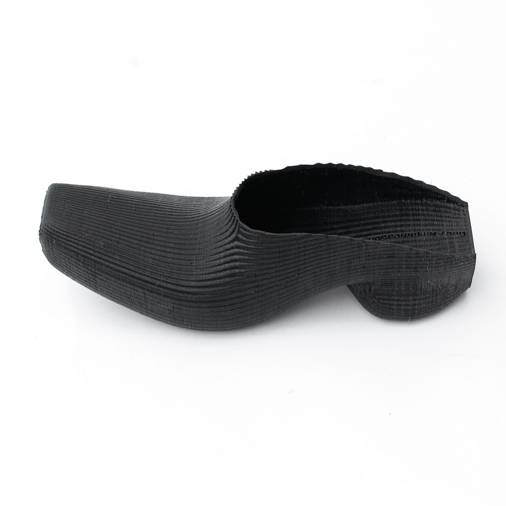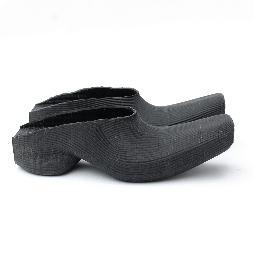 3D printed rubber mules. These mules are made entirely from a fully recyclable and highly flexible polyurethane rubber. 3D printing reduces material usage when compared to traditional injection moulding. It is normal for printing results to not be entirely perfect. Small defects contribute to the aesthetic of the product and do not affect its functionality.