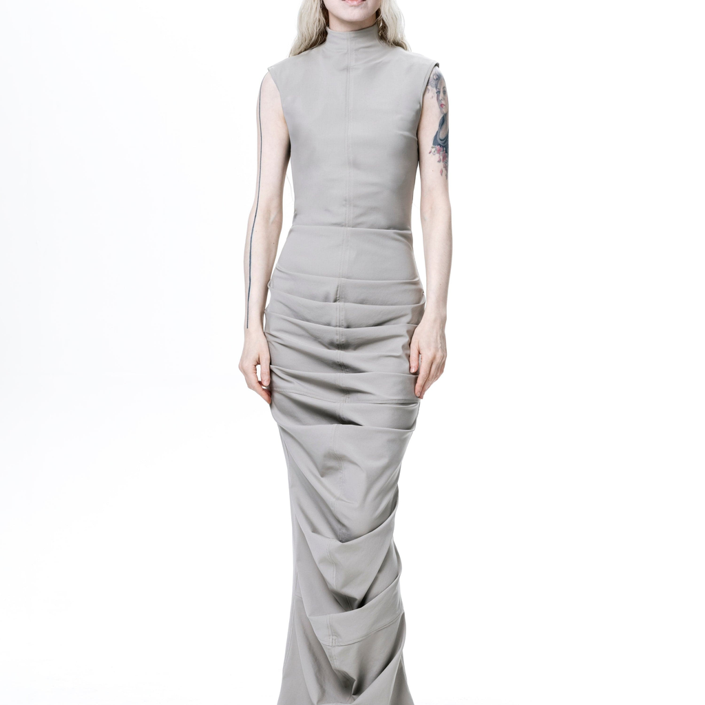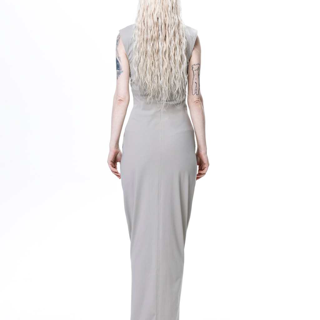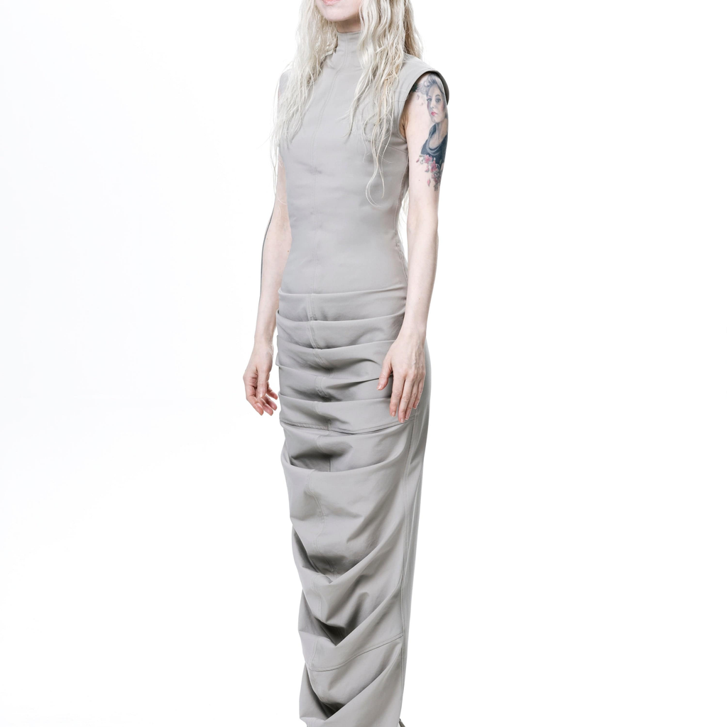 A full-length ash grey jersey dress with cascading front-facing cowls, offering a flattering silhouette that combines comfort, style, and graceful movement