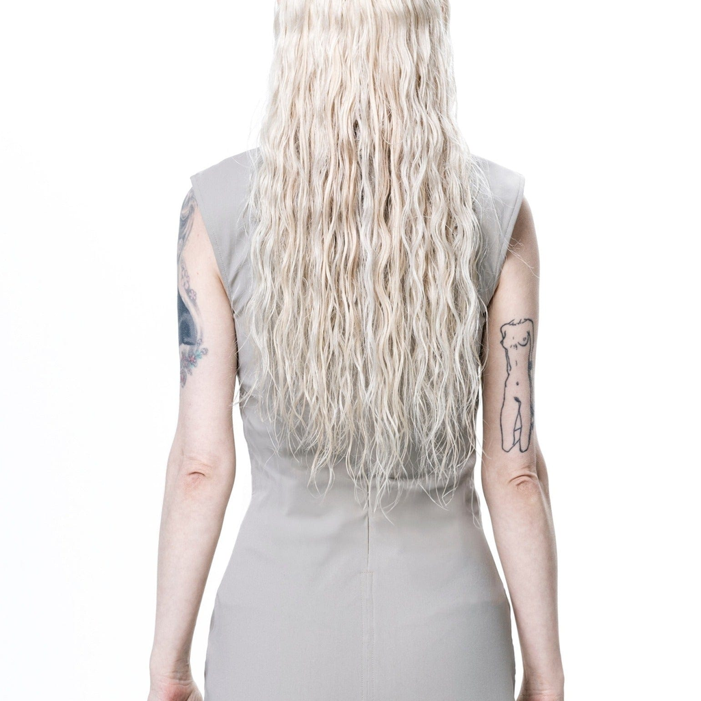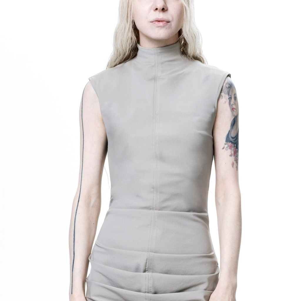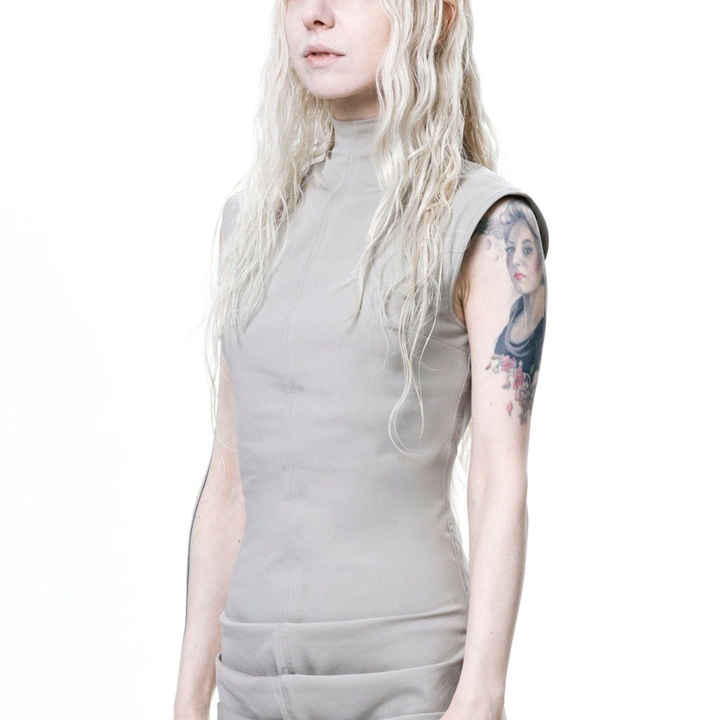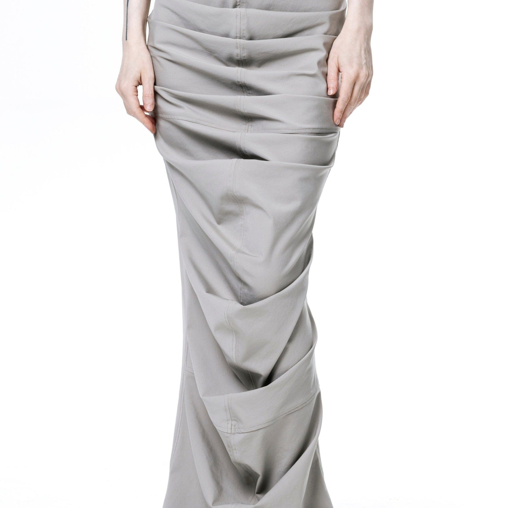 A full-length ash grey jersey dress with cascading front-facing cowls, offering a flattering silhouette that combines comfort, style, and graceful movement