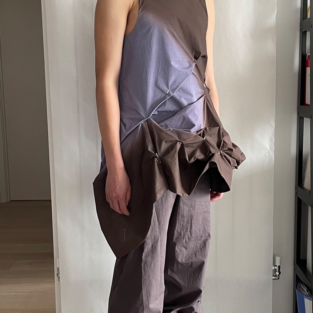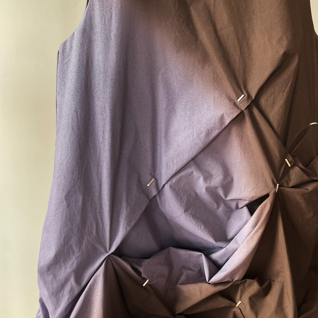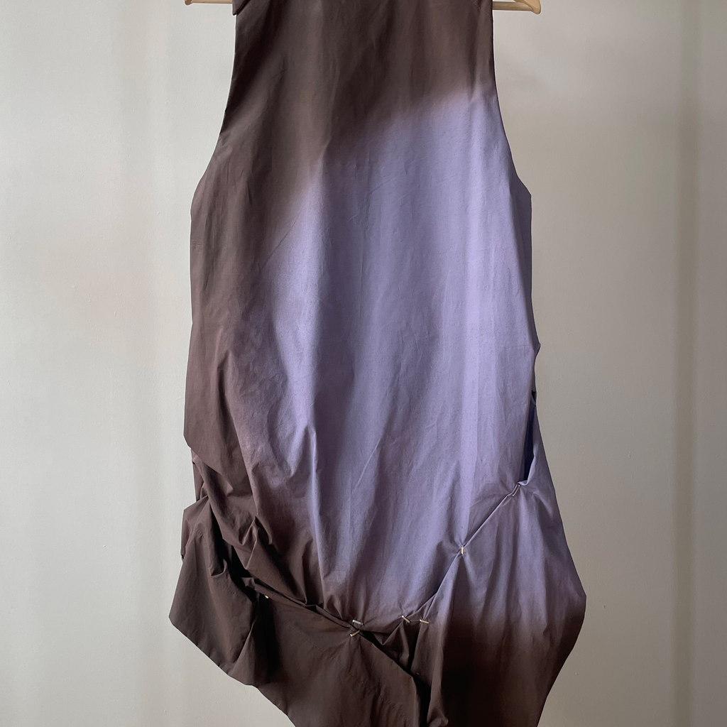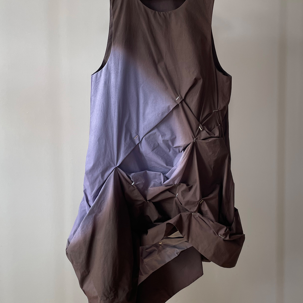Fully Lined digital printed Airbrush Aura dress with irregular pleating with handmade staples. Finished with high a neckline and invisible snaps on the shoulder.