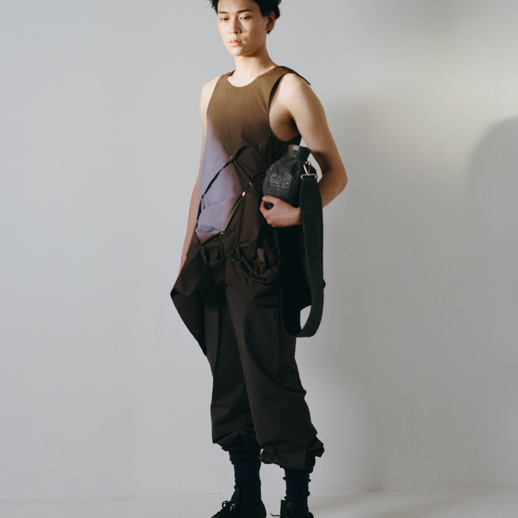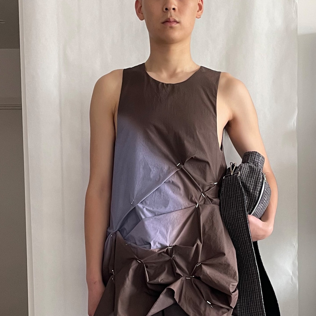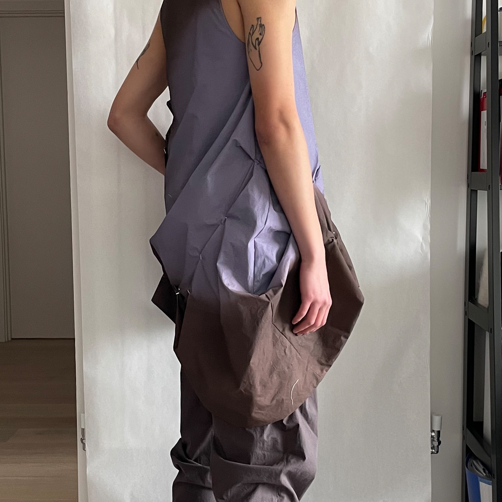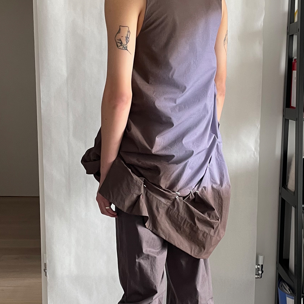 Fully Lined digital printed Airbrush Aura dress with irregular pleating with handmade staples. Finished with high a neckline and invisible snaps on the shoulder.