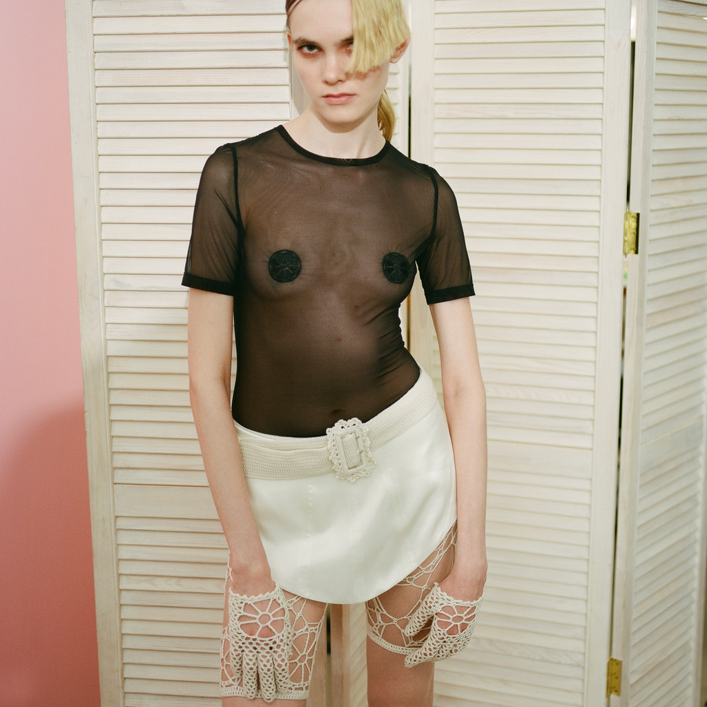 Established in 2020 by twin sisters Anastasia and Maria Vaniushina, Nastyamasha is a fashion label that designs wearable and comfortable garments that allow for easy movement. The brand incorporates mesh fabrics and crocheted knitwear to give a fresh interpretation to conventional restrictive clothing, featuring structured corsets, textured miniskirts, and strapless tops.
