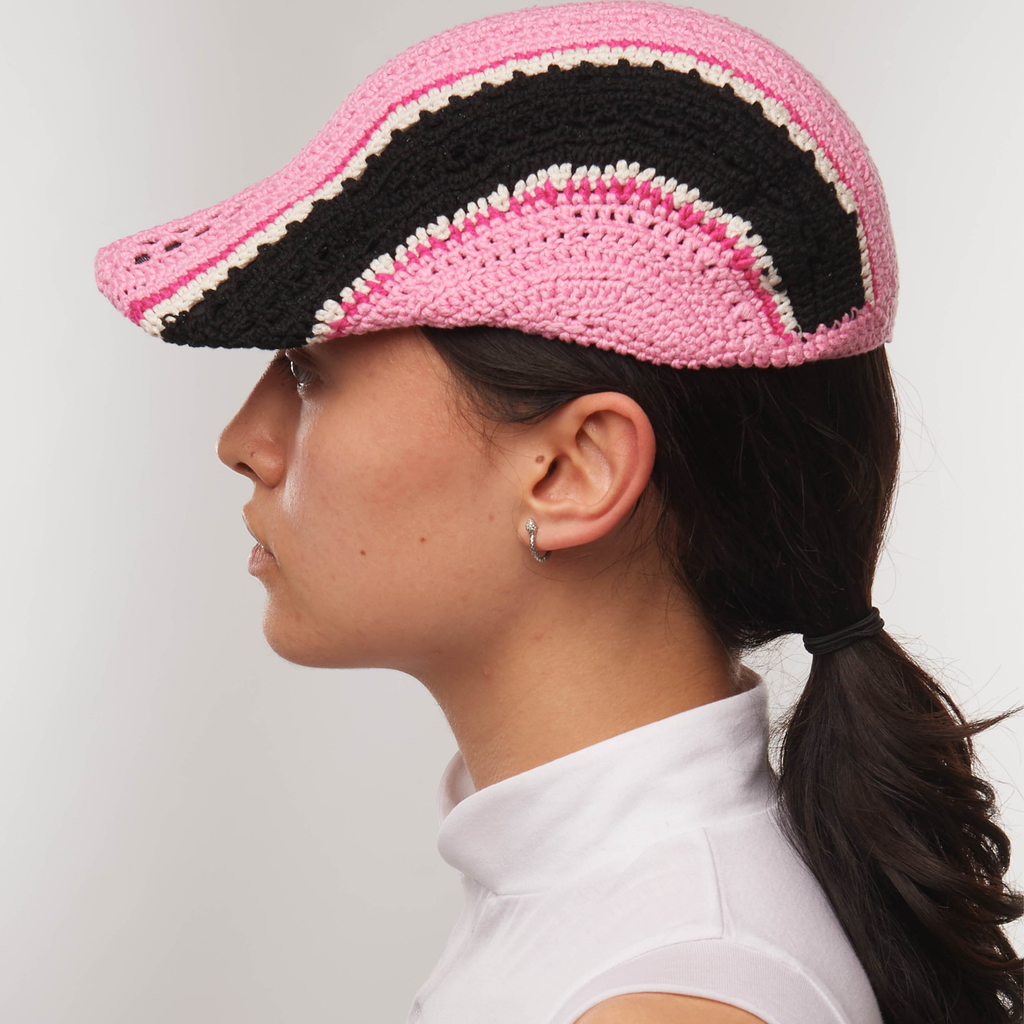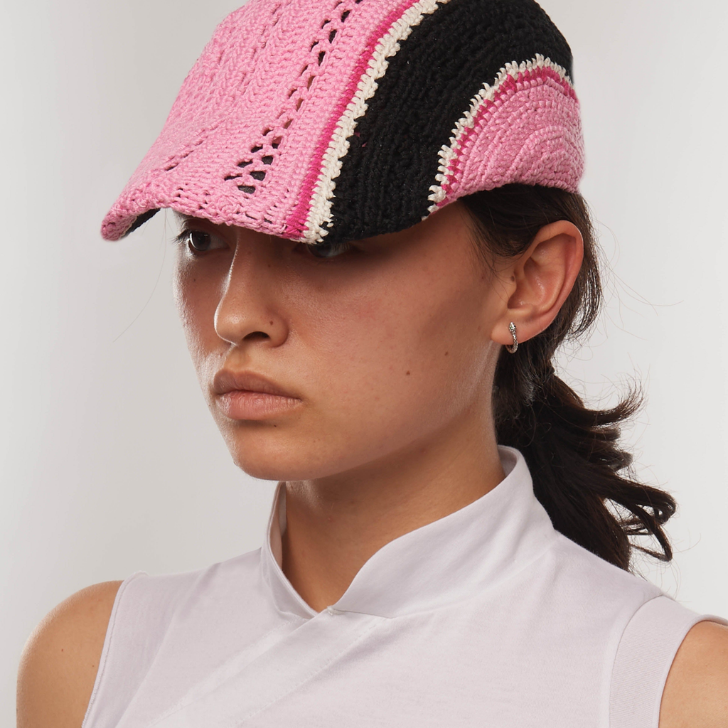Handmade crochet flat hat carefully carved with a highly twisted bio cotton which gives a solid structure and clean look. A recycled plastic visor is covered in a knitted lining and serves as a shell for the peak.