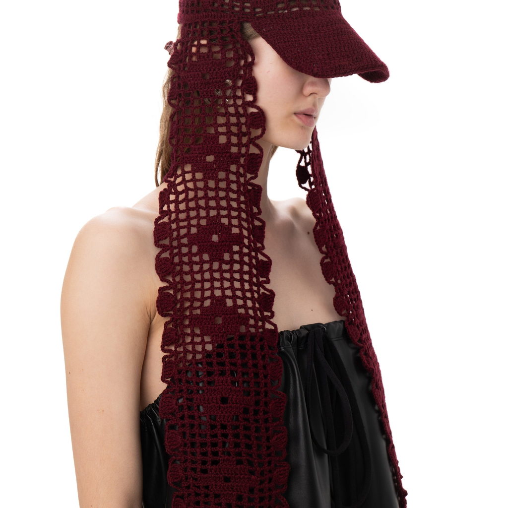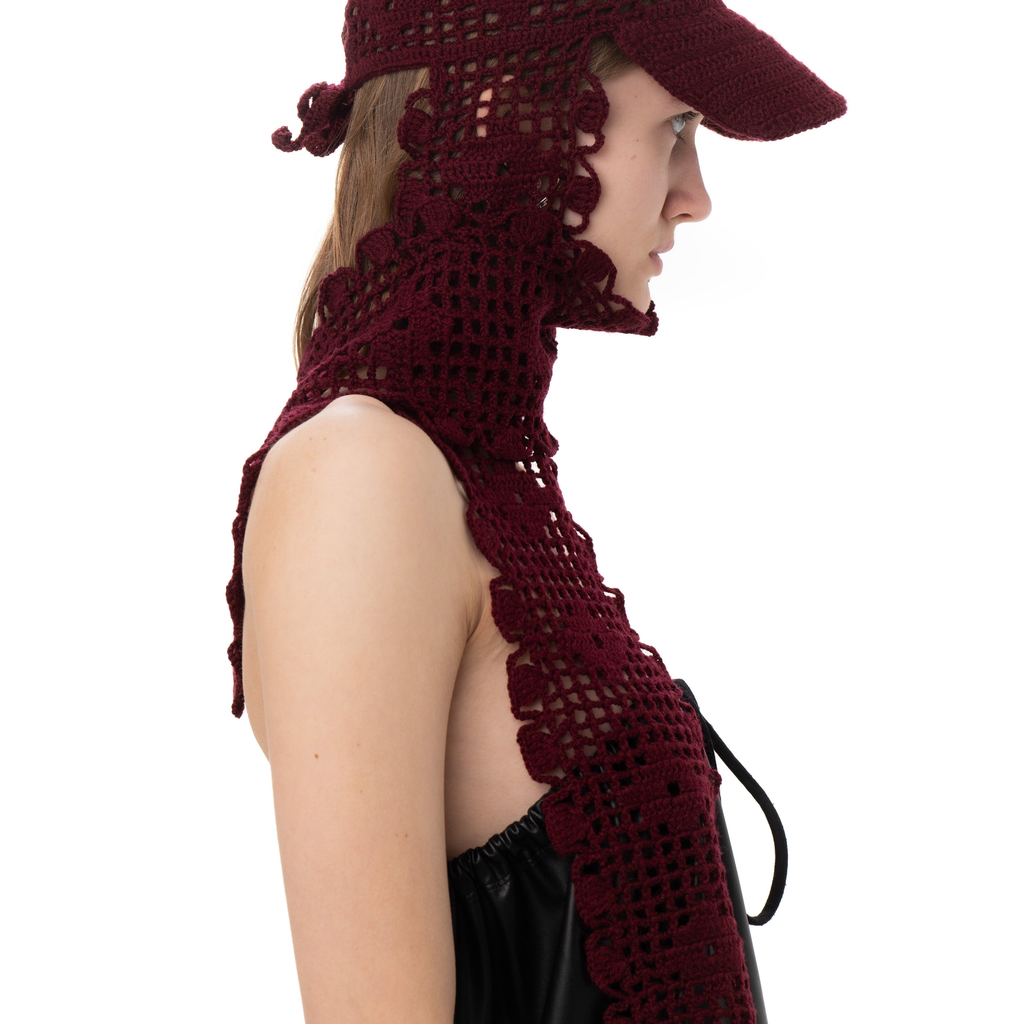 Handmade crochet scarf-cap. Self-tie fastening at back. Inspired by ‘Kykai’: netted or sprang caps of Lithuania and crocheted descendants.