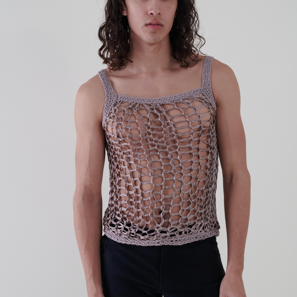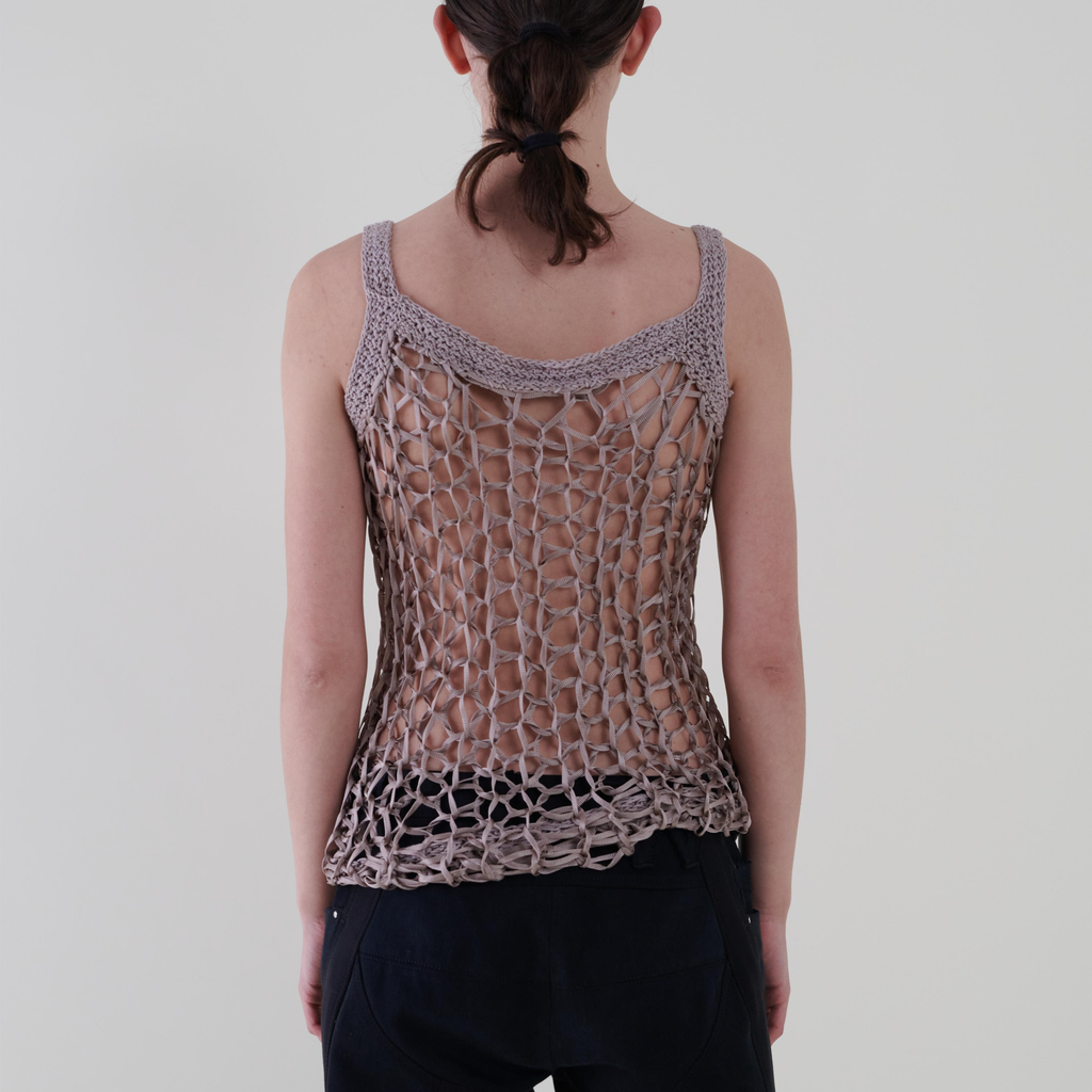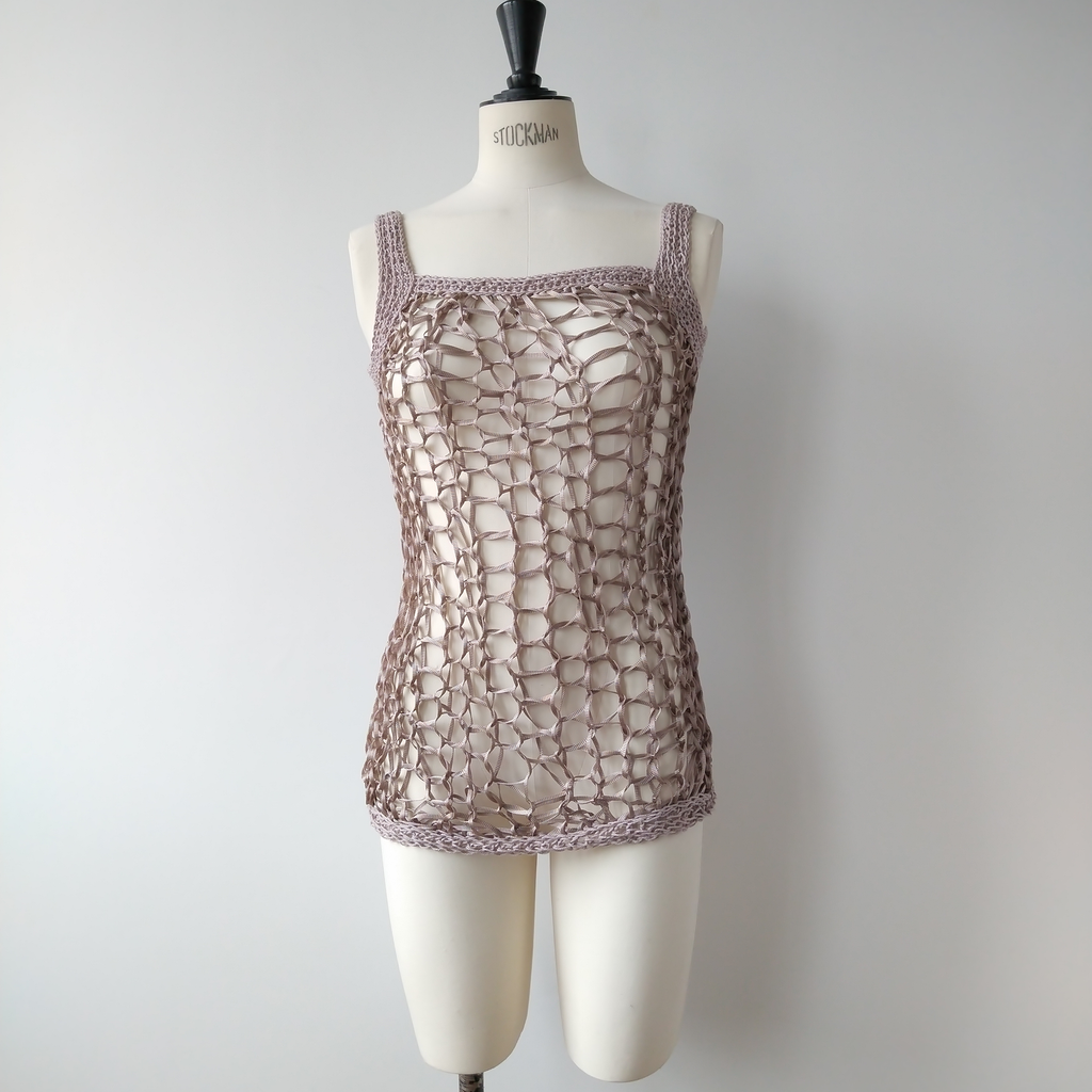 Tank top made of mesh-like blush beige shiny viscose crochet ;