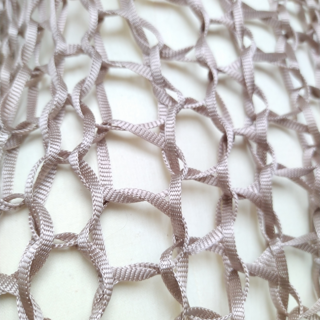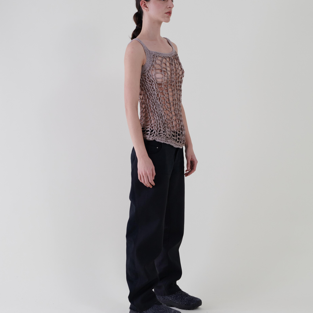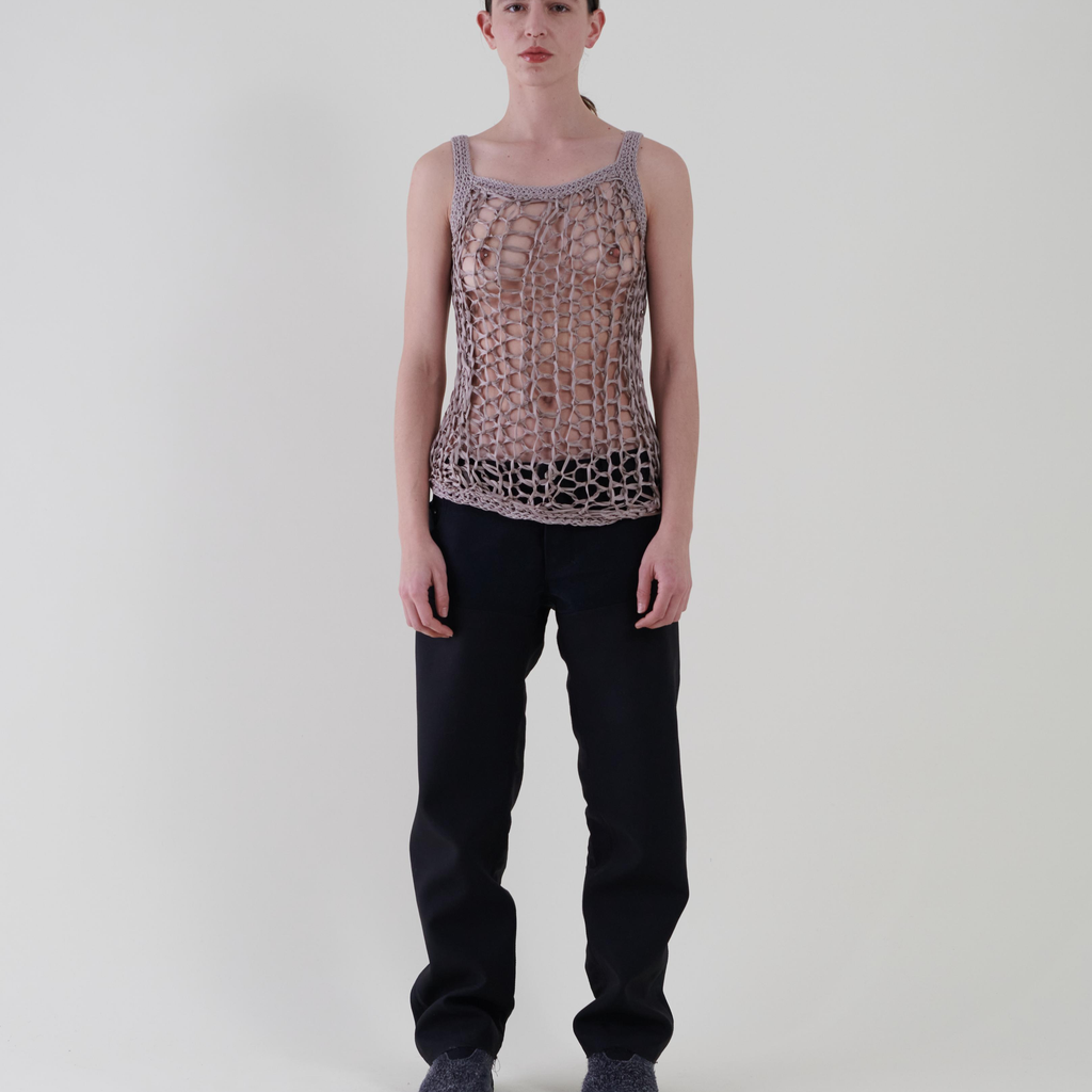 Tank top made of mesh-like blush beige shiny viscose crochet ;