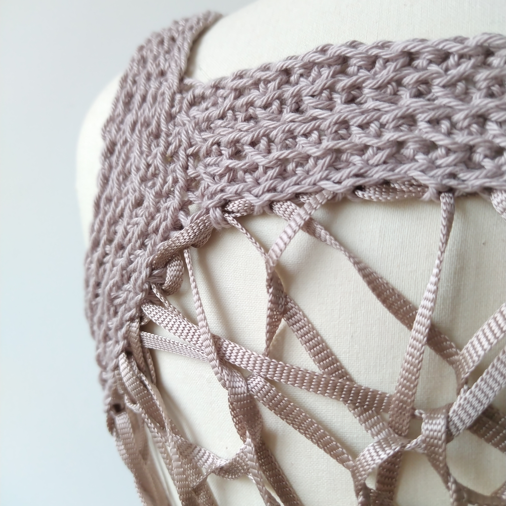 Neckline and shoulder straps fashioned with a taupe cotton yarn