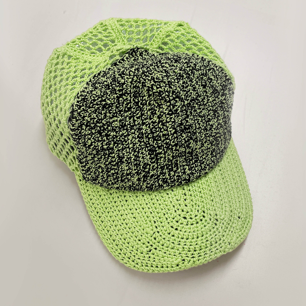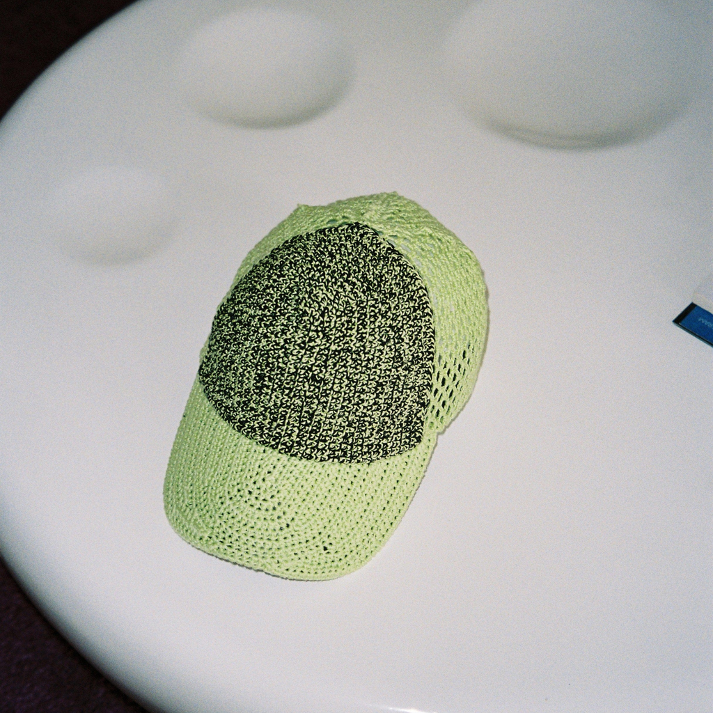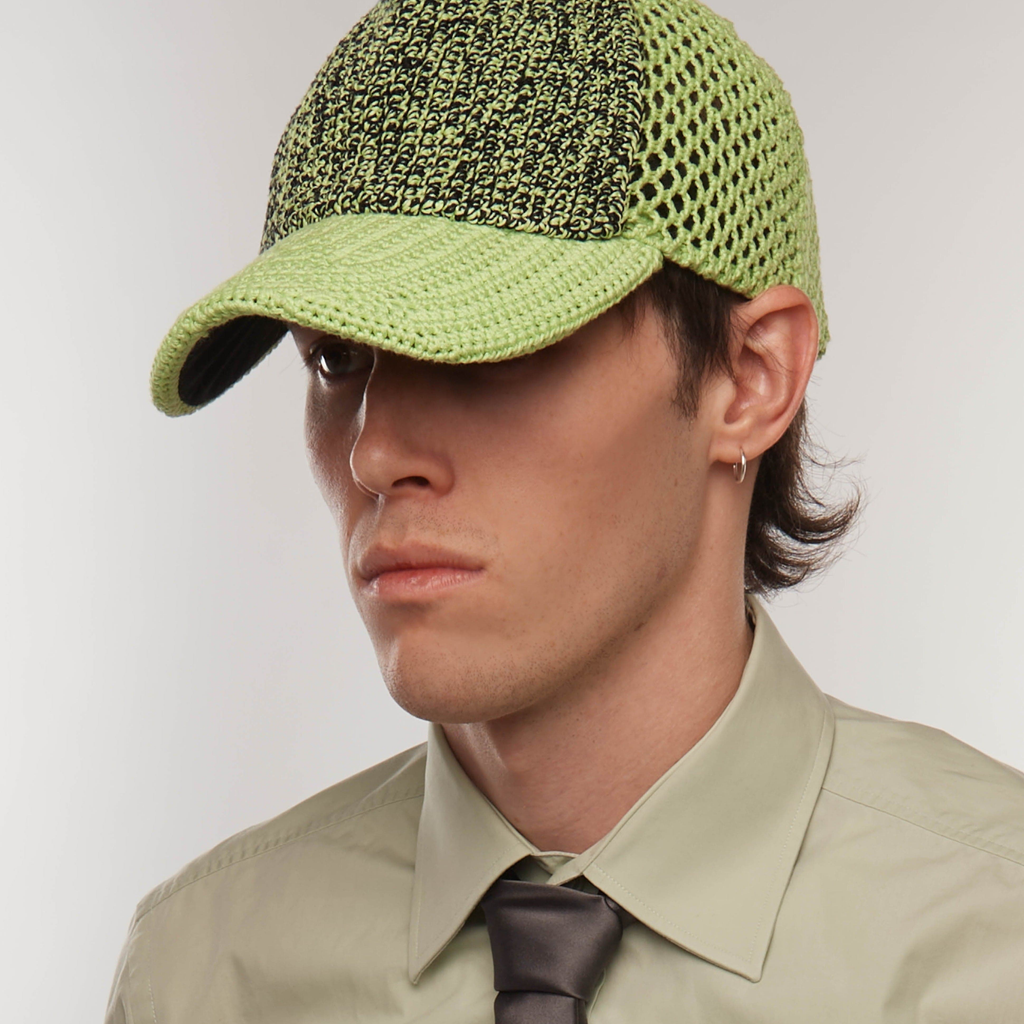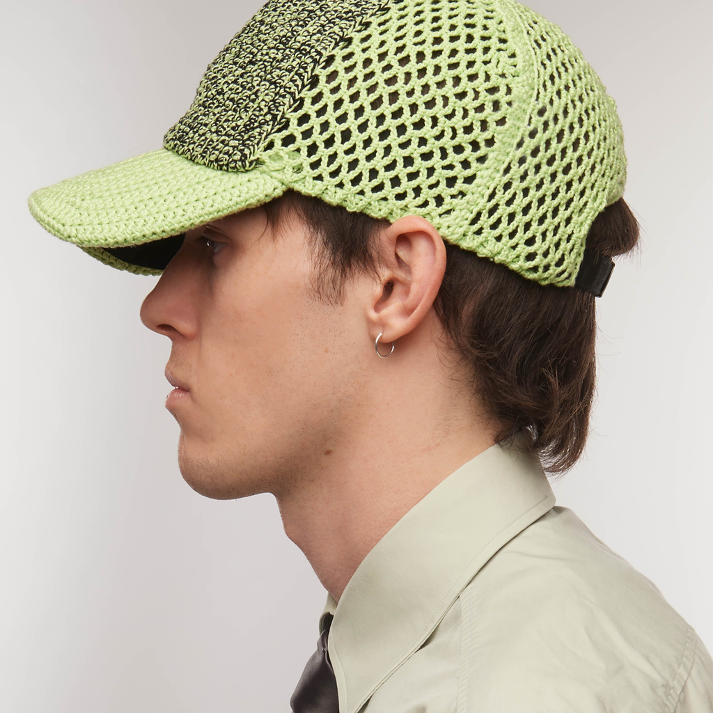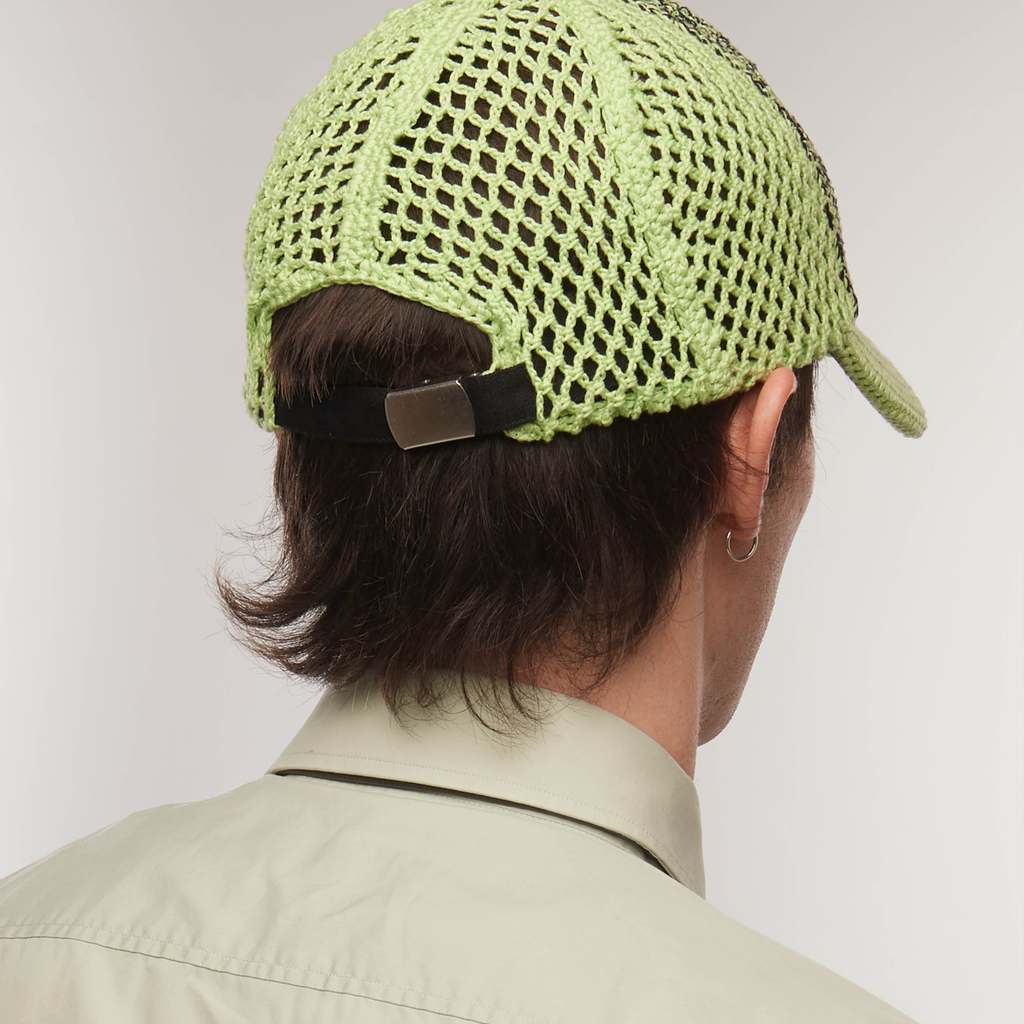 Iconic trucker design translated into the brand’s textural language of handmade crochet. The reinforced visor and the inside lining are giving the cap the necessary structure and feel. Fit is adjustable on the back with a locker.
