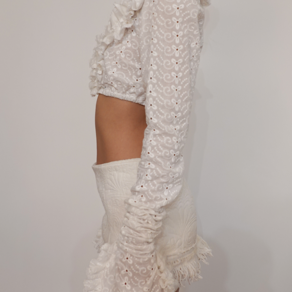 Extra long sleeves cotton top with floral ruffle neckline, rough hemline.Made with 92% Cotton, 8% Silk