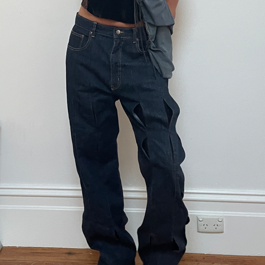 Wide leg, 6 Panelled indigo denim. Featuring openings in seams designed to crunch and open up with movement of the body.Comes with a removable black lining that buttons in at the waistband so you can choose to cover the holes or show some leg.