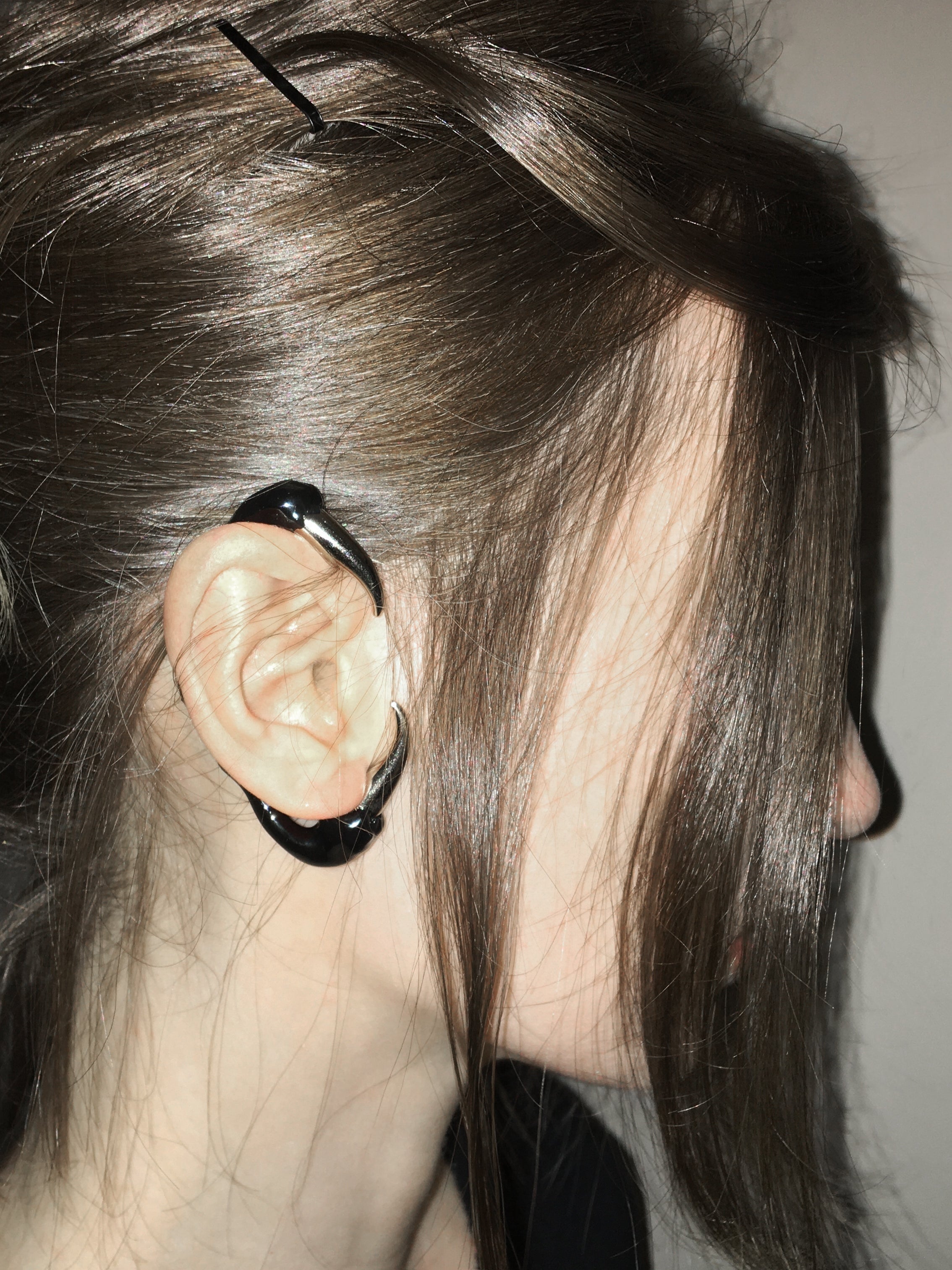 Cuff The white part is flexible and the cuff can be fixed on the ear ONE SIZE - length 14 cm Each item design is unique and is made by hand with minor changes in design Use wet wipe to clean