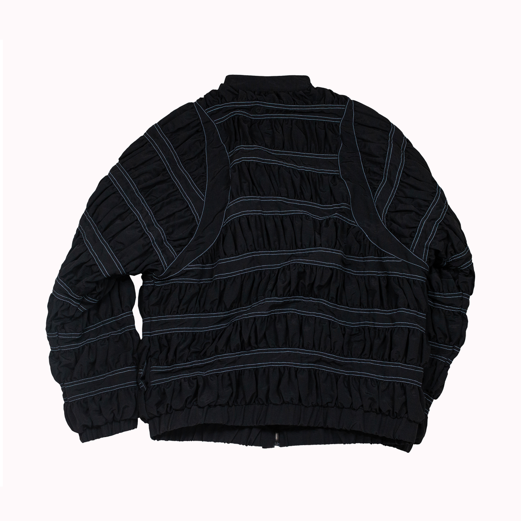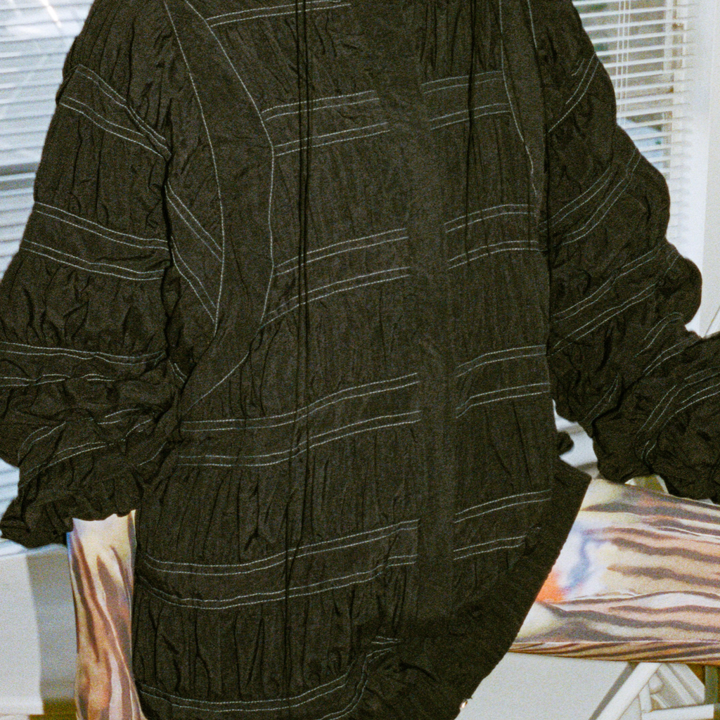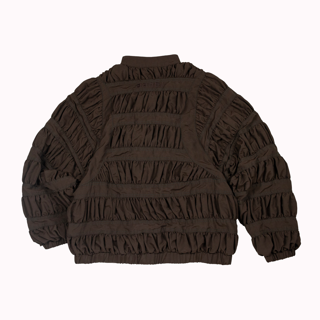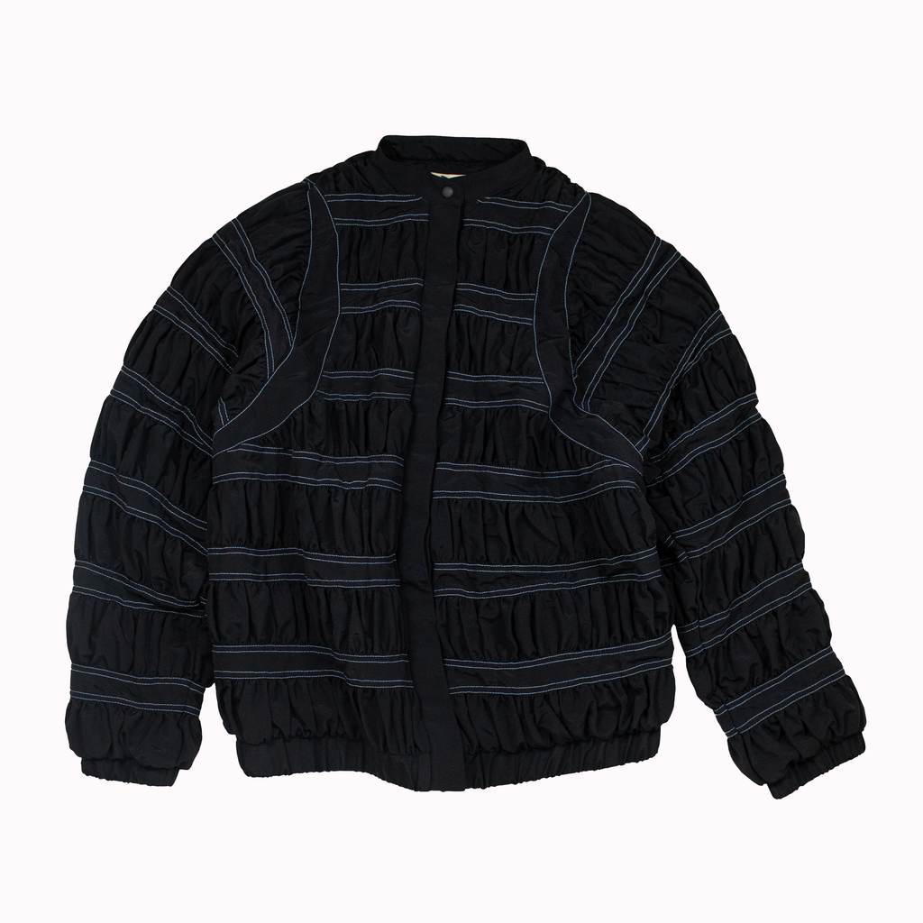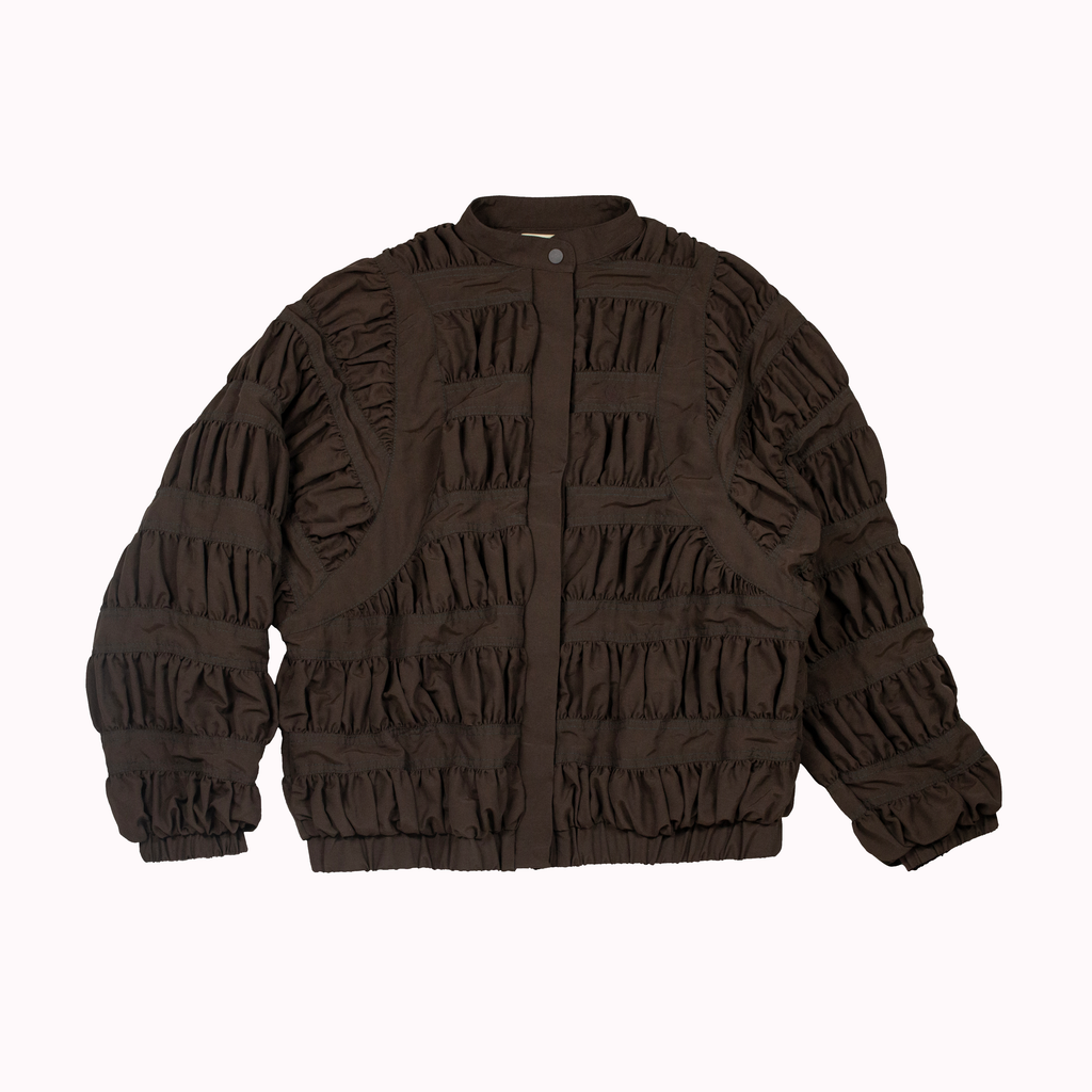 A special ruched jacket with contrast stitch, available in midnight and carob. tonal embroidery, snaps and zipper enclosure to keep it sporty <3. Stay warm, stay dry while watching the waves.