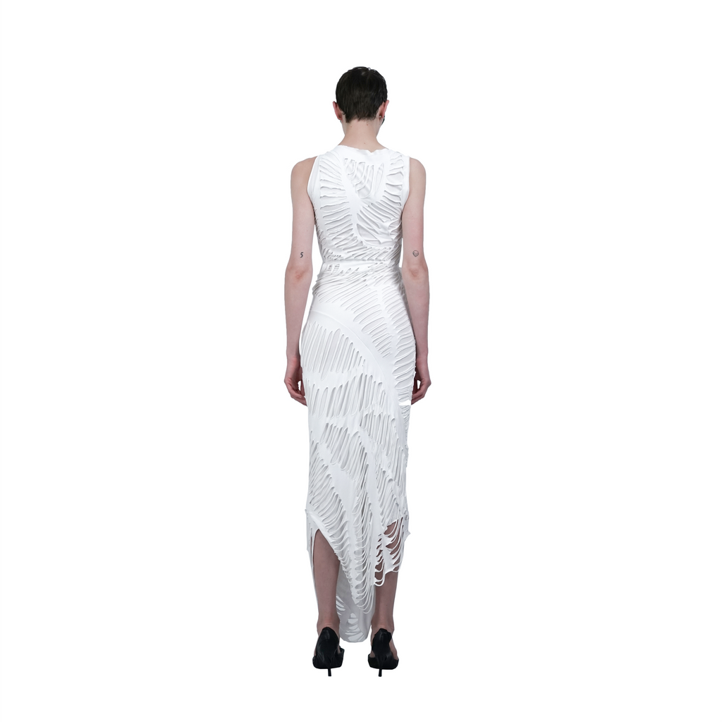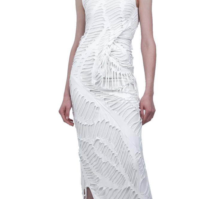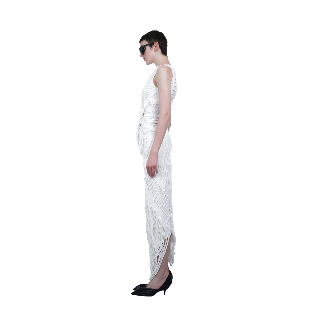The elegant circular viscose jersey dress, skillfully designed with a flattering draped and fitted style. This garment features a unique double-layered cut jersey on top, providing a visually engaging interplay of dimension and texture.