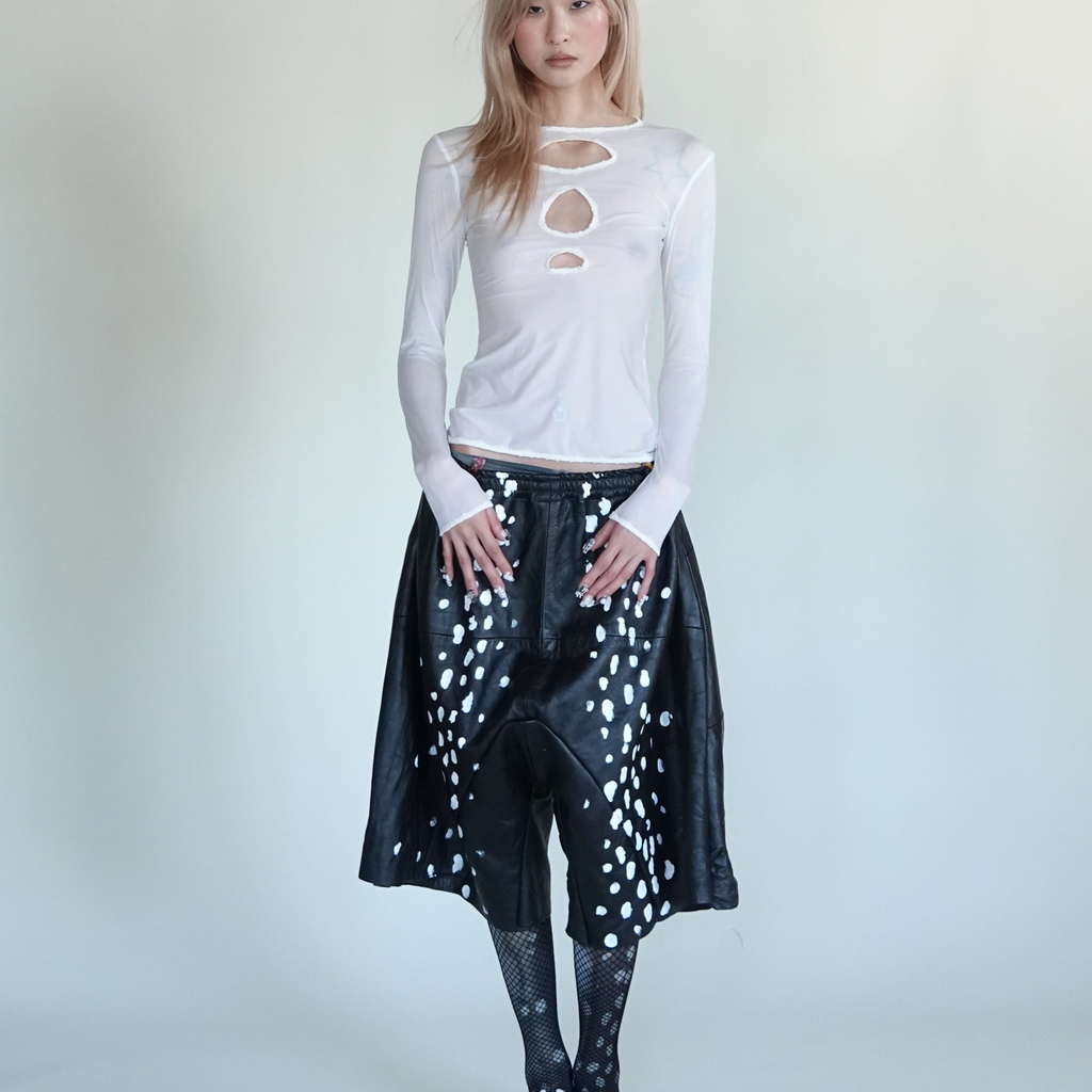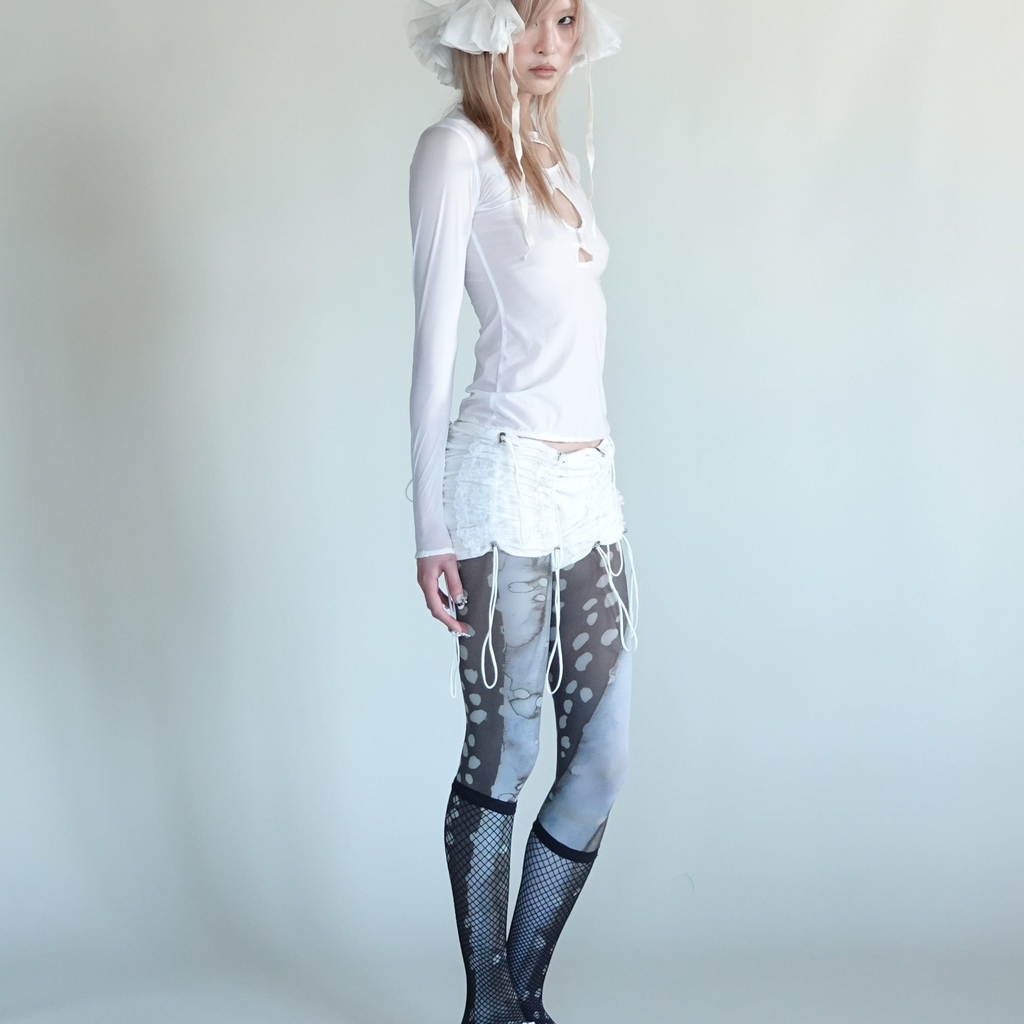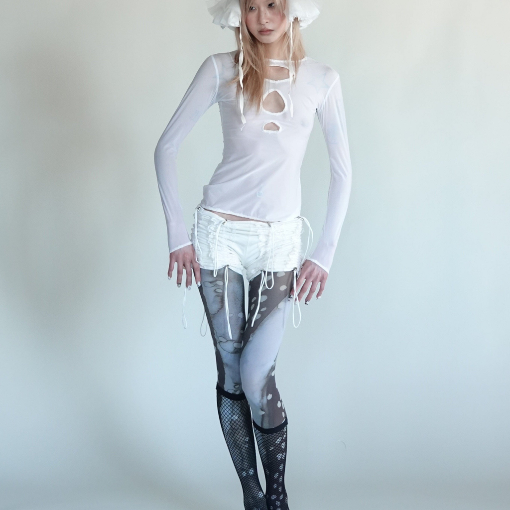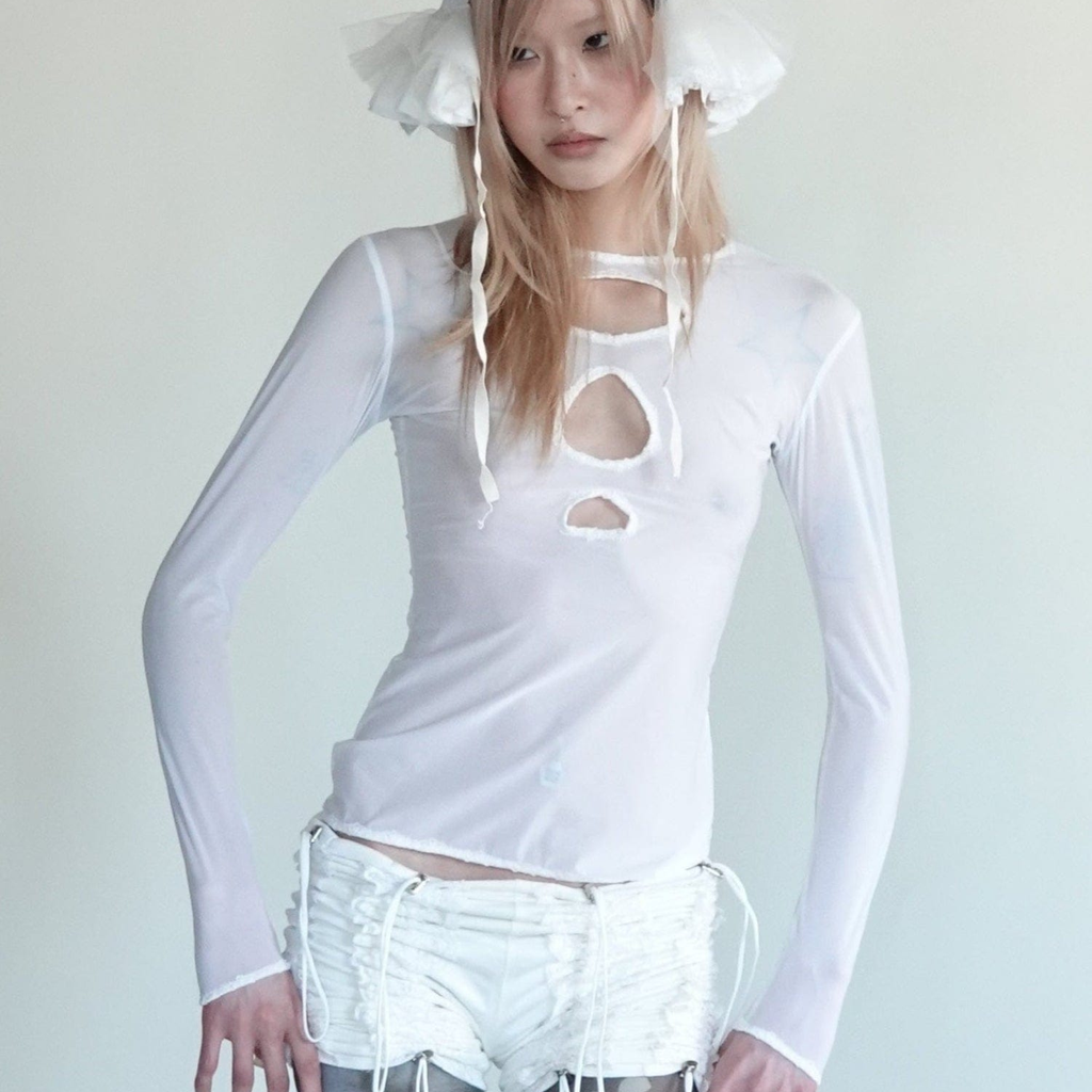 MEW FW25 cutout long sleeve top with lace trim// BAMBI long sleeve top with cutouts on the chest, stretchy lycra will adjust to your figure